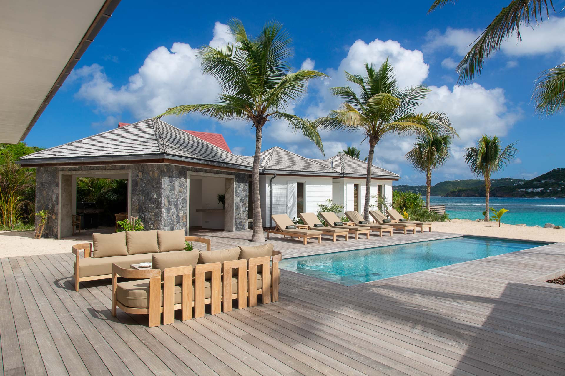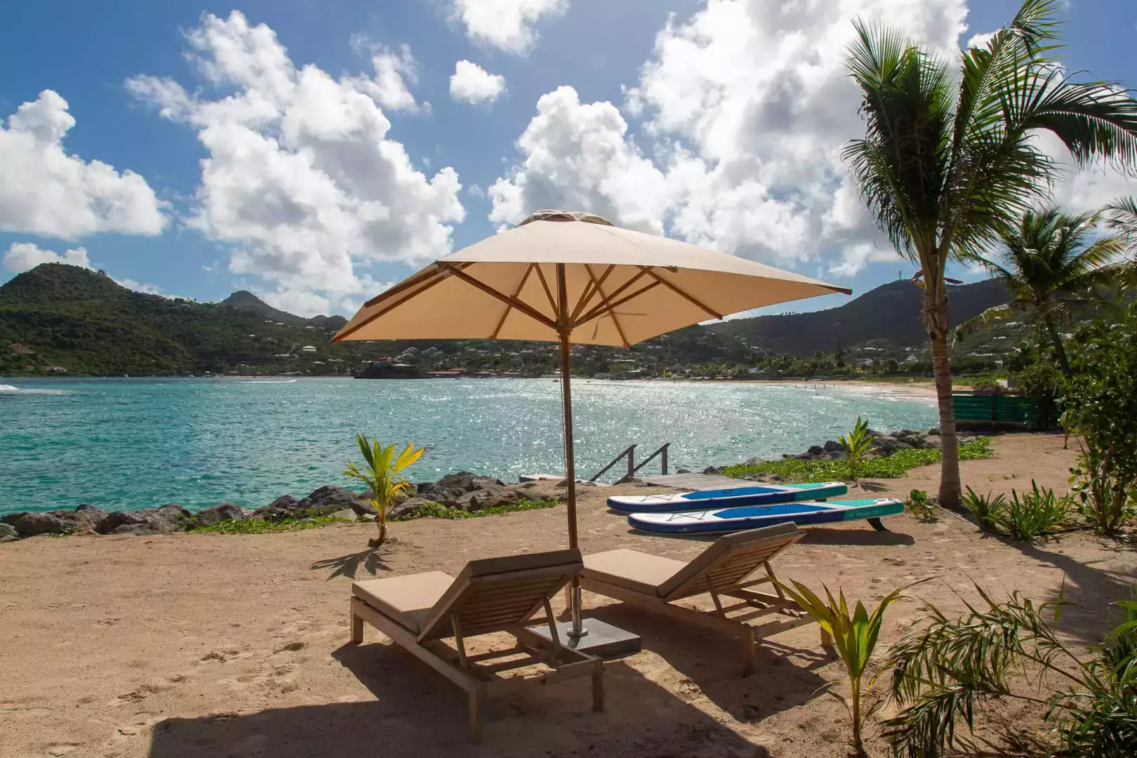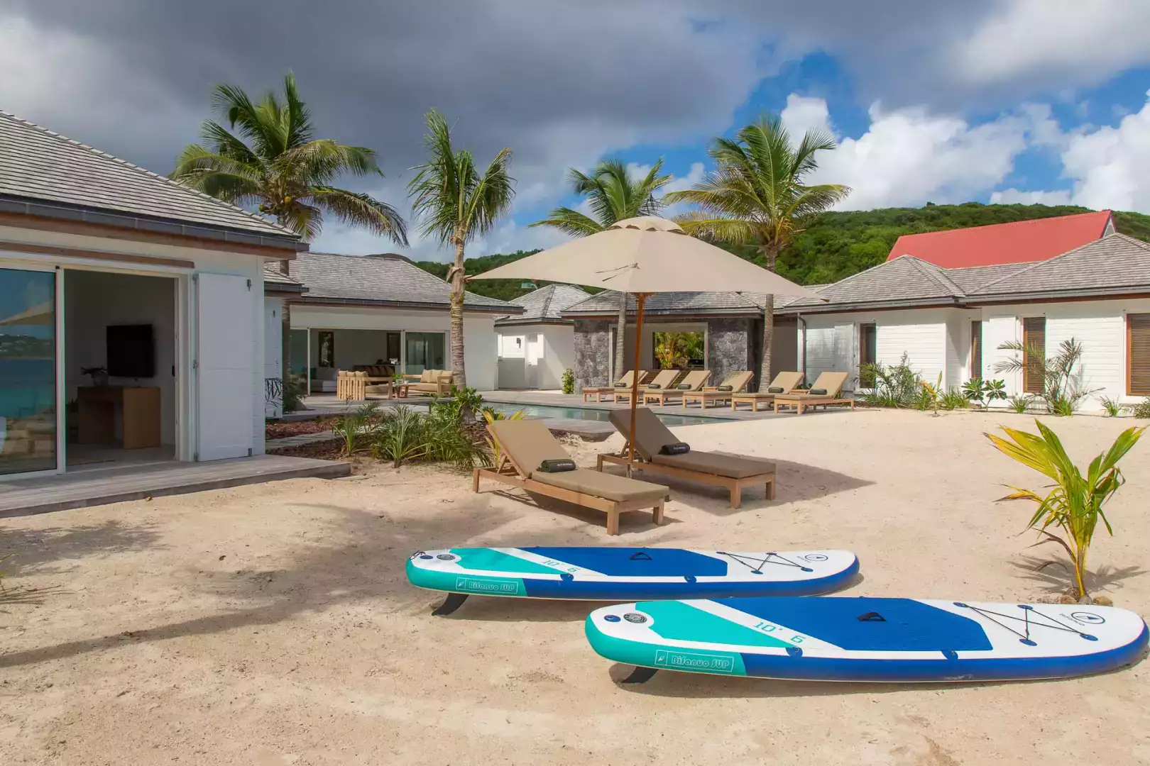 Outside, the property offers two swimming pools facing the ocean, several lounging areas, outdoor dining spaces with BBQ, and water equipment such as paddle boards. A private dock provides direct access to the sea, allowing guests to enjoy the crystal-clear waters at any time of day. With its prime location in St Jean and complete amenities, this villa combination is the perfect choice for a comfortable and memorable stay in St Barts.
