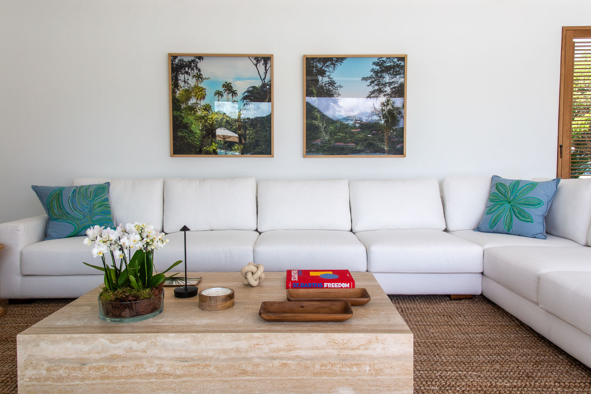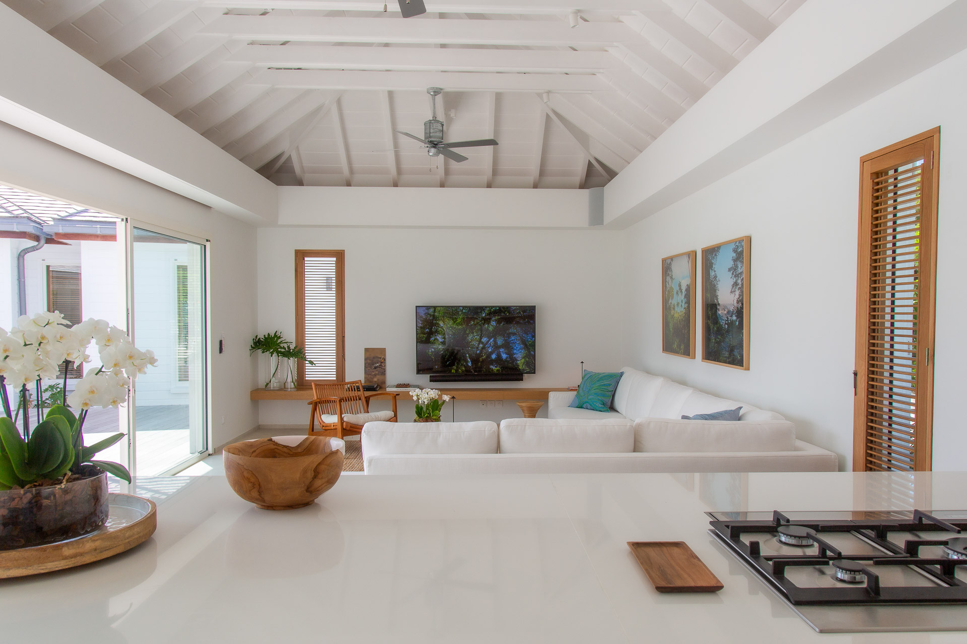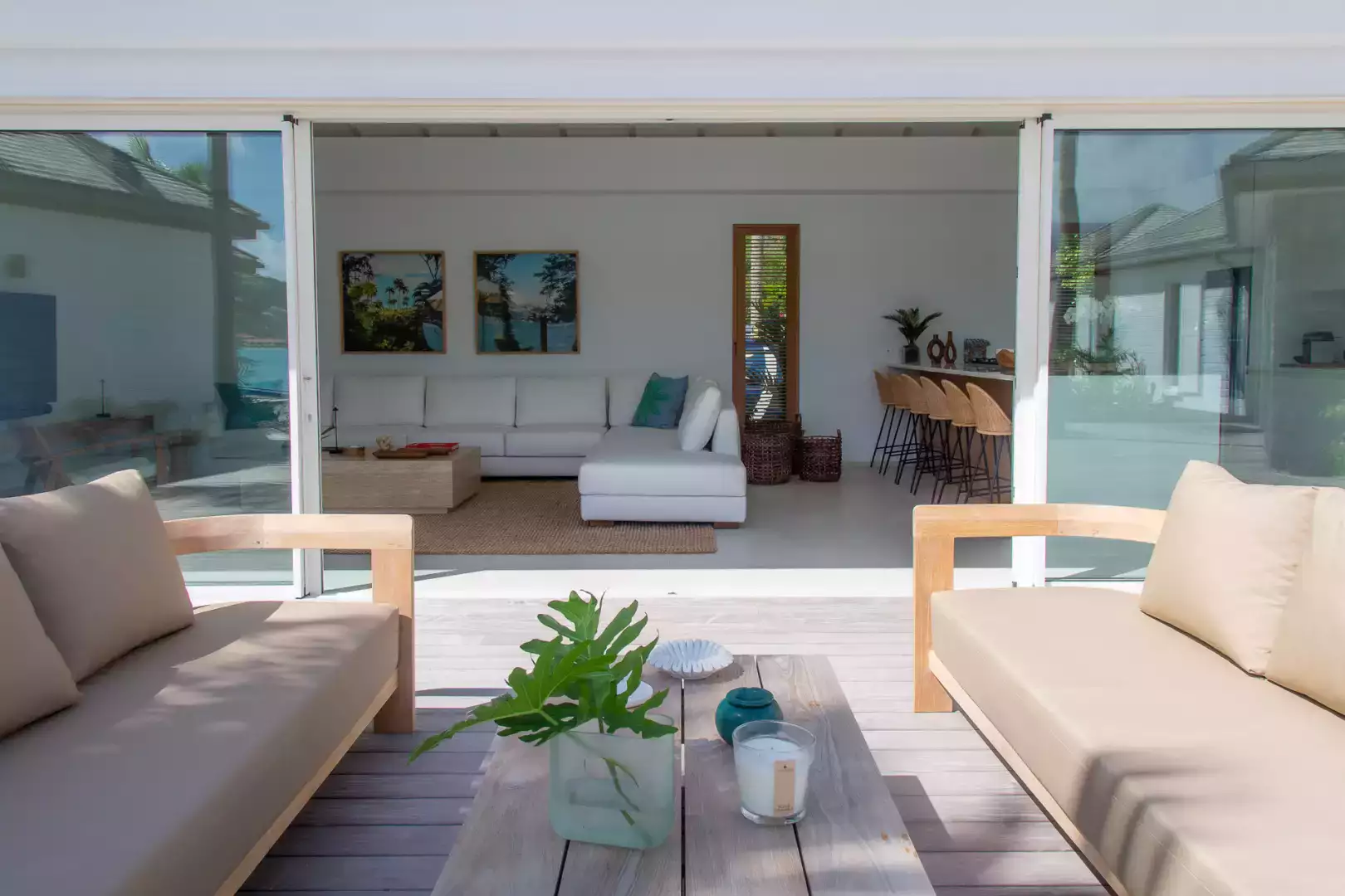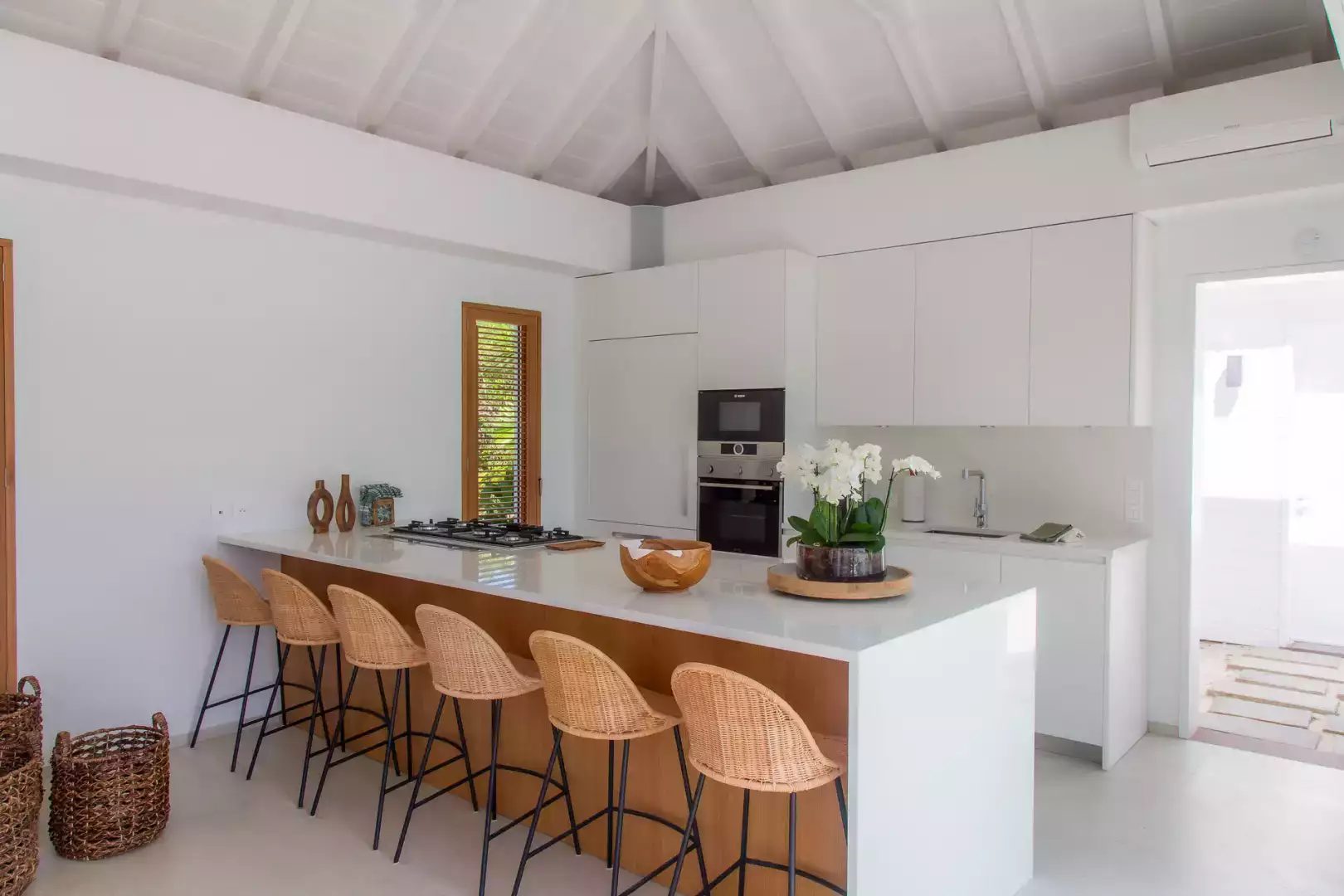 Both villas feature bright living areas that open onto the outdoors. The comfortable lounges, equipped with Sonos sound systems and TVs, connect seamlessly with fully equipped modern kitchens, creating a relaxed and welcoming atmosphere perfect for spending time together.