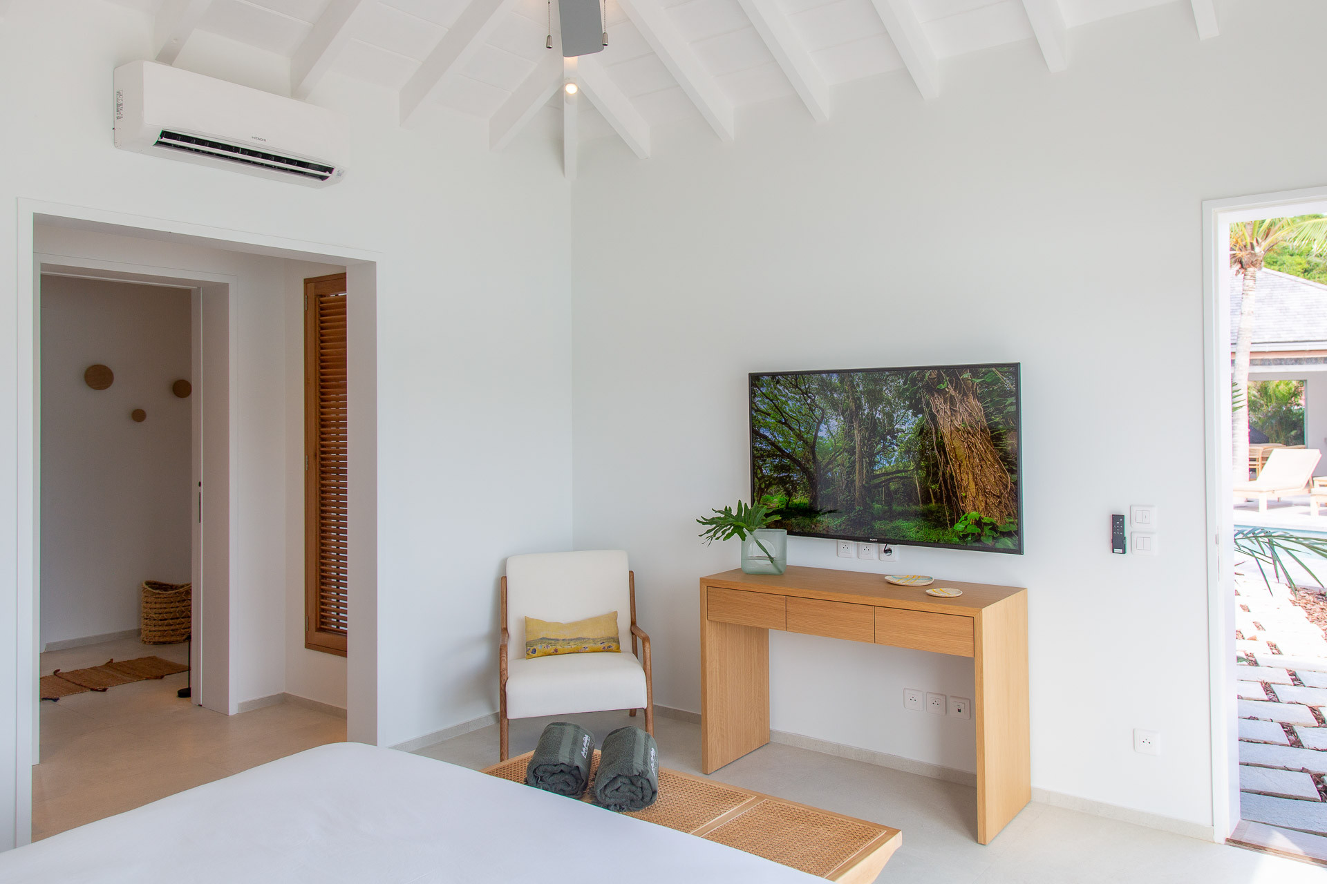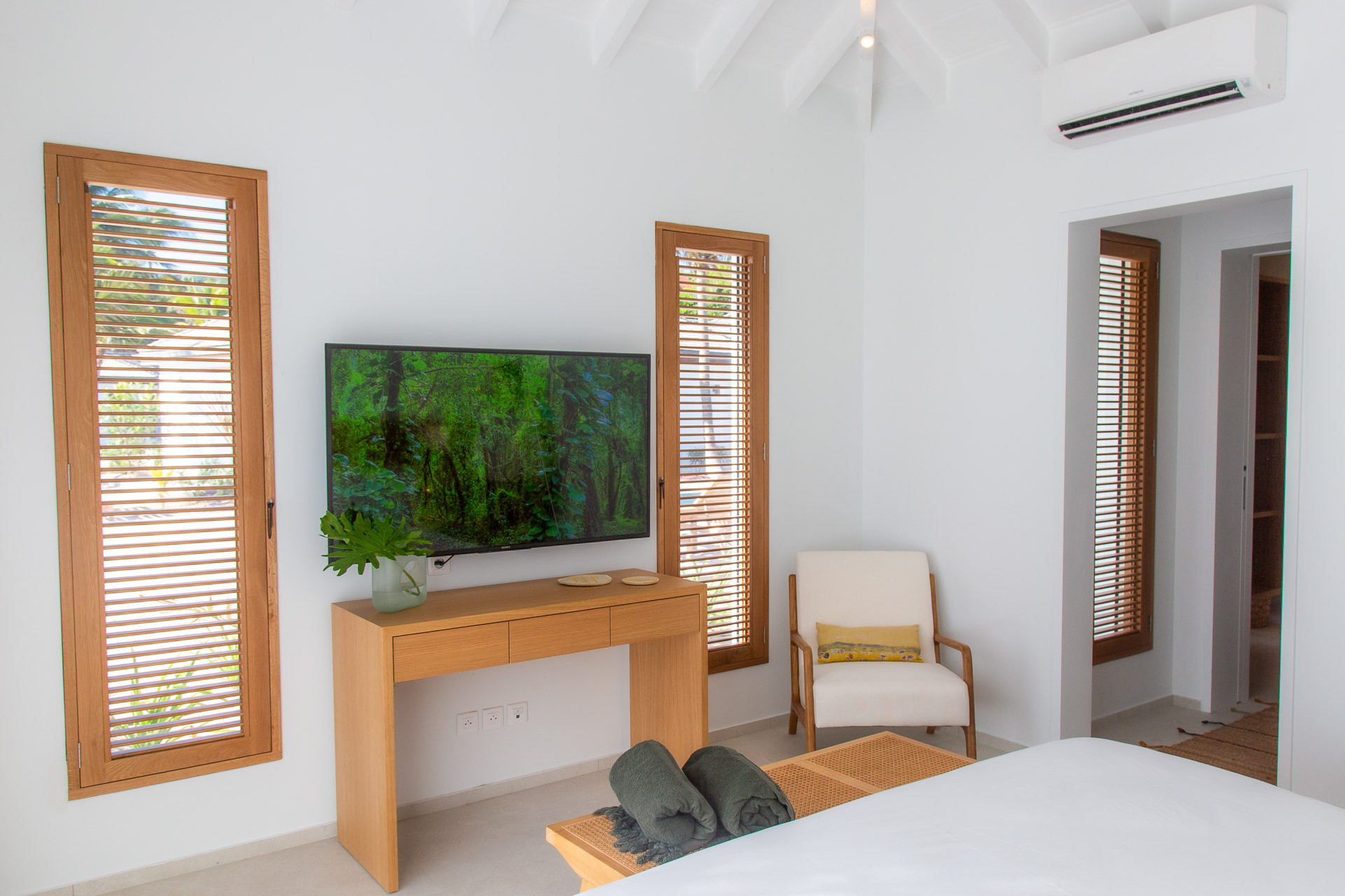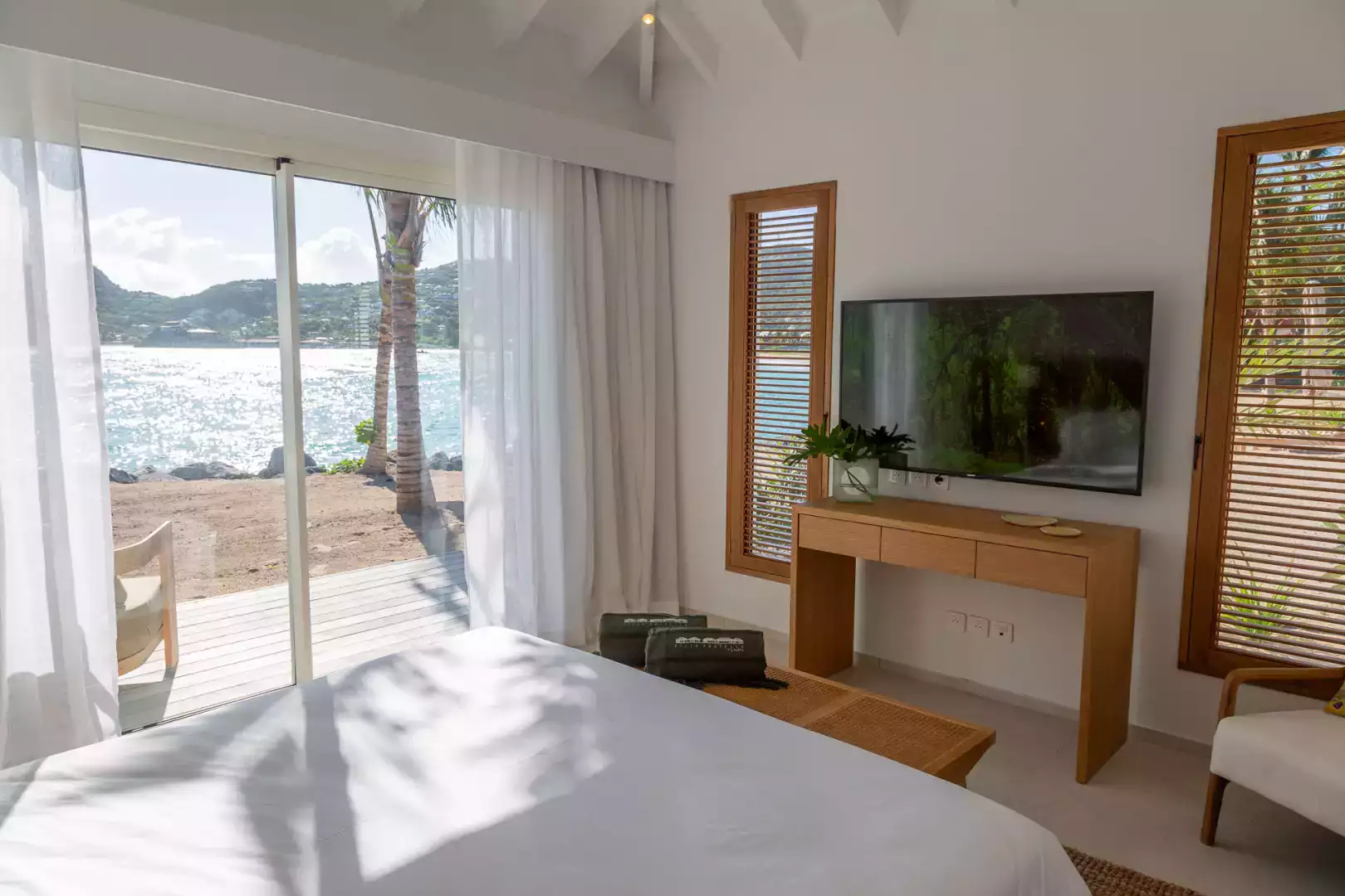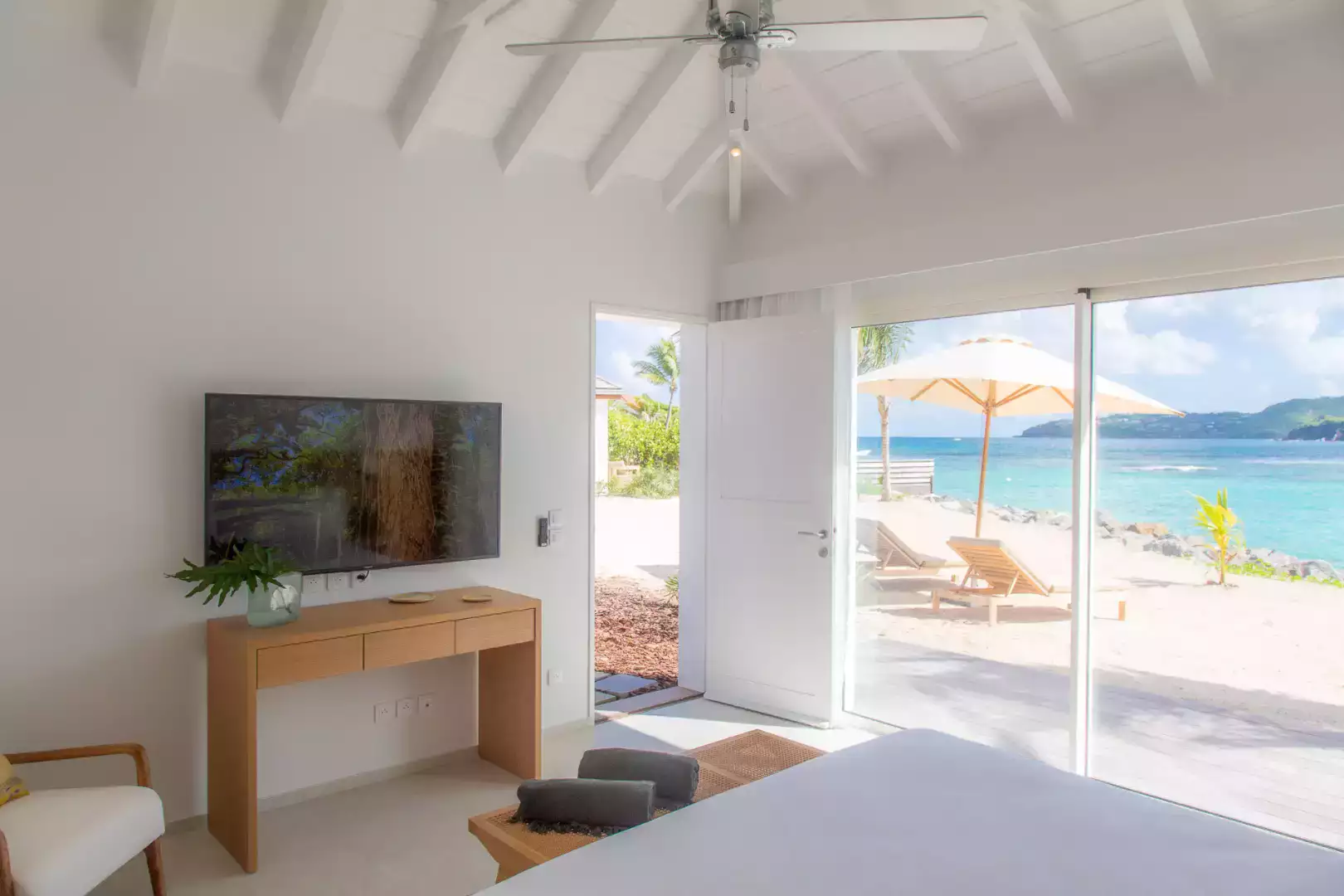 All four bedrooms enjoy ocean views and a high level of comfort. The master bedroom in Castelle features a private terrace and an outdoor shower, while bedrooms 2 and 3 are connecting, making them ideal for families. The bedroom in Ti Castelle offers a more private setting, perfect for a couple or guests seeking additional privacy. Each bedroom is air-conditioned and includes its own en-suite bathroom.