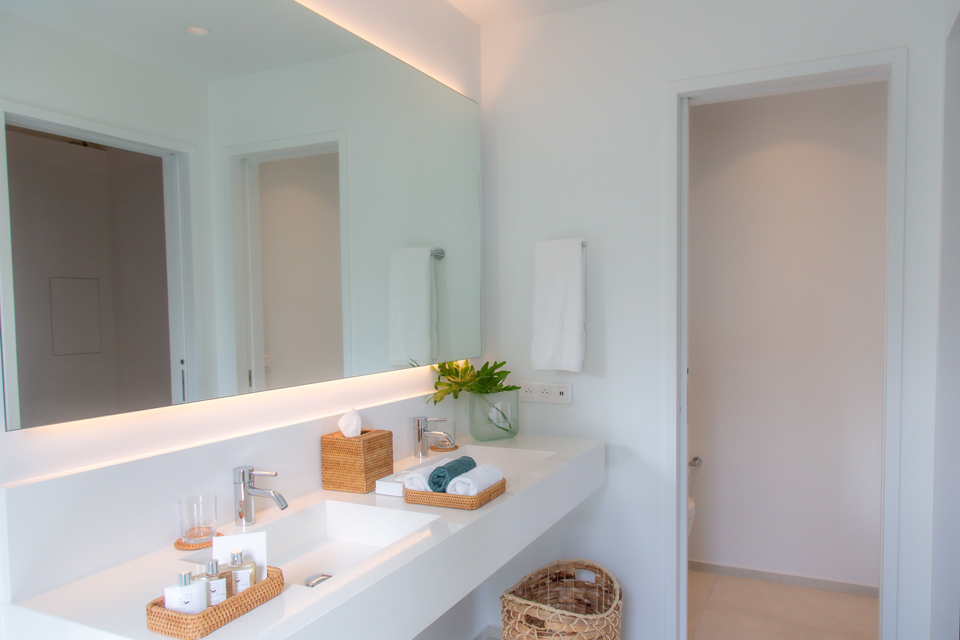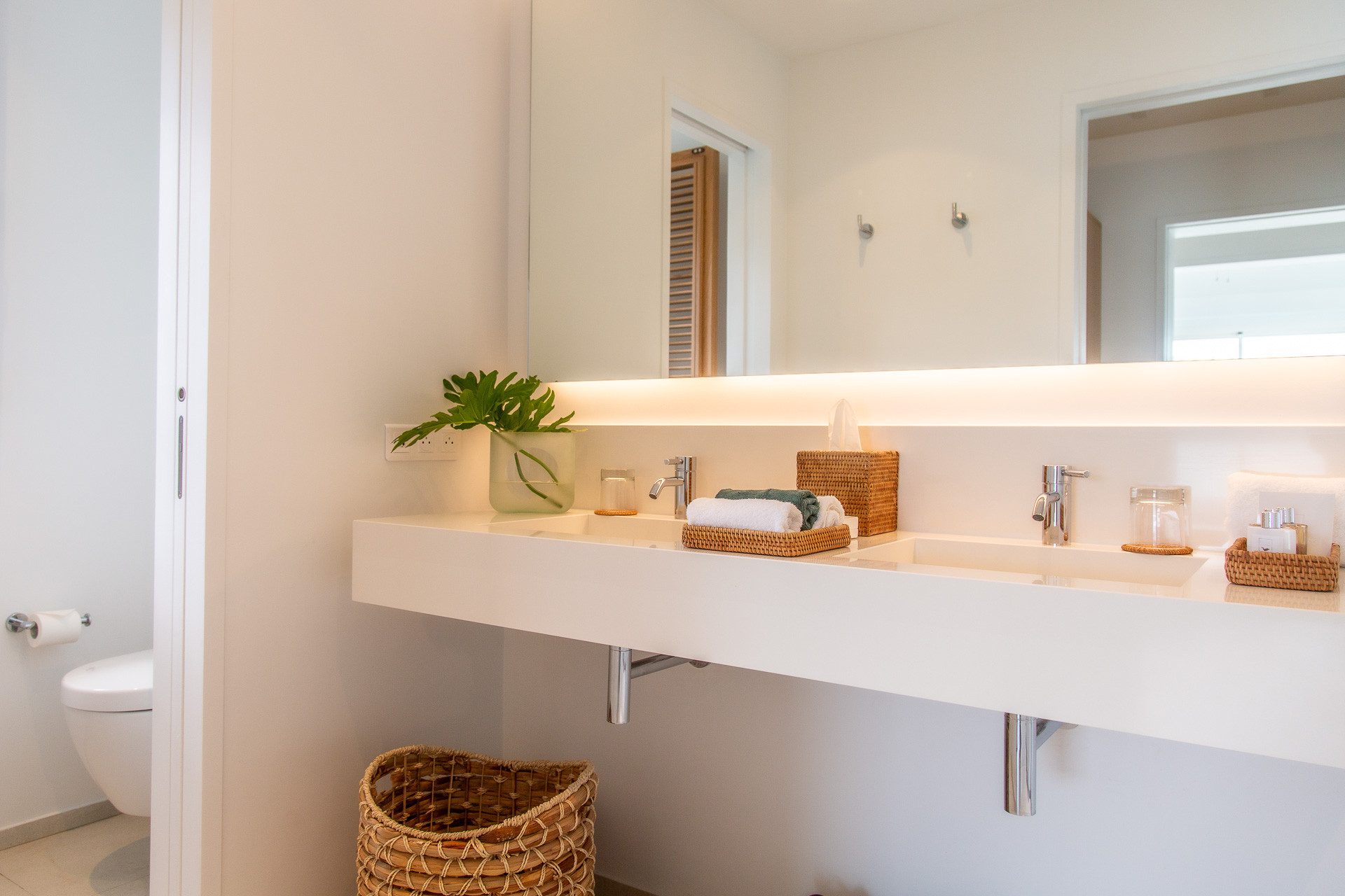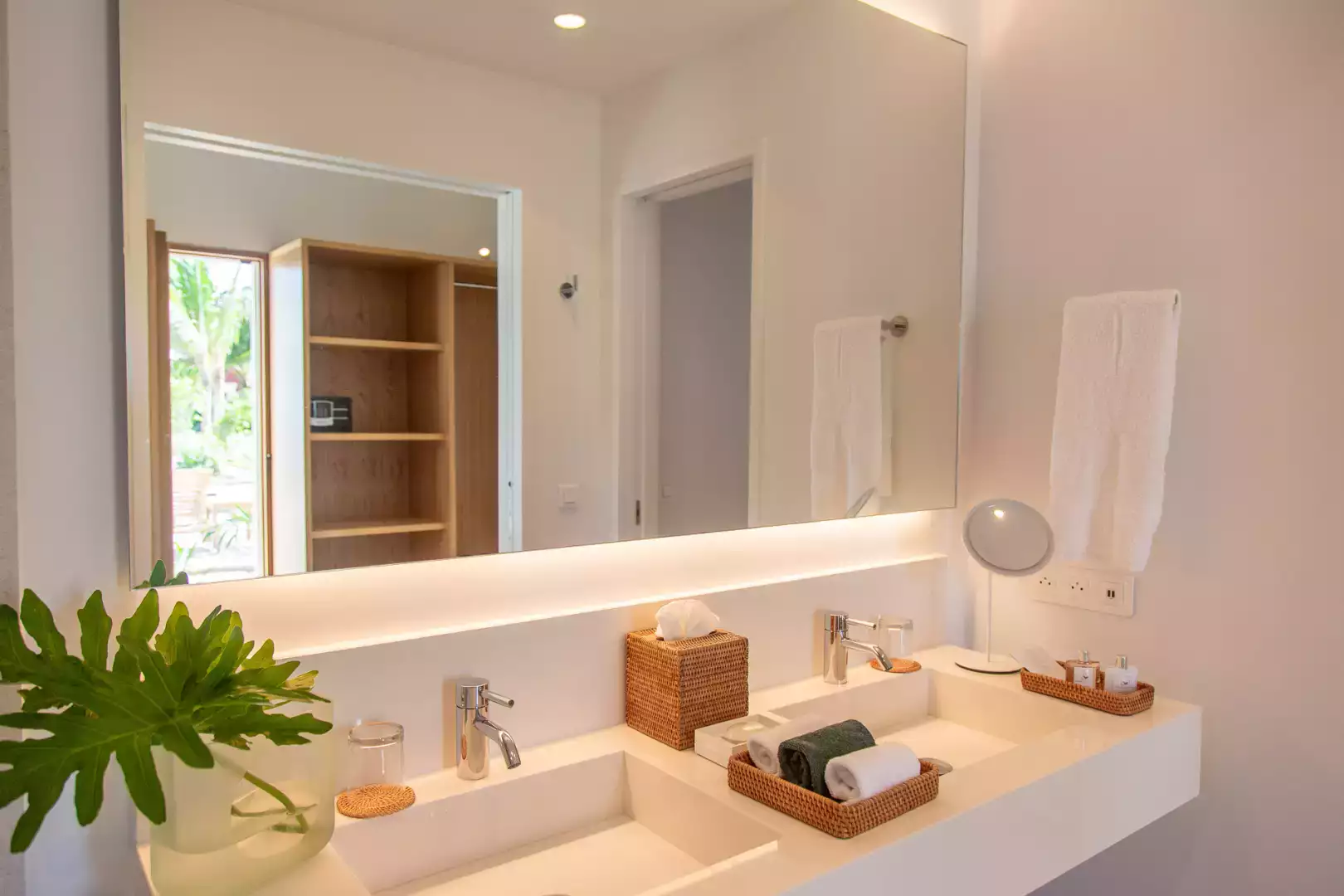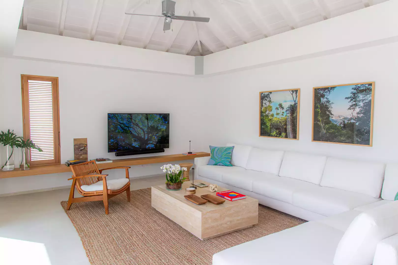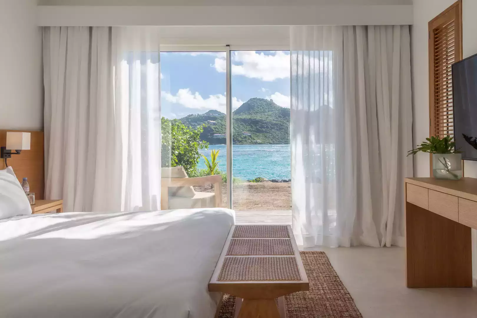 All four bedrooms enjoy ocean views and a high level of comfort. The master bedroom in Castelle features a private terrace and an outdoor shower, while bedrooms 2 and 3 are connecting, making them ideal for families. The bedroom in Ti Castelle offers a more private setting, perfect for a couple or guests seeking additional privacy. Each bedroom is air-conditioned and includes its own en-suite bathroom.