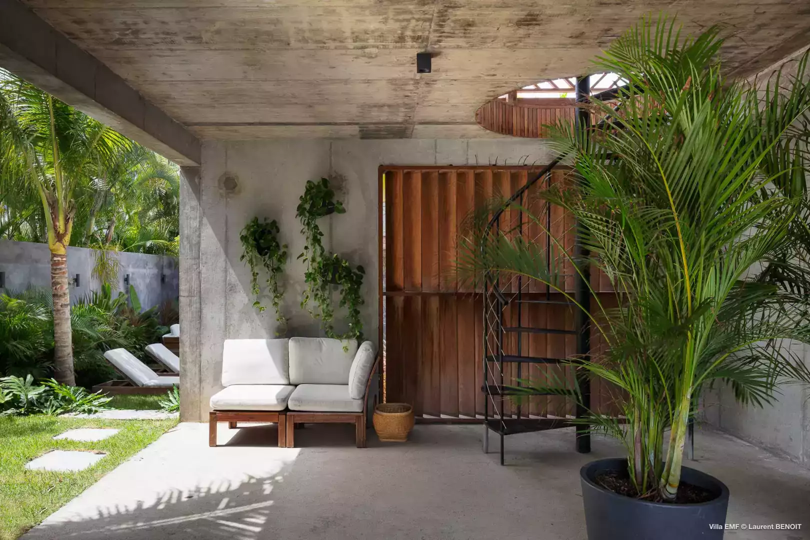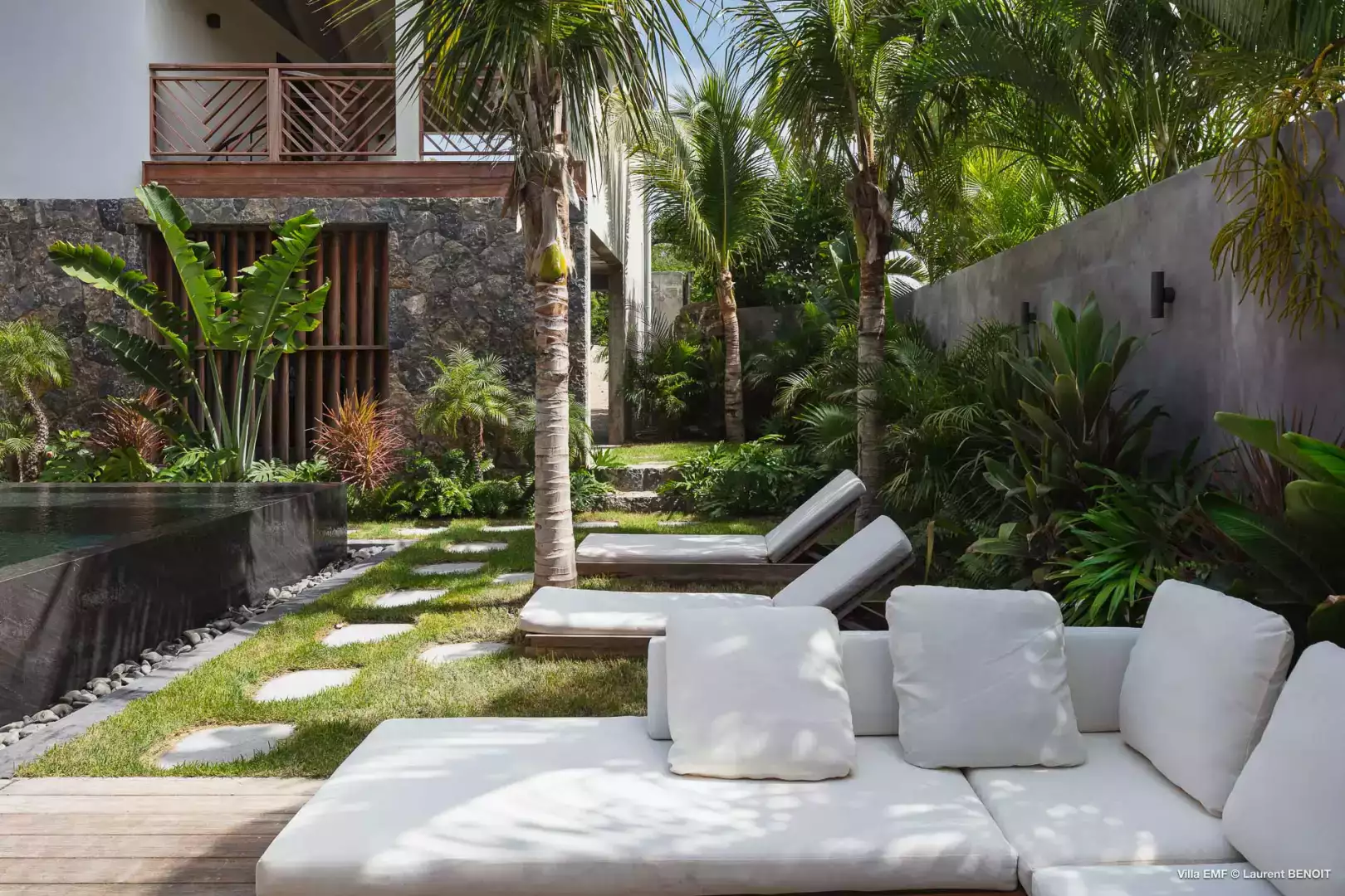 Two bedrooms are located on the first floor of the main house, each with a private terrace and cozy outdoor lounge, perfect for quiet moments. The third bedroom is set in a separate bungalow across the garden, offering full privacy with its own terrace and seating area.