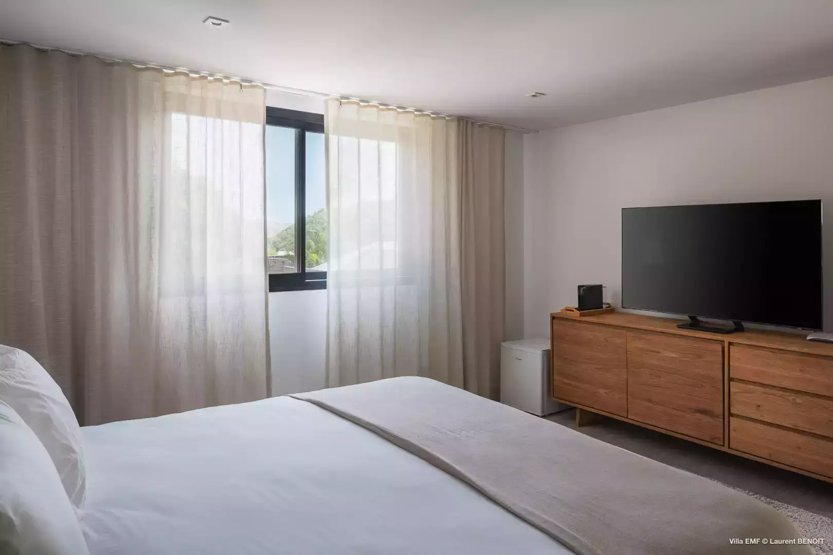 A 10-meter private pool surrounded by sun loungers completes this serene setting. Just a short drive from Flamands Beach, this villa is ideal for stylish holidays in St Barts, whether with friends or family.