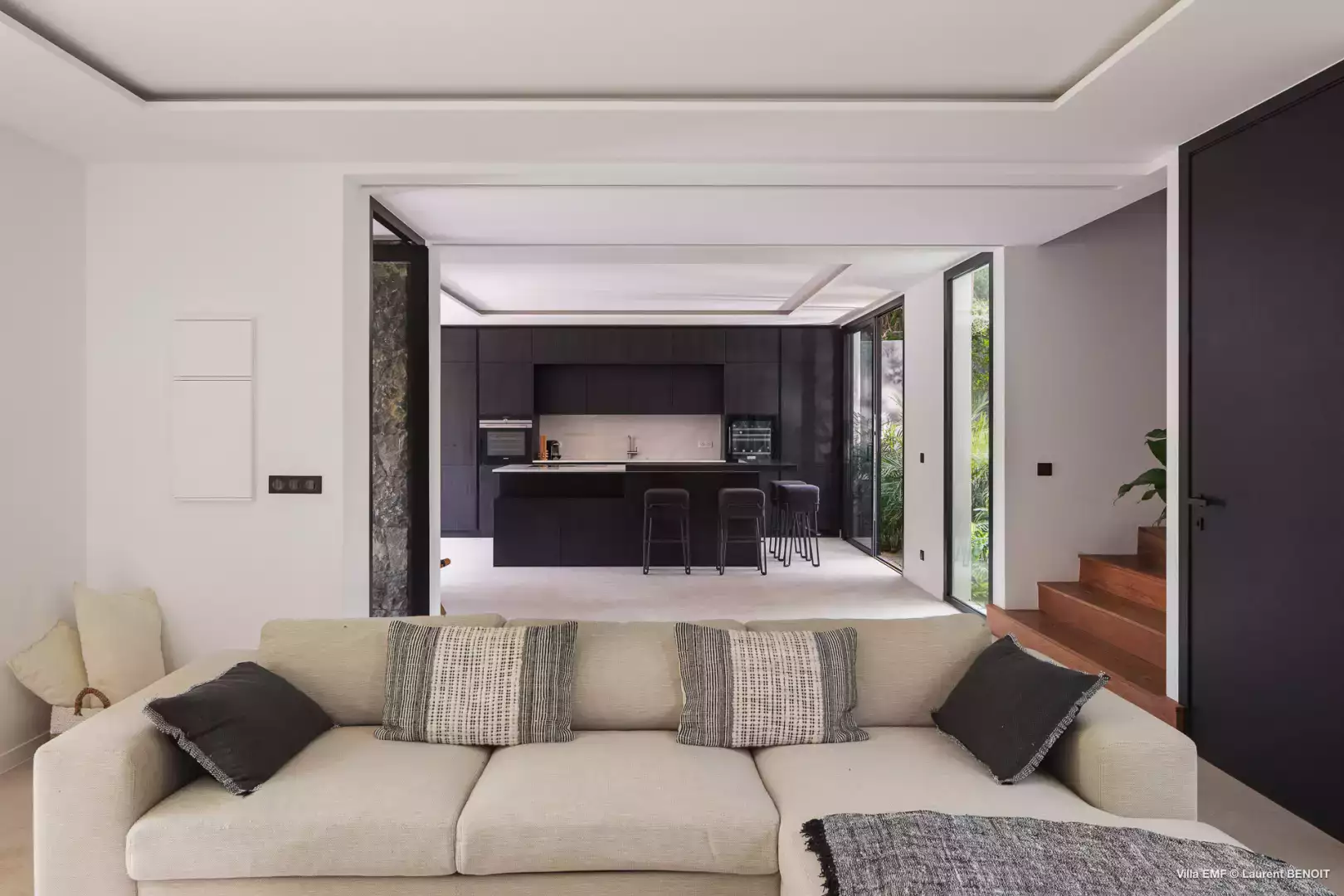 The living area is bright and inviting, opening entirely to the outdoors and blending seamlessly with the lush garden. The minimalist, fully equipped kitchen opens onto the terrace, where guests can enjoy meals around the table or by the BBQ.
