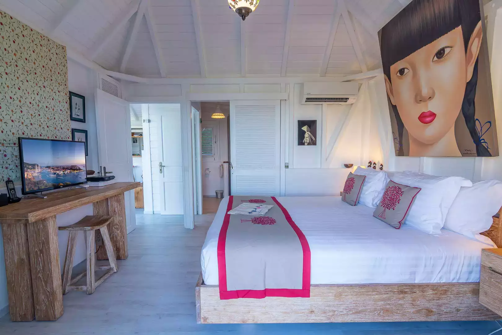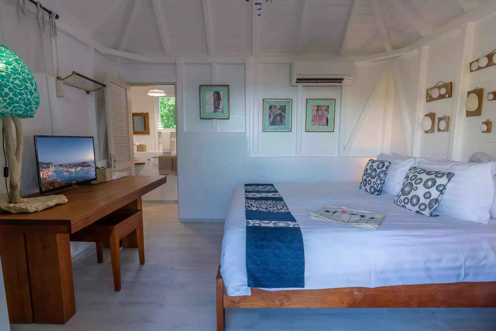 Located on the main level, king size bed (200 cm), A/C, TV (with French satellite + 2 US channels), safe, hairdryer, bathroom with shower and toilets, sea view