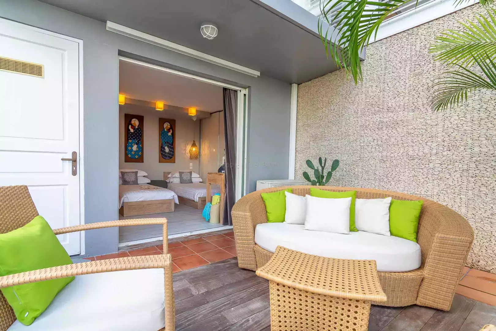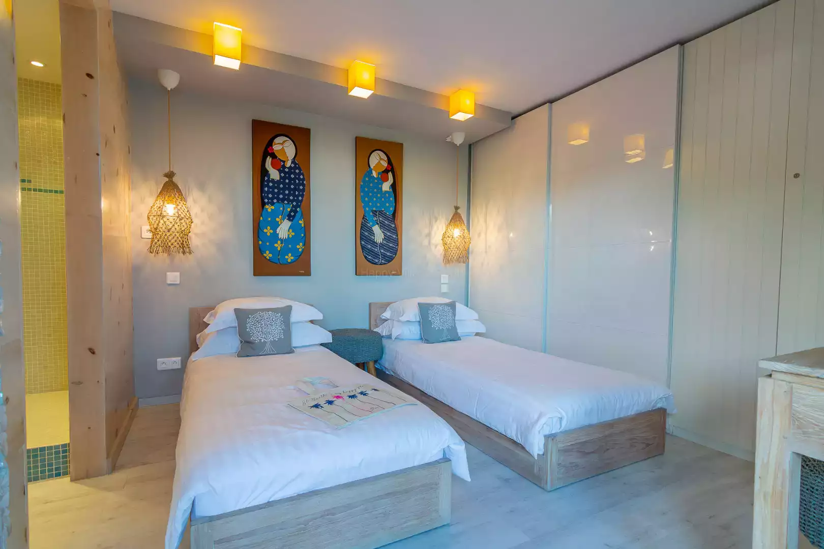 Located at the level of the pool (lower level), king size bed (200 cm) that can be separated into two single beds, A/C, TV (with Apple TV), safe, hairdryer, bathroom with shower and toilets, Nespresso coffee machine, private terrace
