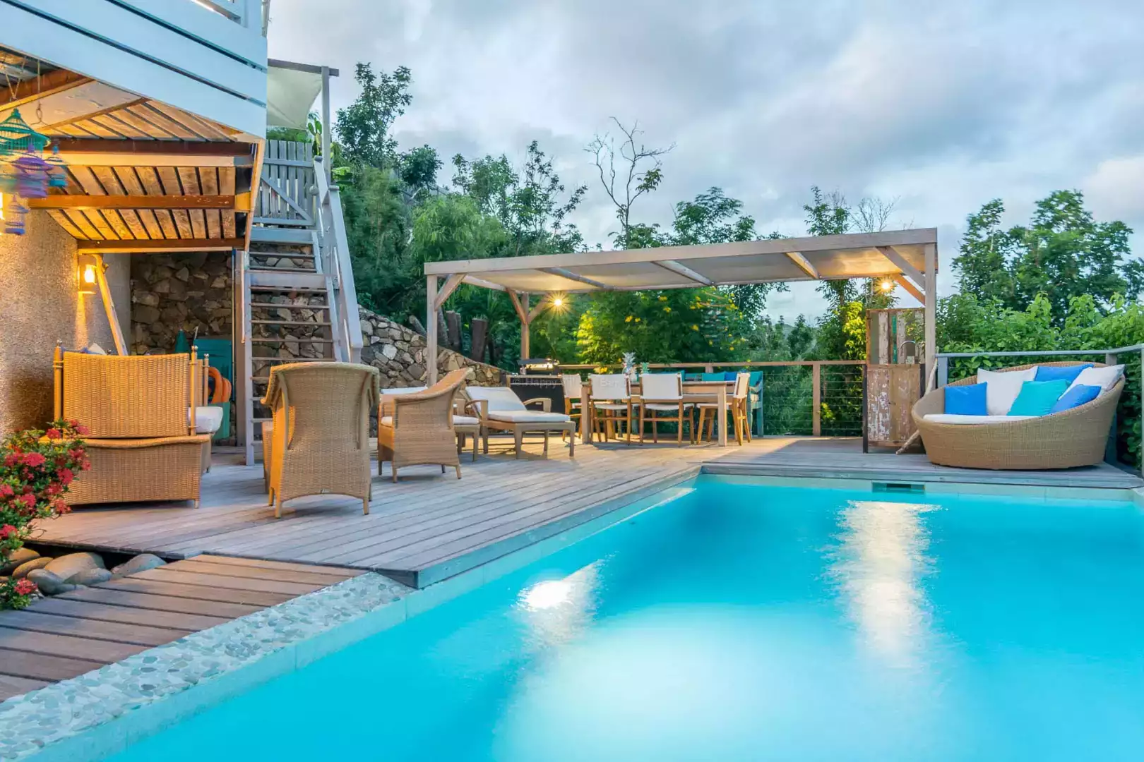 The pool itself is surrounded by a large wooden terrace, making it the perfect spot for sunbathing and relaxing over the beautiful ocean view. Next to the pool is the very convenient pool house with a sink, fridge and another plancha grill.