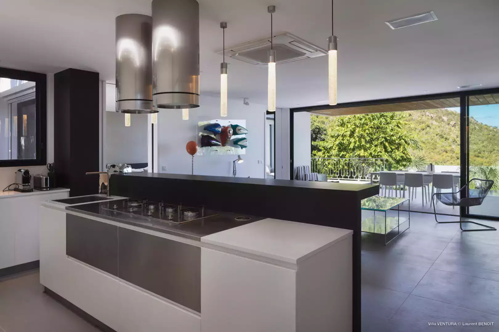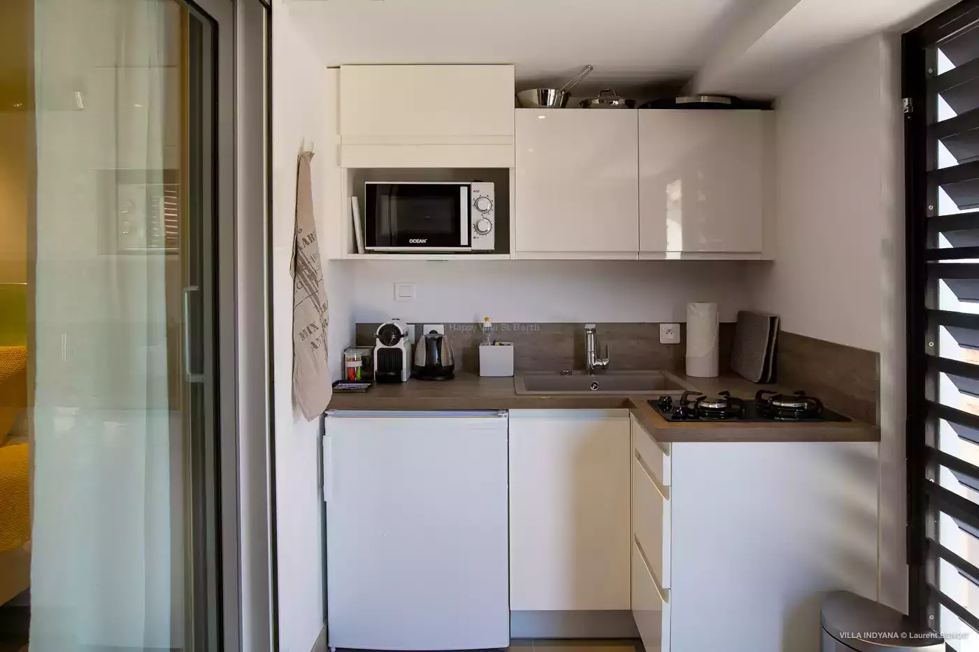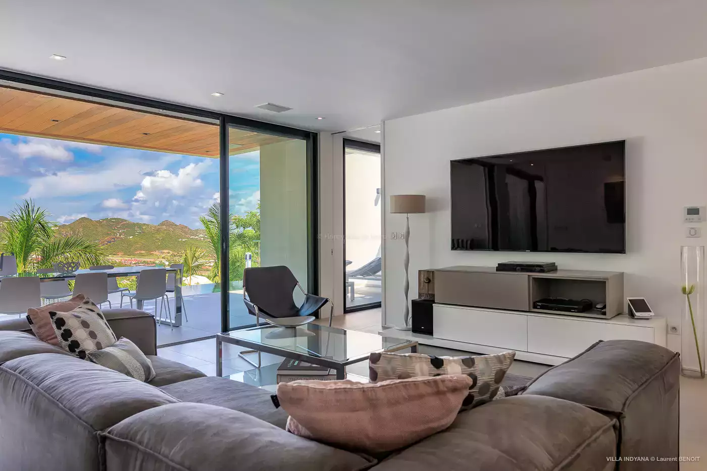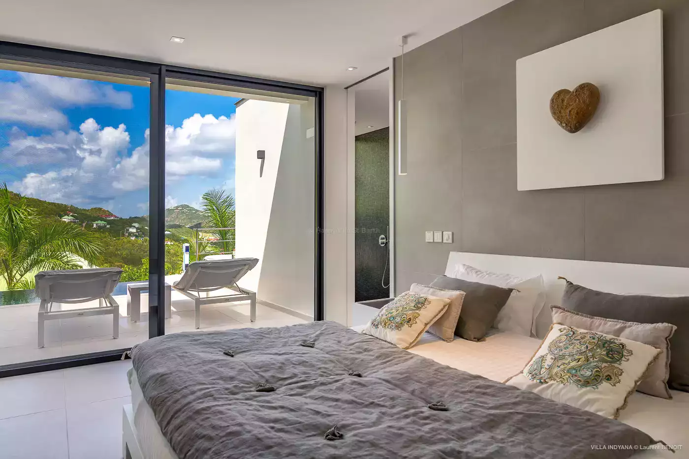 Each bedroom features a king-size bed, open hillside views, air-conditioning, ensuite bathrooms, and complete entertainment systems. One of the bedrooms is located in a separate studio with its own kitchenette, ideal for extra privacy. The open-plan kitchen connects effortlessly to the dining area, making it easy to enjoy meals al fresco. The living room, equipped with satellite TV and a sound system, is perfect for relaxing in a cool, welcoming ambiance. Just a short drive from Saint-Jean beach and Gustavia’s restaurants and shops, Indyana Estate is a modern, peaceful retreat at the heart of St Barts.