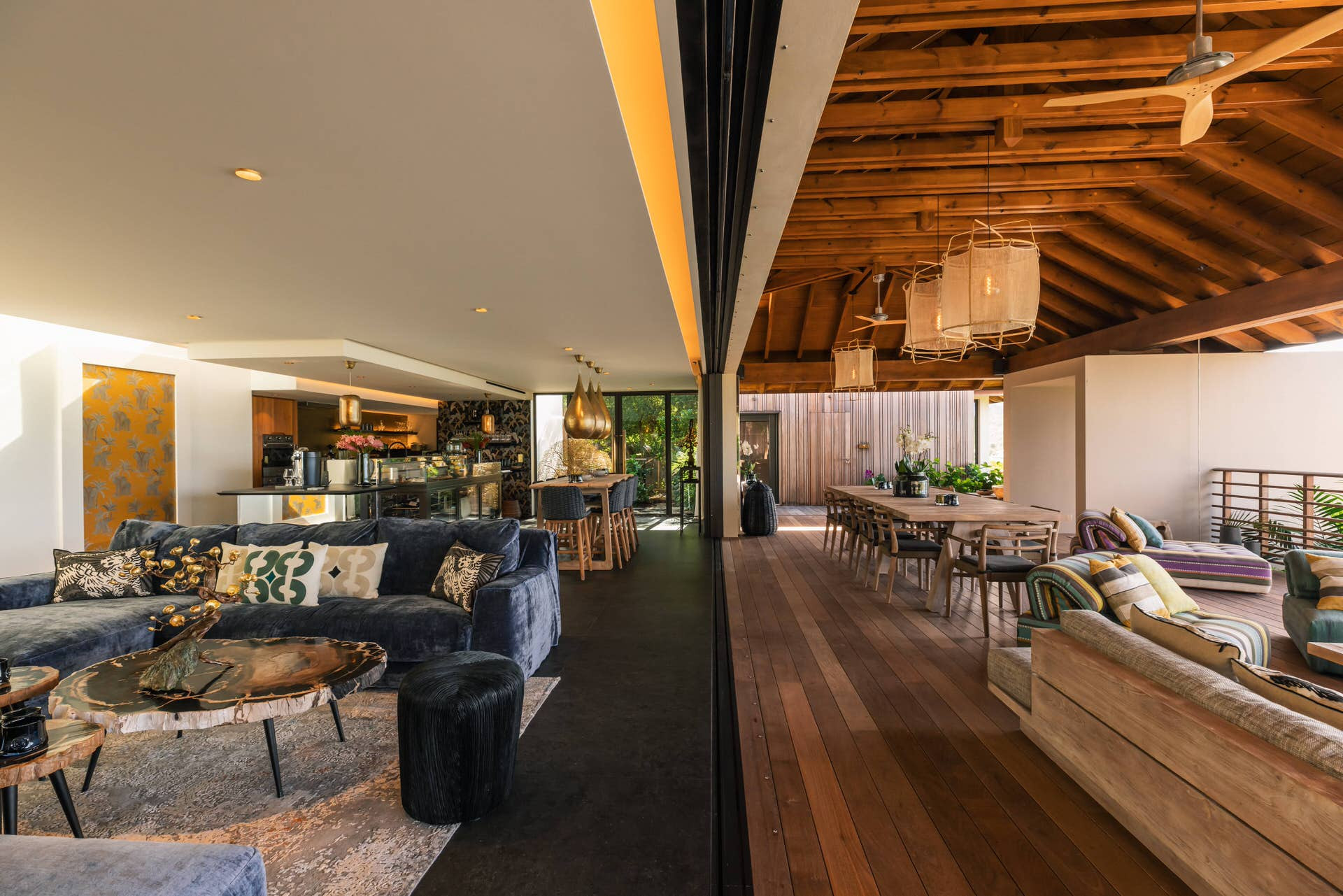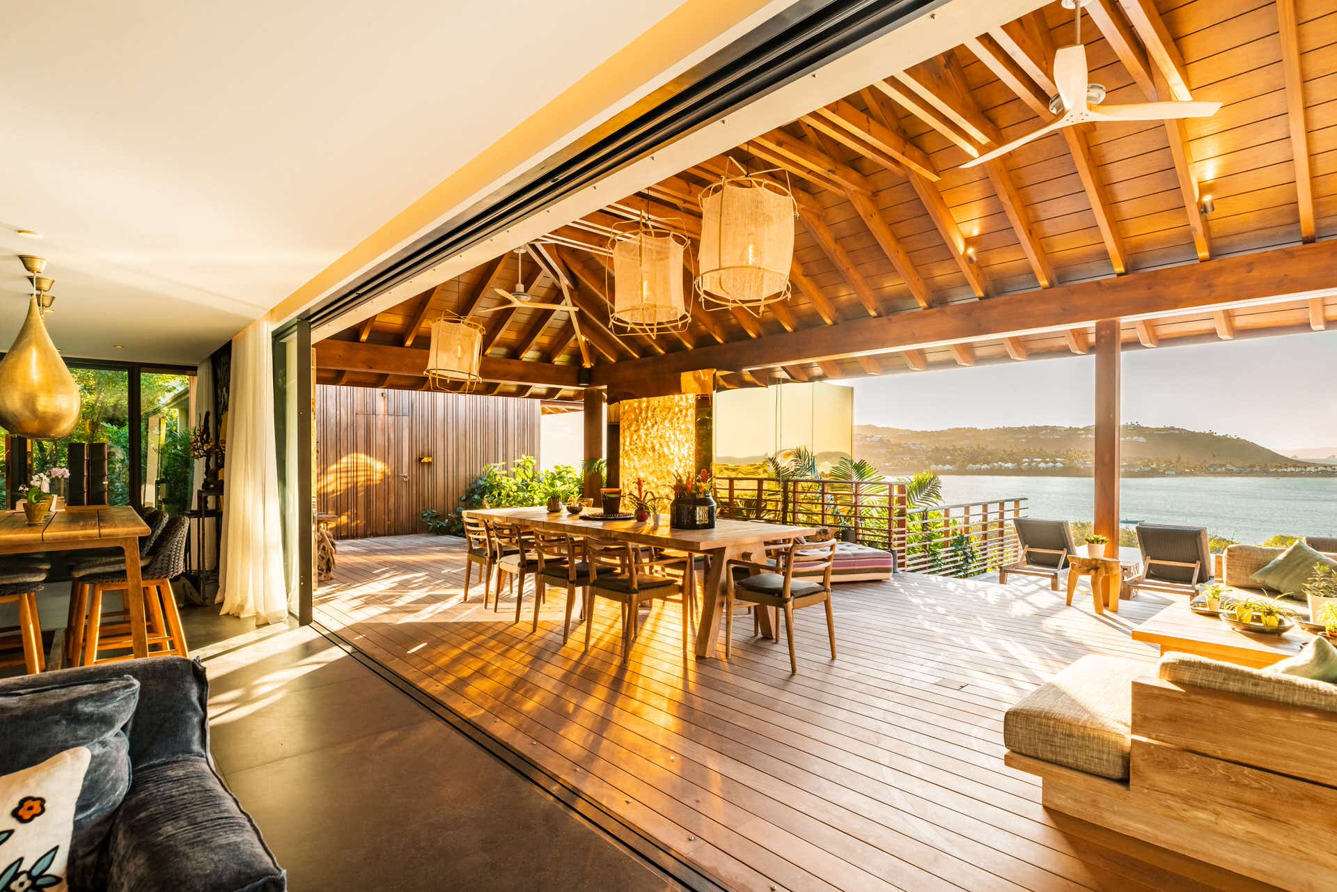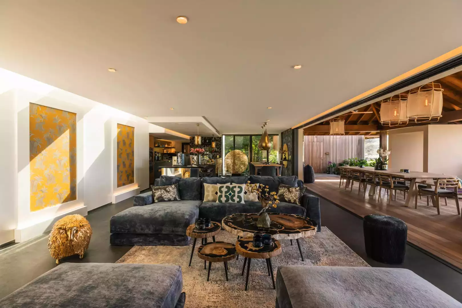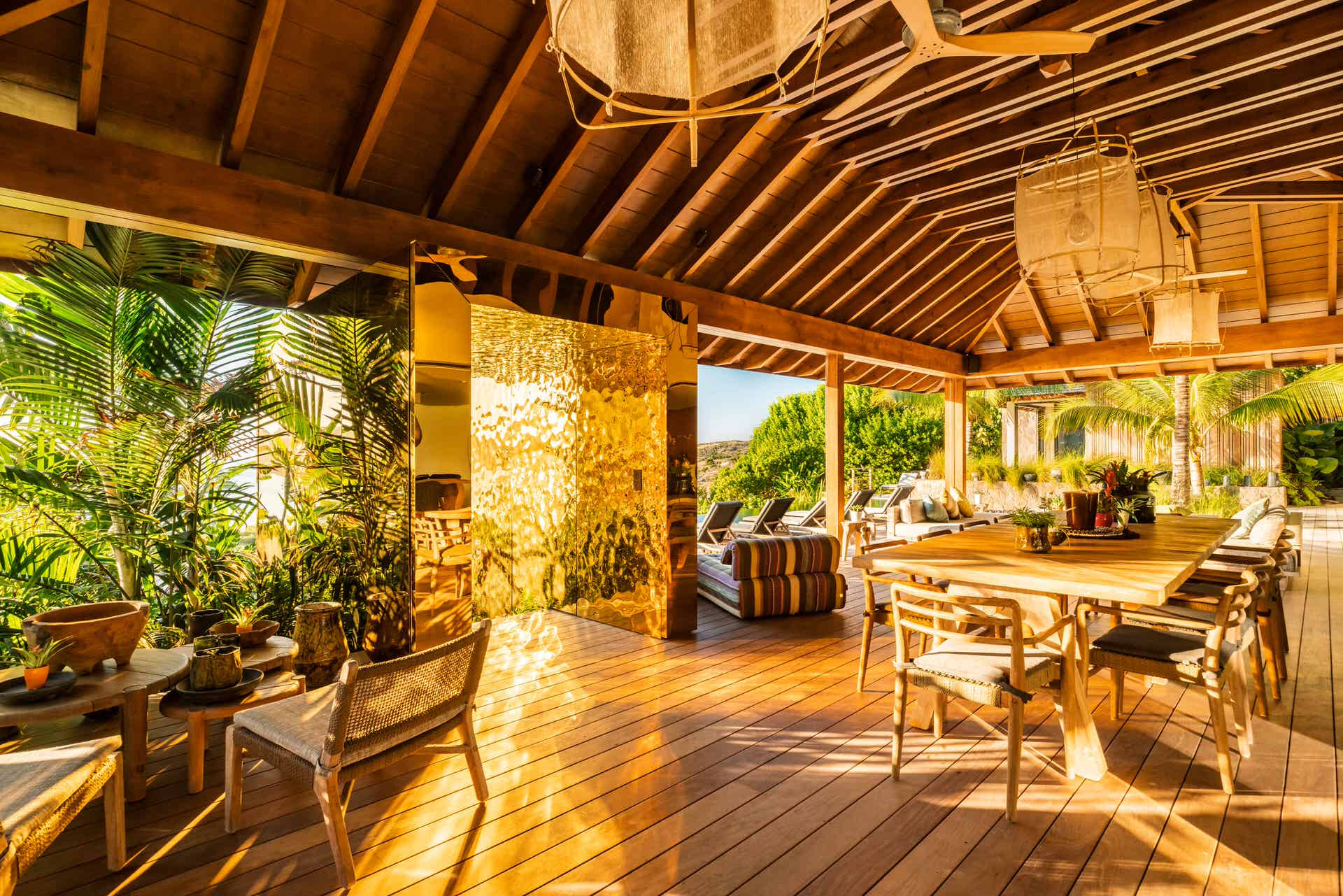 Set above the turquoise lagoon of Grand Cul de Sac, Villa Larimar is a beautifully curated retreat where modern elegance blends seamlessly with warm, natural Caribbean inspiration. Designed to celebrate both indoor and outdoor living, the villa offers generous volumes, soft lighting, and refined materials that create an immediate sense of comfort. The living room opens onto a large terrace with sweeping ocean views, connecting effortlessly with the expansive outdoor lounge and dining areas. A professional-grade kitchen completes the space, ideal for cooking enthusiasts or private chef dinners, while the spectacular wooden dining pavilion invites long, memorable evenings.