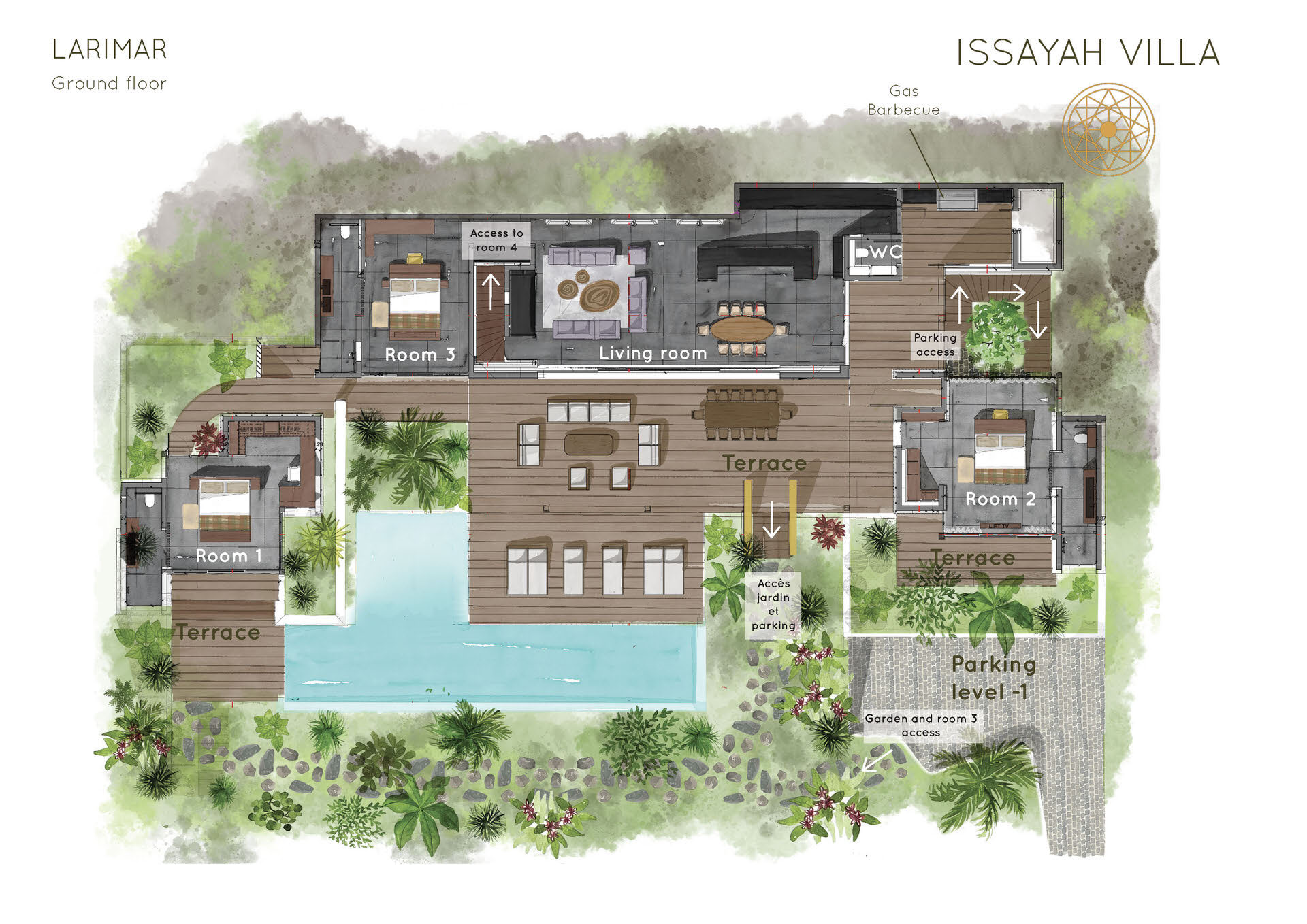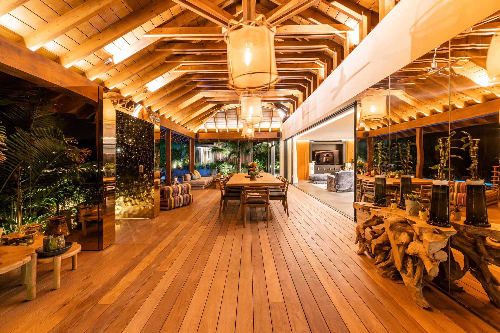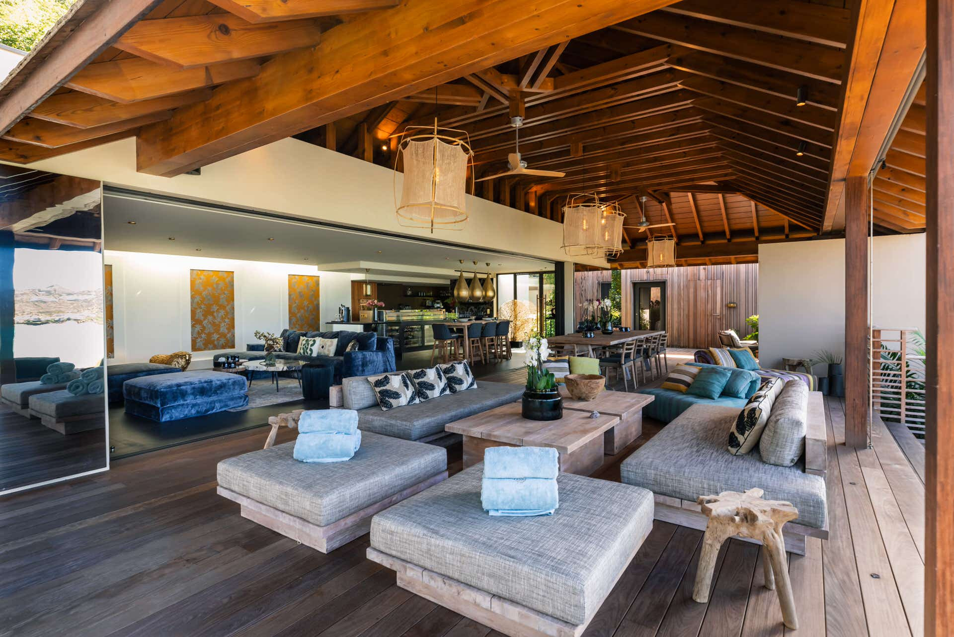Set above the turquoise lagoon of Grand Cul de Sac, Villa Larimar is a beautifully curated retreat where modern elegance blends seamlessly with warm, natural Caribbean inspiration. Designed to celebrate both indoor and outdoor living, the villa offers generous volumes, soft lighting, and refined materials that create an immediate sense of comfort. The living room opens onto a large terrace with sweeping ocean views, connecting effortlessly with the expansive outdoor lounge and dining areas. A professional-grade kitchen completes the space, ideal for cooking enthusiasts or private chef dinners, while the spectacular wooden dining pavilion invites long, memorable evenings.