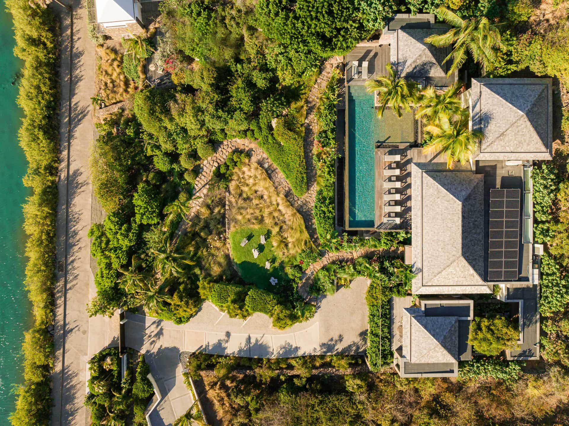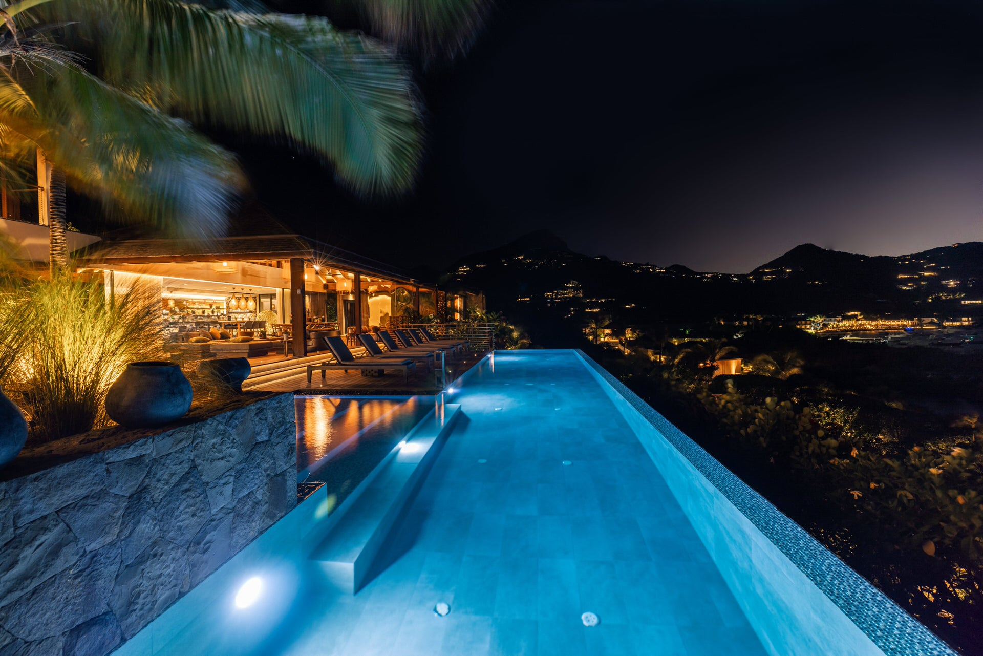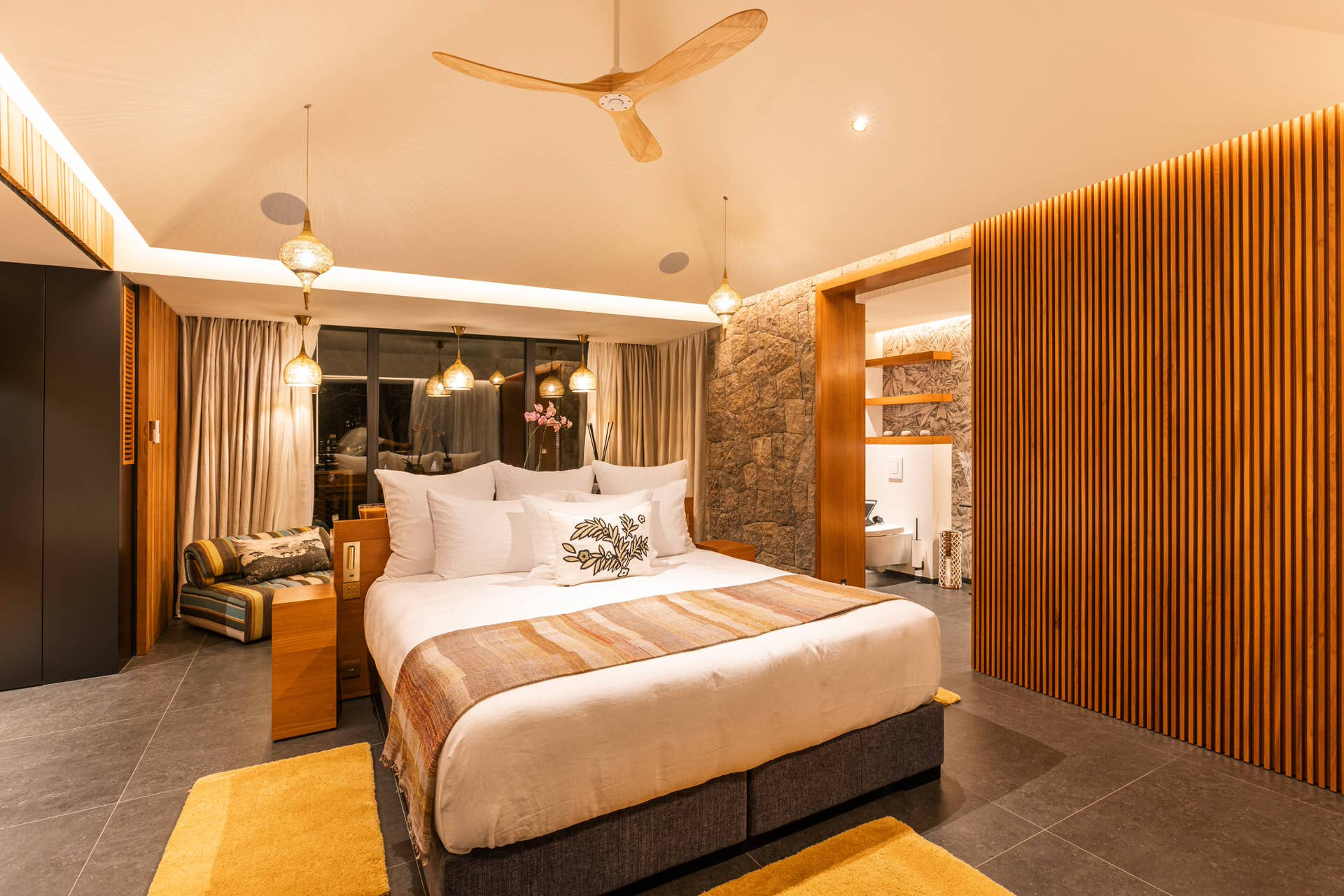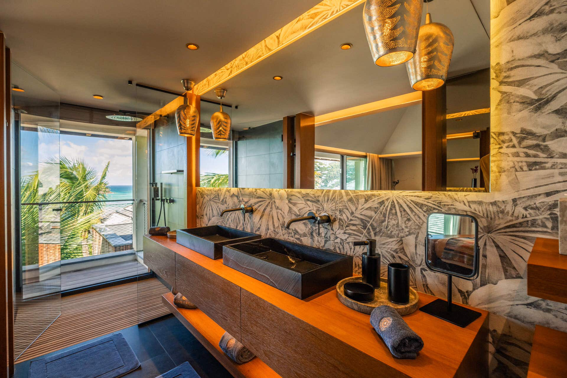 Each of the four bedrooms offers a serene sanctuary, featuring luxurious details, soothing textures, and spacious en-suite bathrooms. Some open directly onto the sea view, others onto lush tropical gardens, but all share the same level of comfort and understated sophistication. The heated infinity pool seamlessly merges with the surrounding landscape and is bordered by lush vegetation and multiple sun-filled lounging areas.