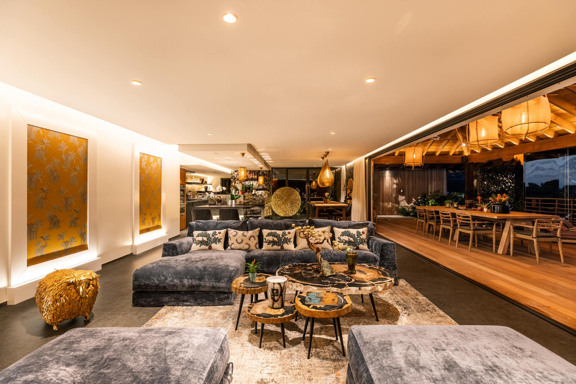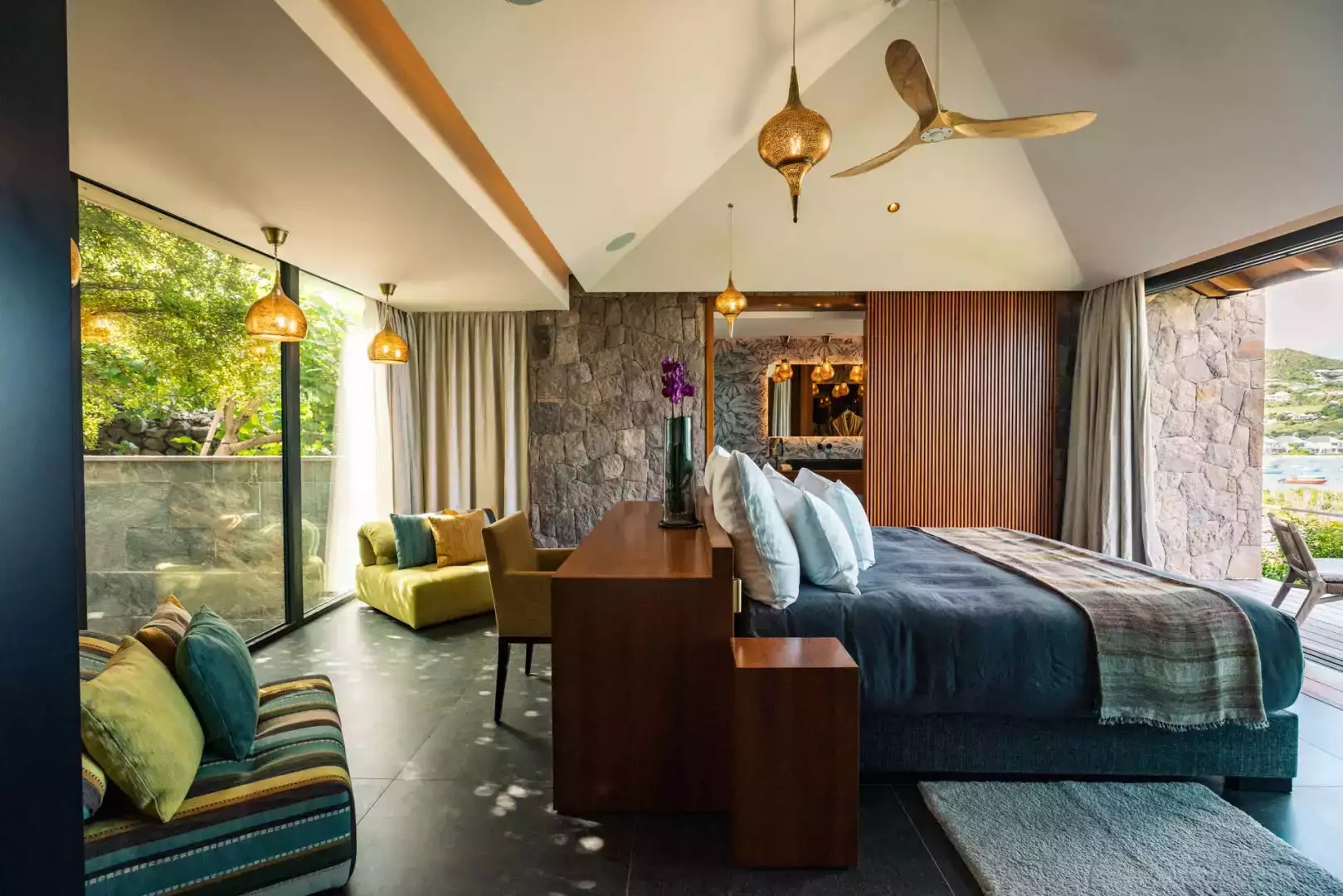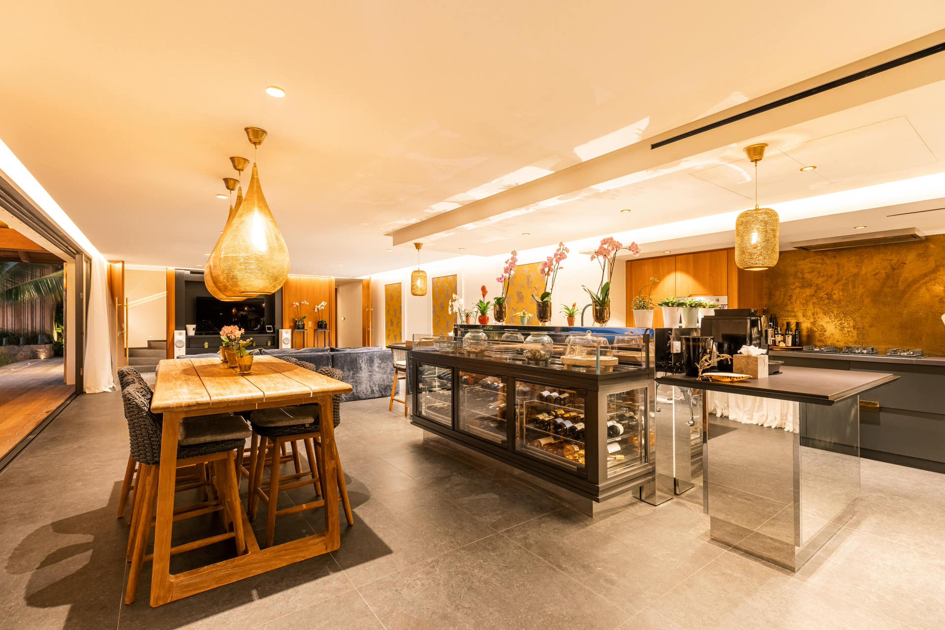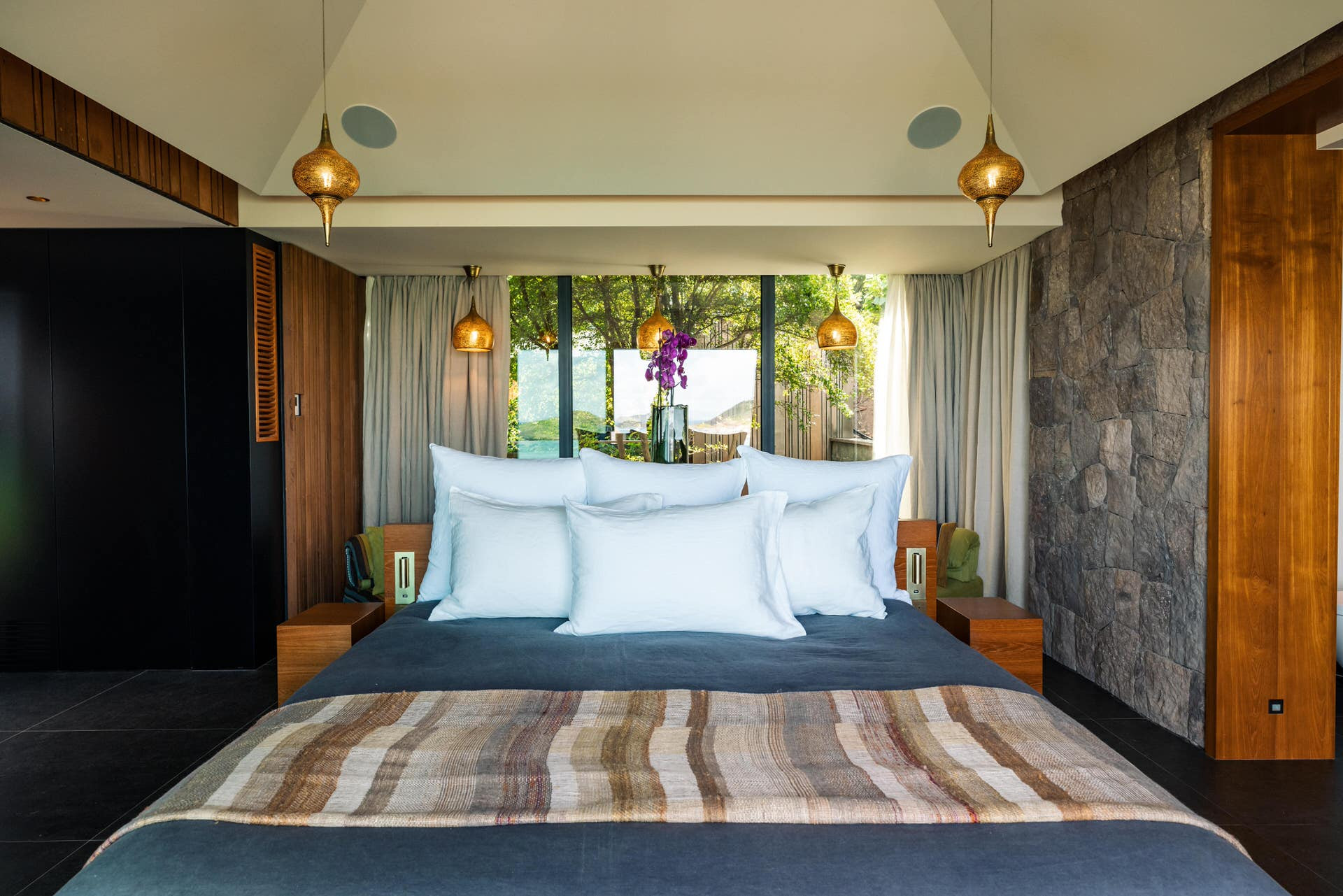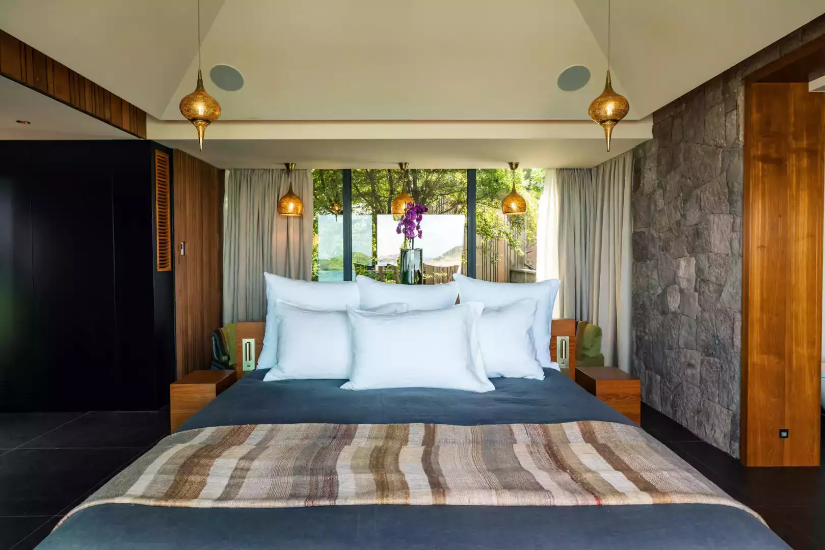 Each of the four bedrooms offers a serene sanctuary, featuring luxurious details, soothing textures, and spacious en-suite bathrooms. Some open directly onto the sea view, others onto lush tropical gardens, but all share the same level of comfort and understated sophistication. The heated infinity pool seamlessly merges with the surrounding landscape and is bordered by lush vegetation and multiple sun-filled lounging areas.