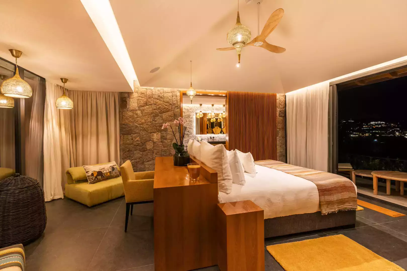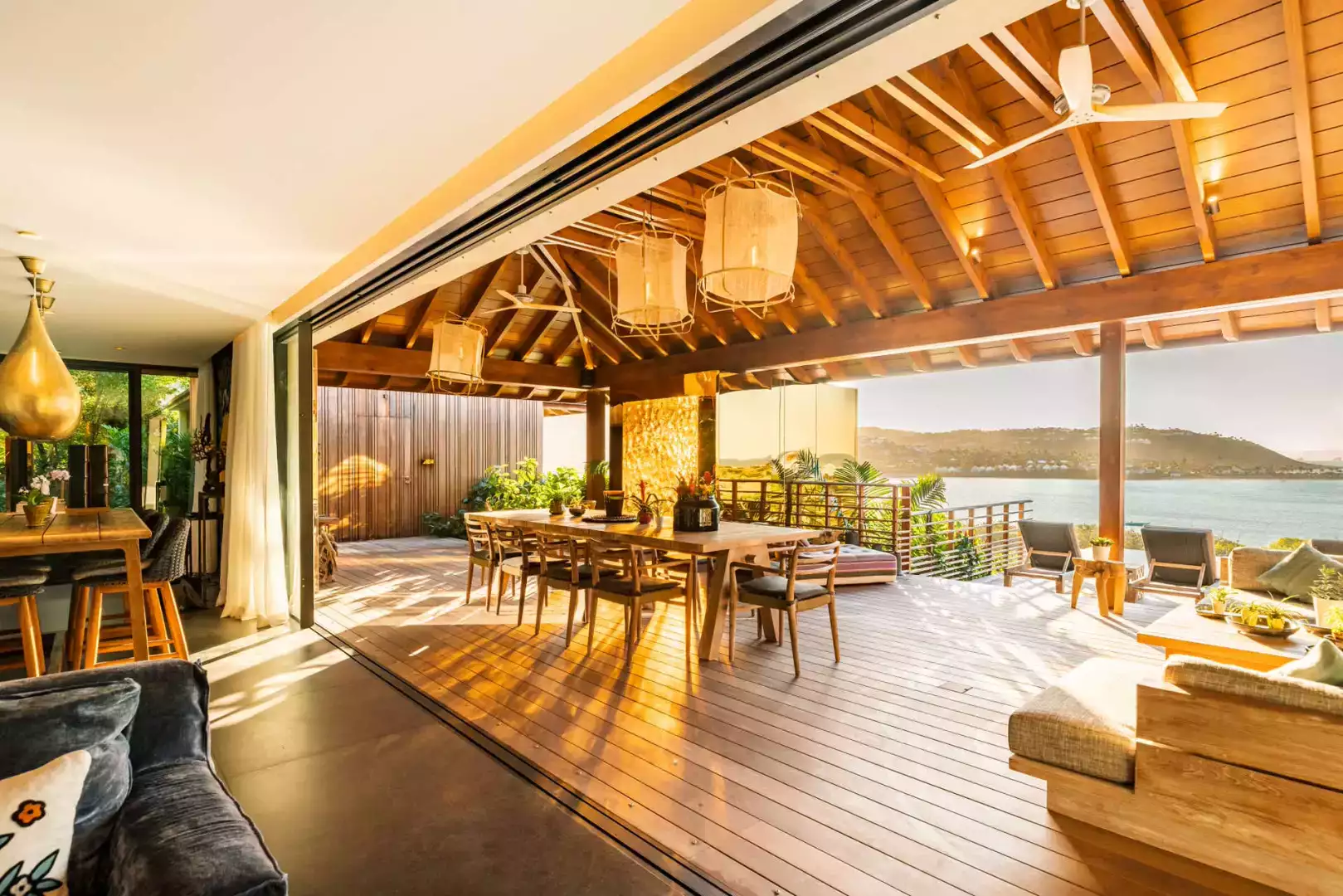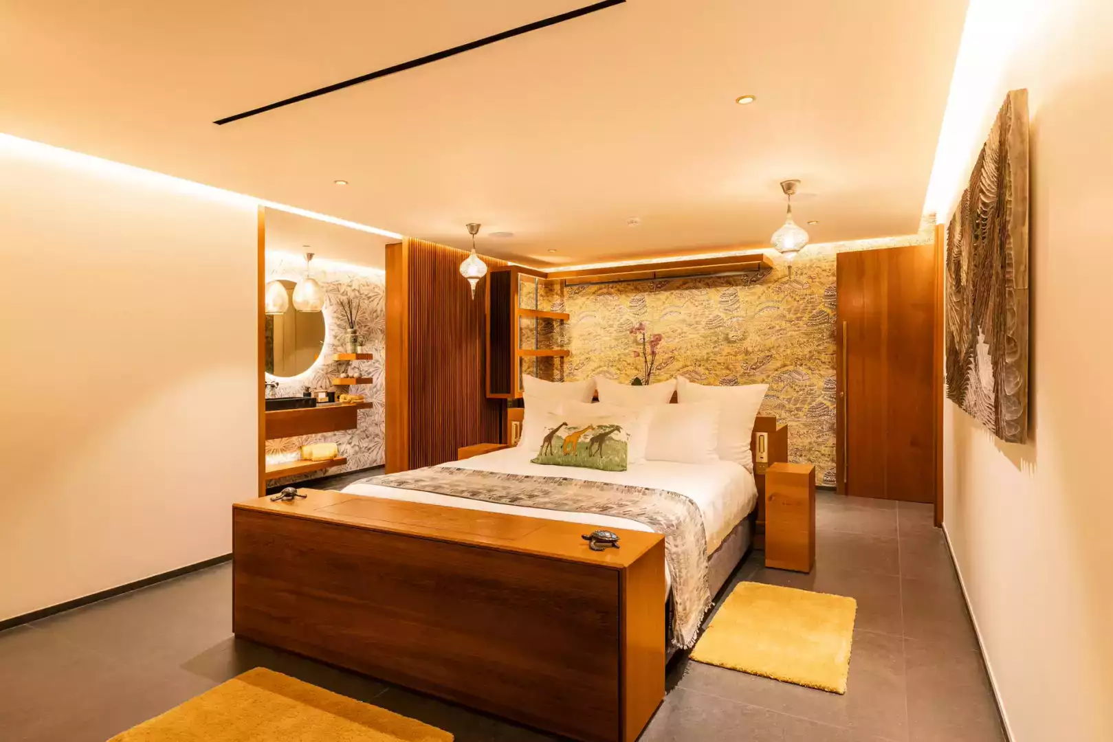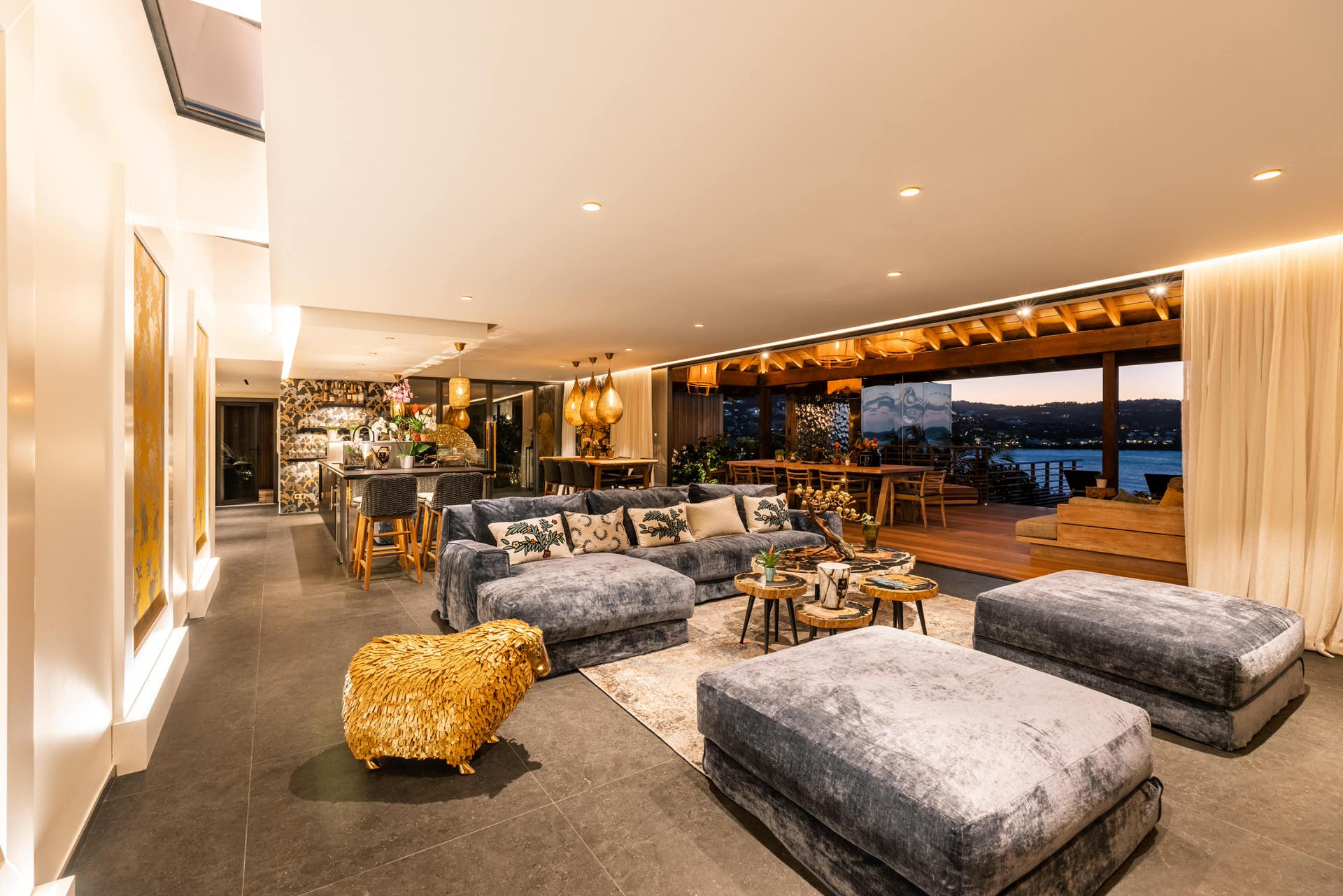 Each of the four bedrooms offers a serene sanctuary, featuring luxurious details, soothing textures, and spacious en-suite bathrooms. Some open directly onto the sea view, others onto lush tropical gardens, but all share the same level of comfort and understated sophistication. The heated infinity pool seamlessly merges with the surrounding landscape and is bordered by lush vegetation and multiple sun-filled lounging areas.