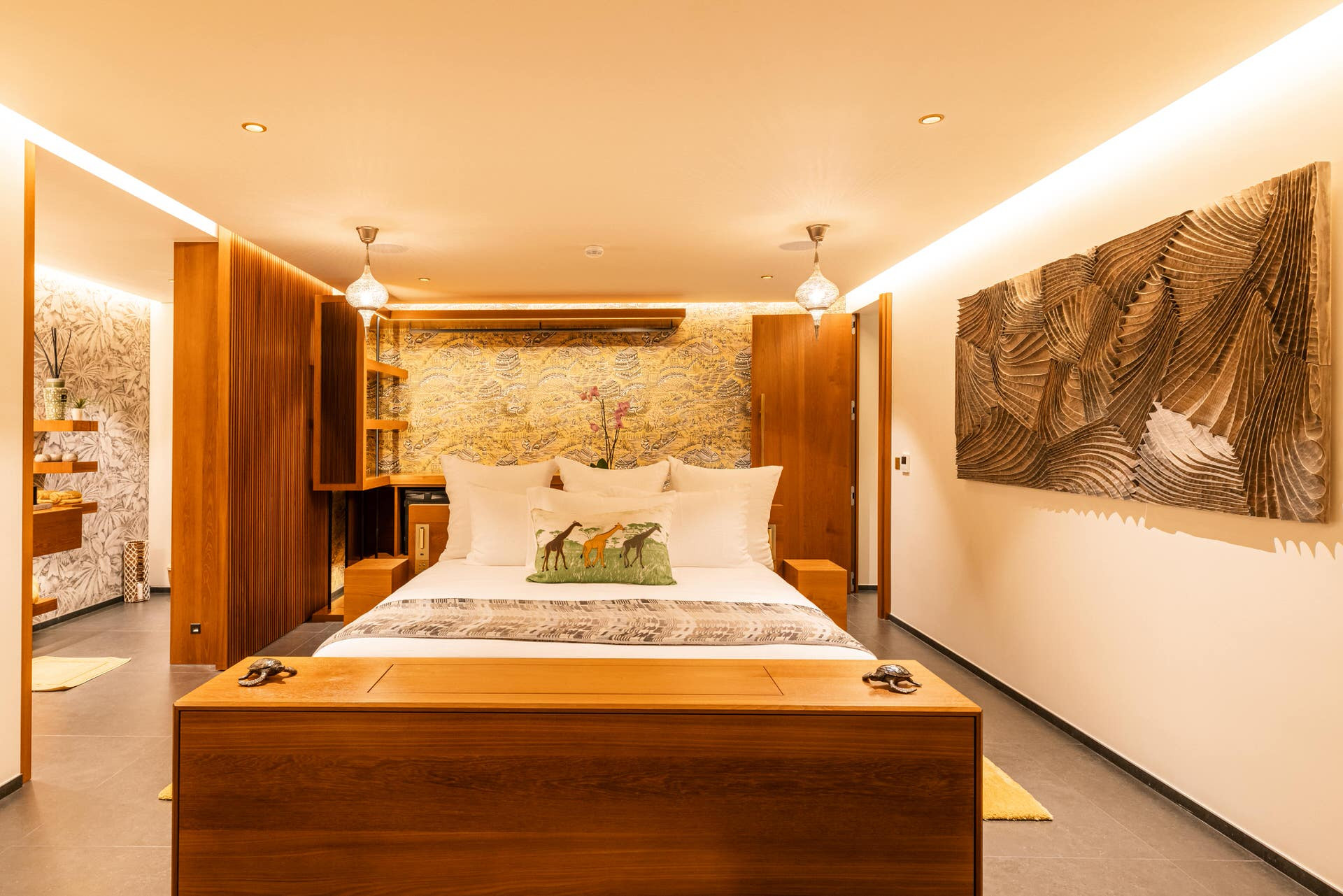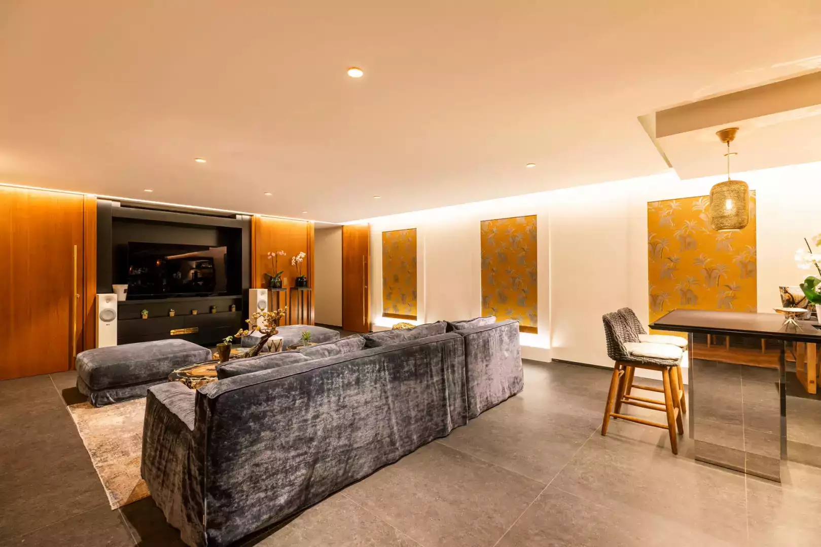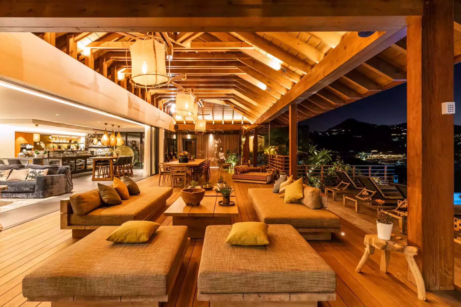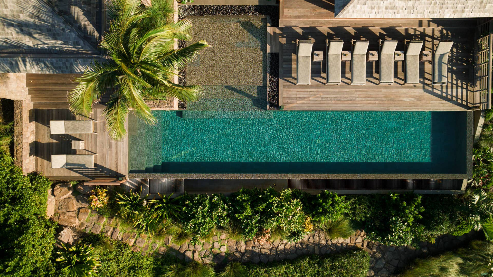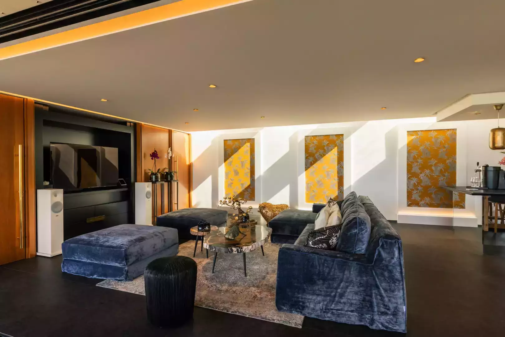 Each of the four bedrooms offers a serene sanctuary, featuring luxurious details, soothing textures, and spacious en-suite bathrooms. Some open directly onto the sea view, others onto lush tropical gardens, but all share the same level of comfort and understated sophistication. The heated infinity pool seamlessly merges with the surrounding landscape and is bordered by lush vegetation and multiple sun-filled lounging areas.