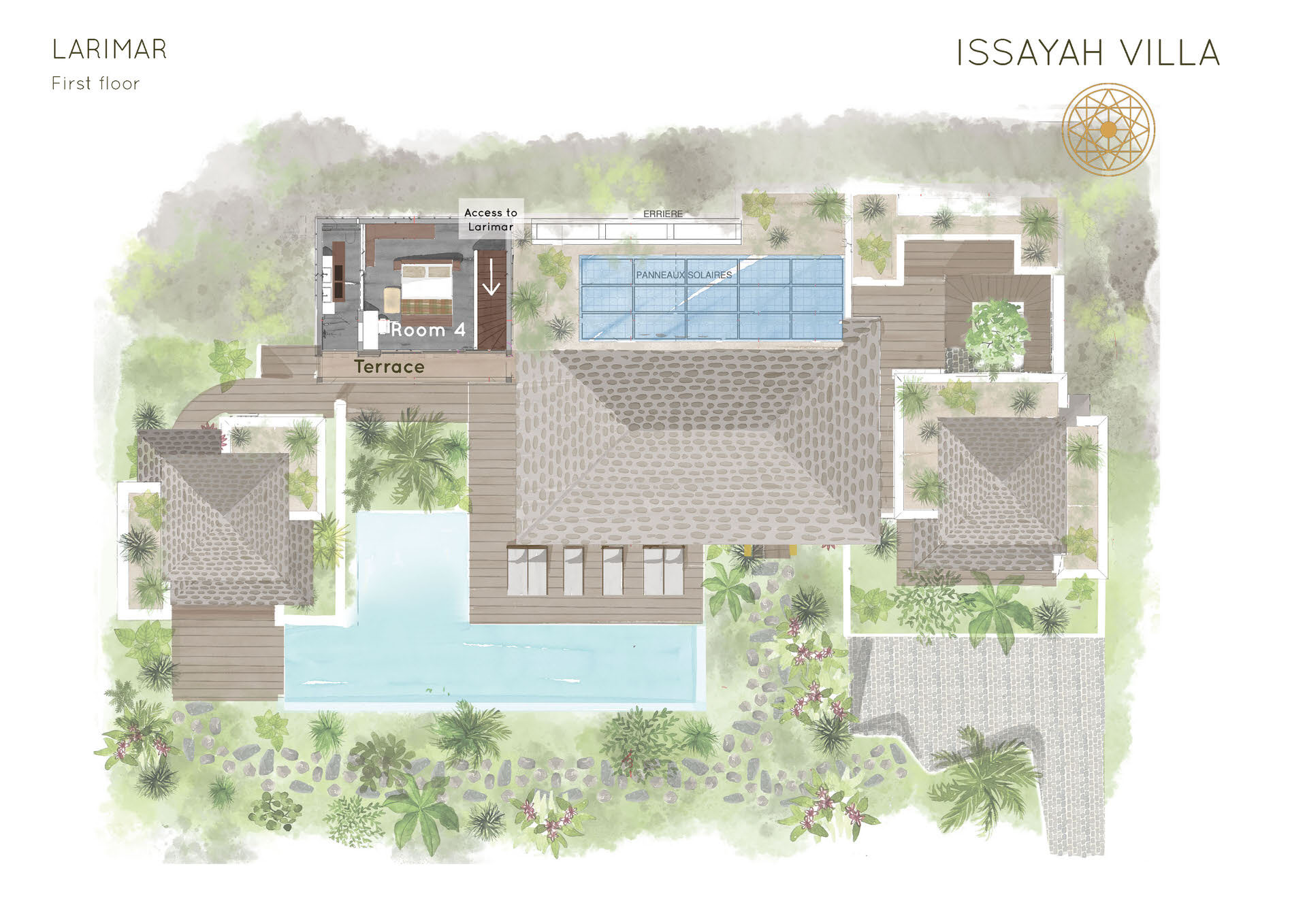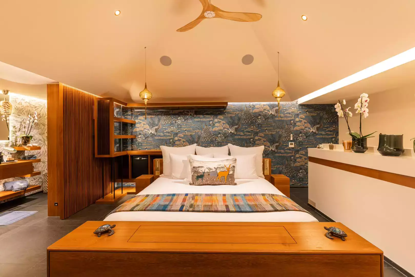 Located on the upper level. King size bed (180 cm), A/C, HD-TV (French & US satellite, Apple TV), Sonos sound system, iPad control, dressing, safe. Ensuite bathroom with indoor shower, double sink, hairdryer, bathrobes. Opens to garden and sea view.