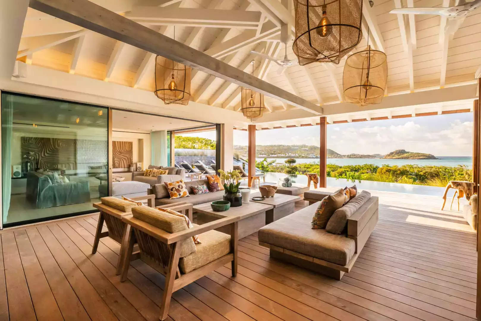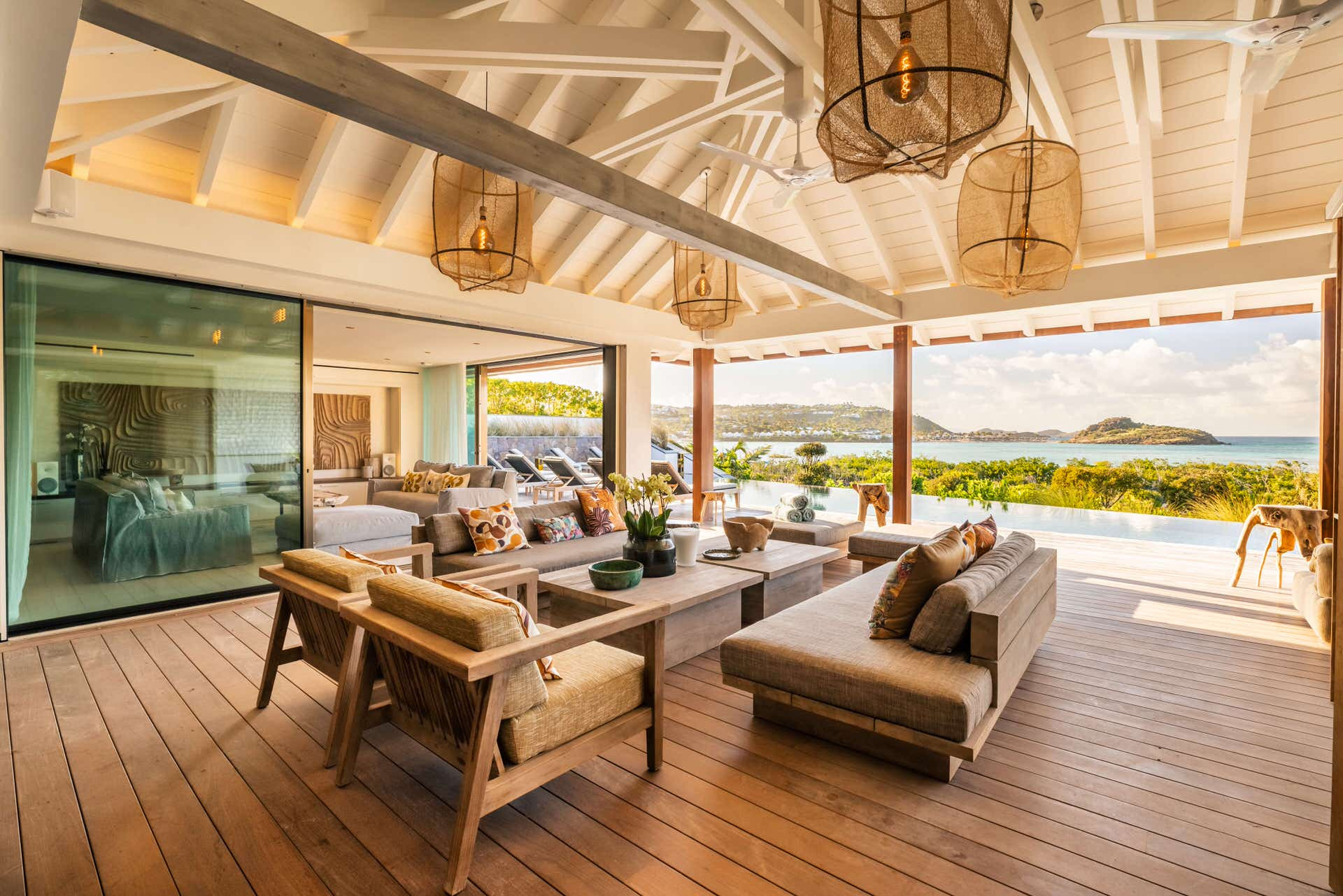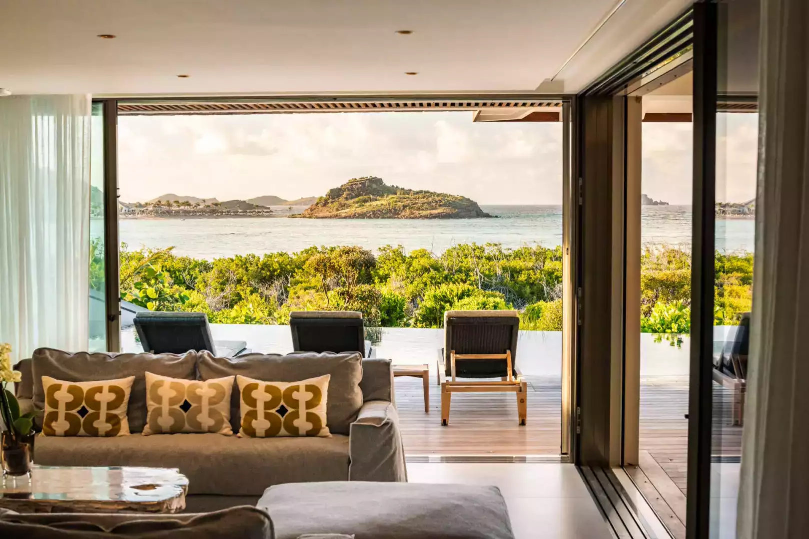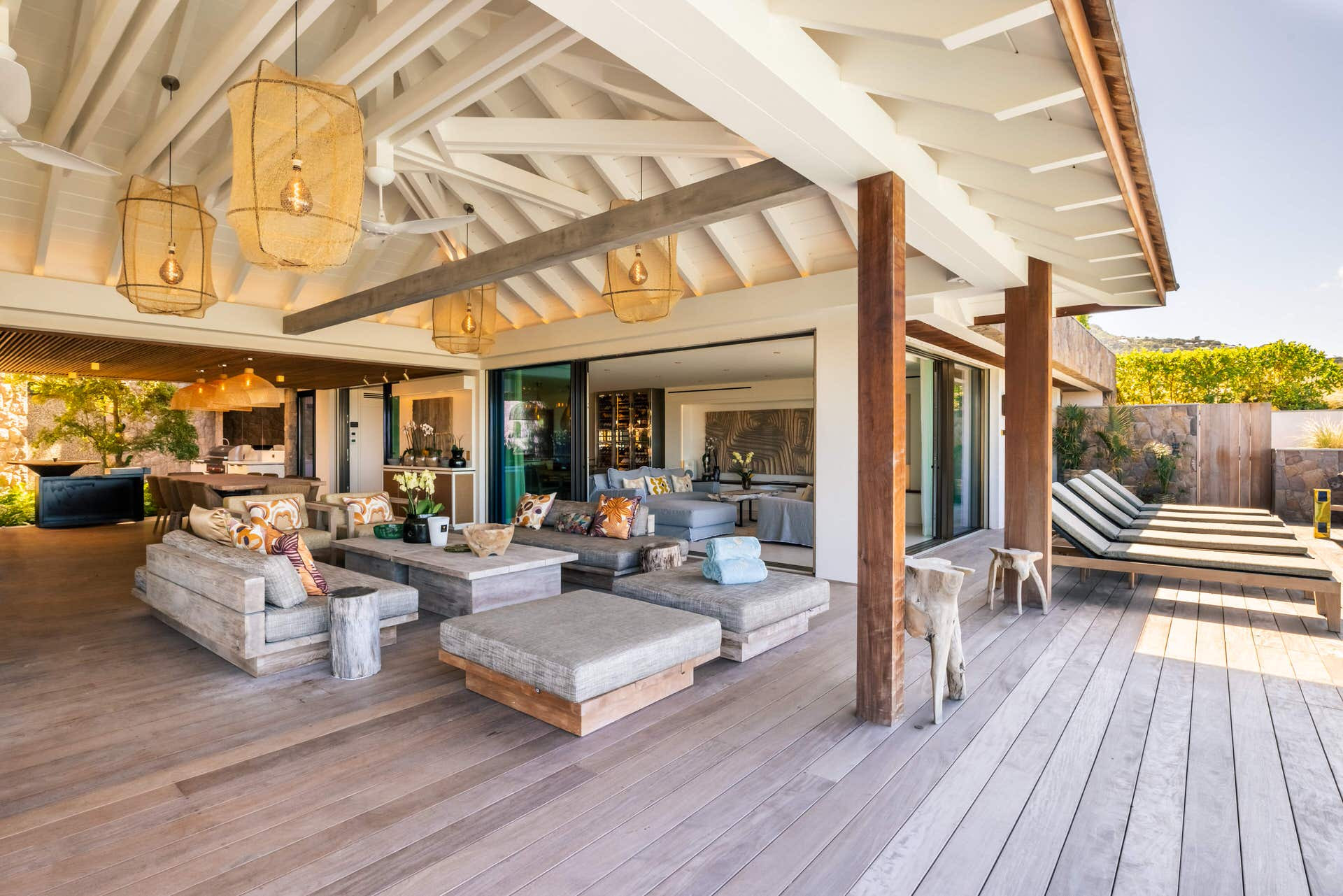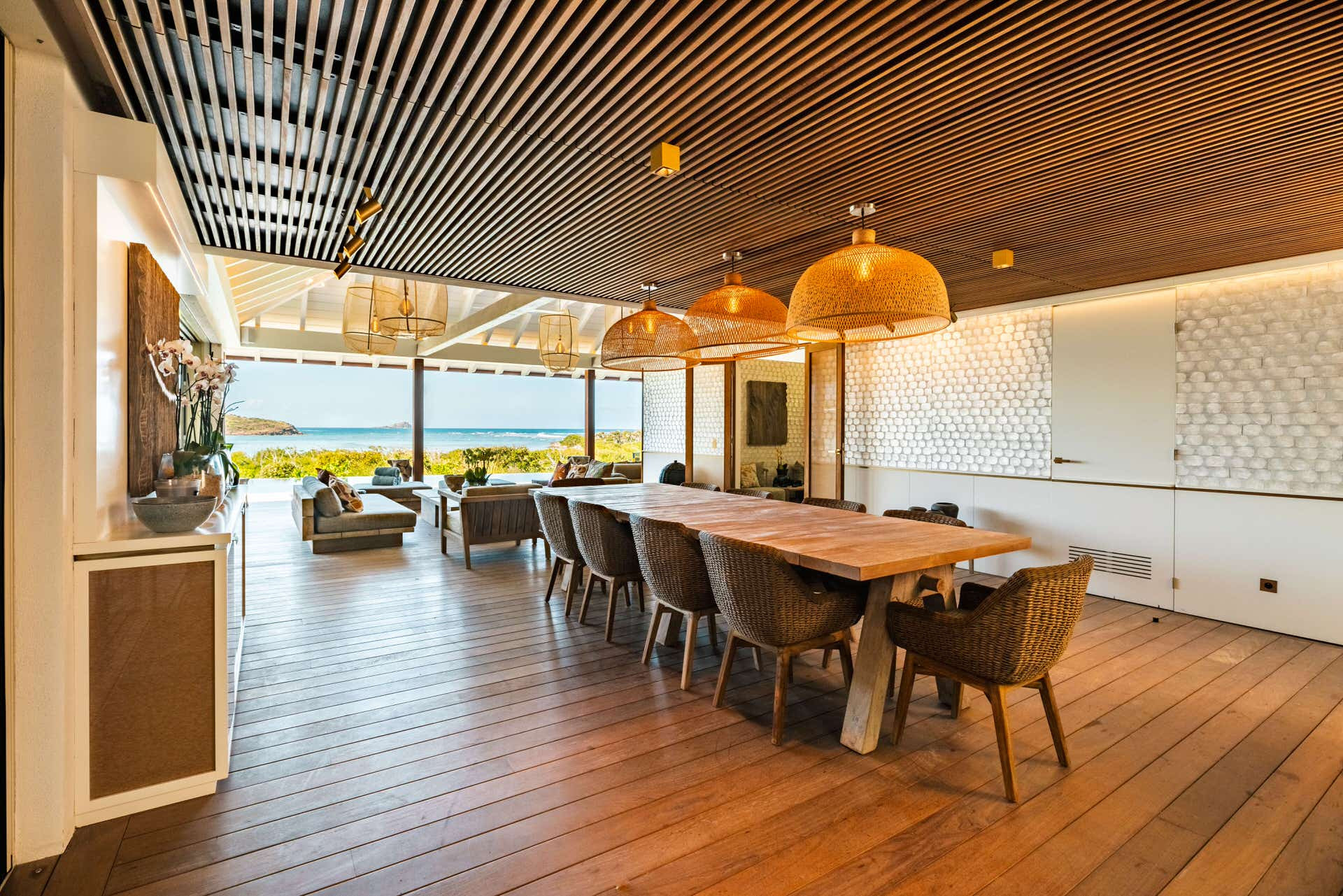 Villa Lazuli is one of those places where the holiday feeling hits instantly. Overlooking the turquoise lagoon of Grand Cul-de-Sac, it blends contemporary design, warm natural materials, and a soothing connection to nature. The main living spaces open widely onto the terrace, inviting you to enjoy sunshine, sea breeze, and total relaxation. The large air-conditioned great room flows seamlessly toward the outdoor lounge, creating an effortless indoor-outdoor lifestyle.