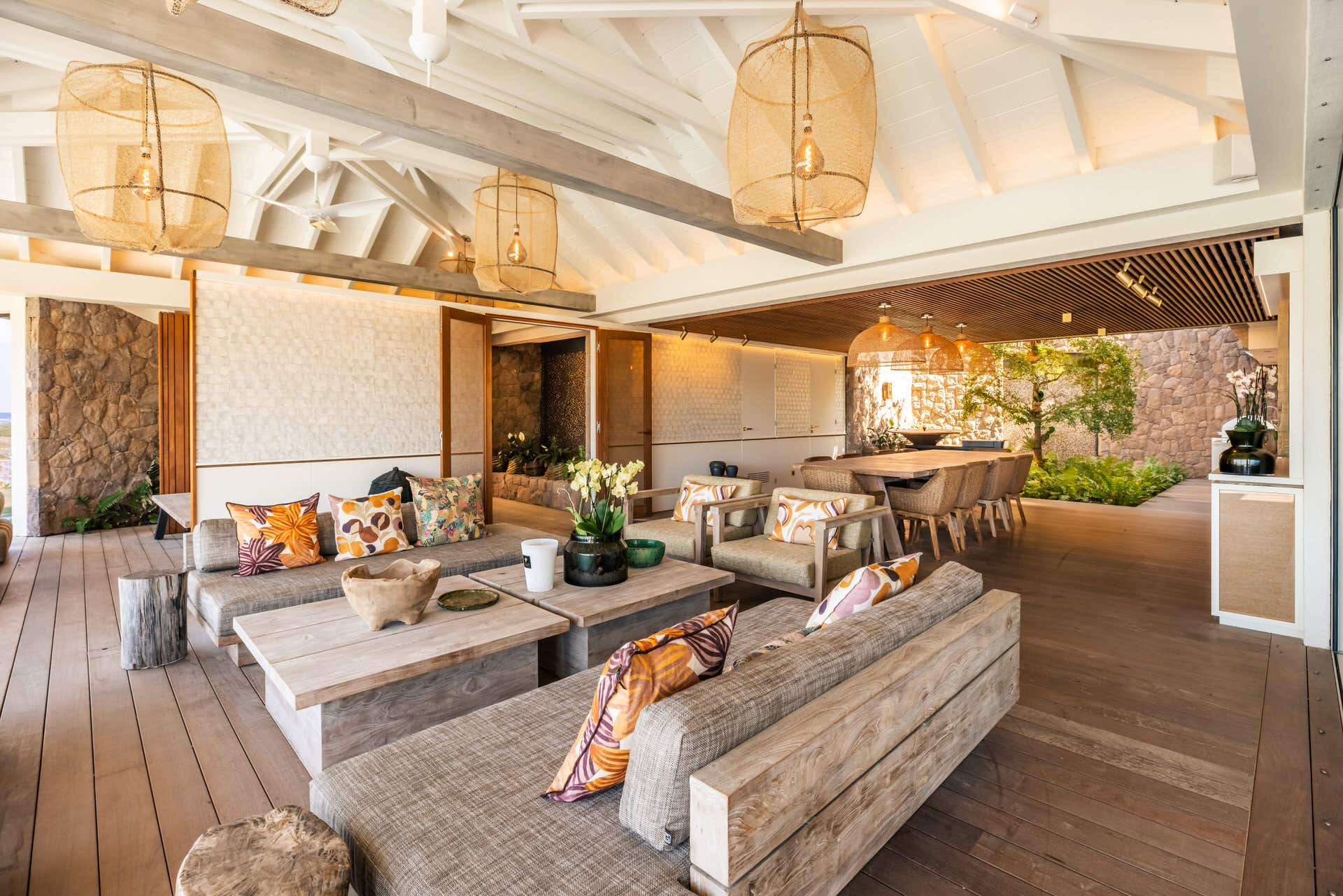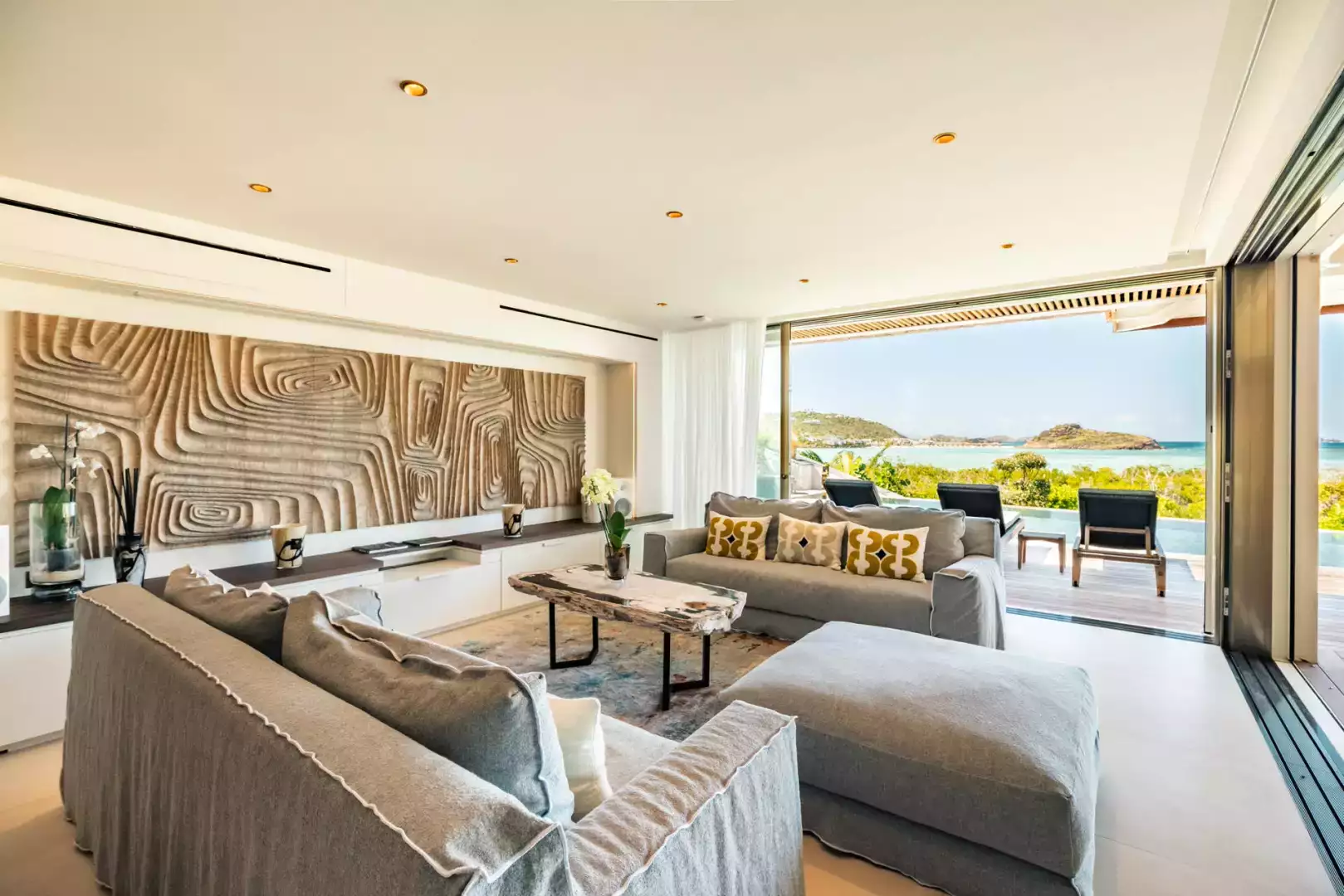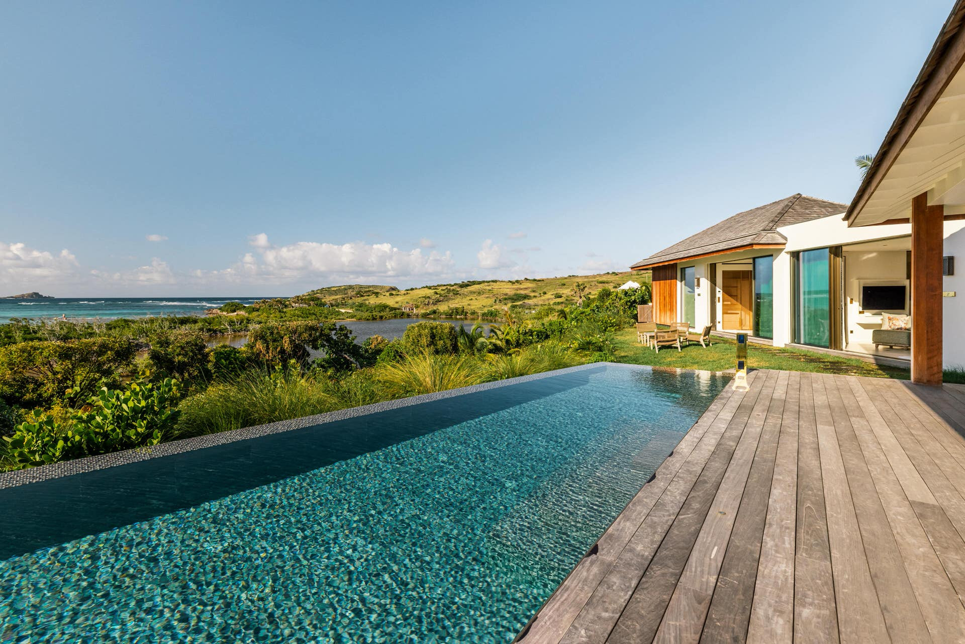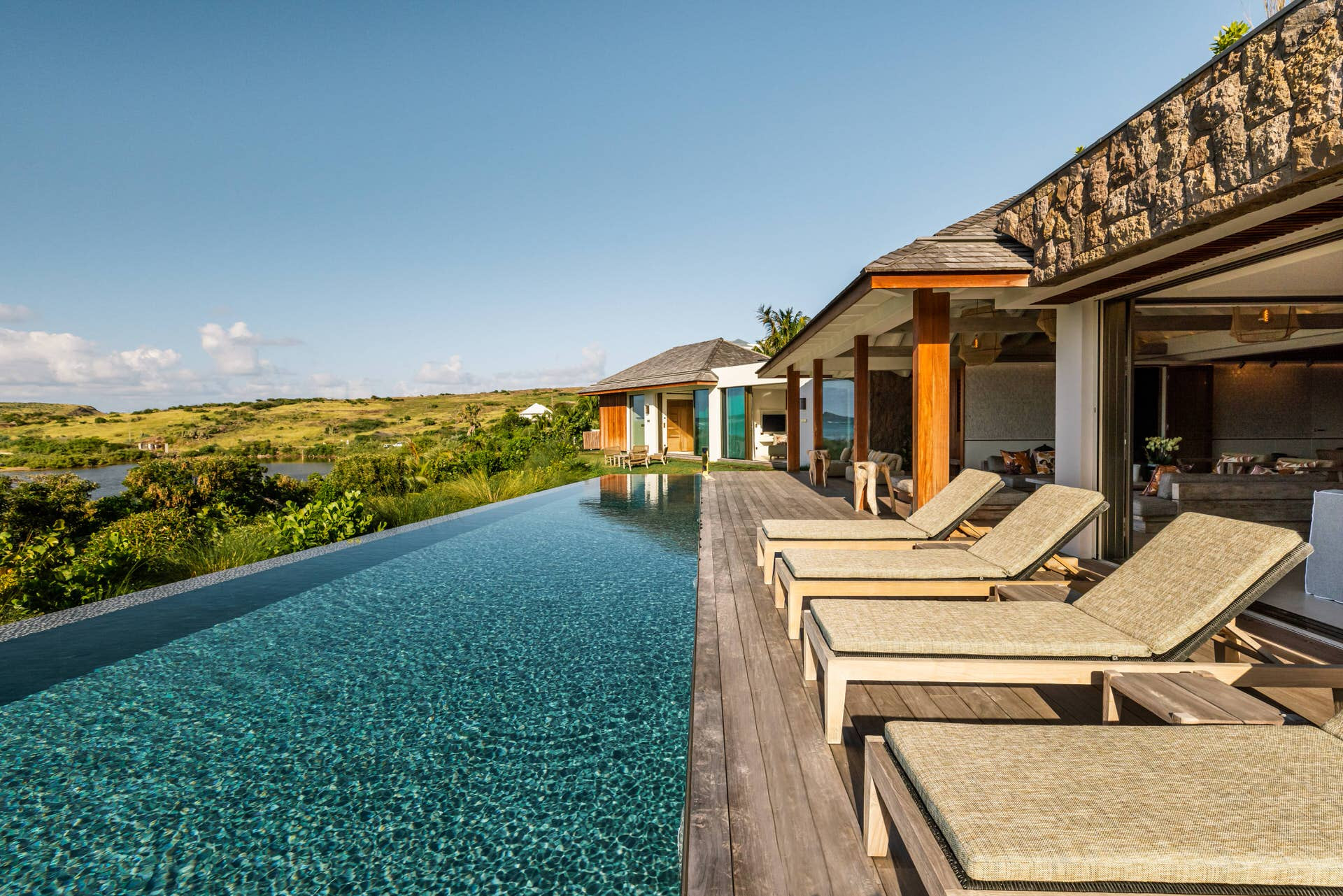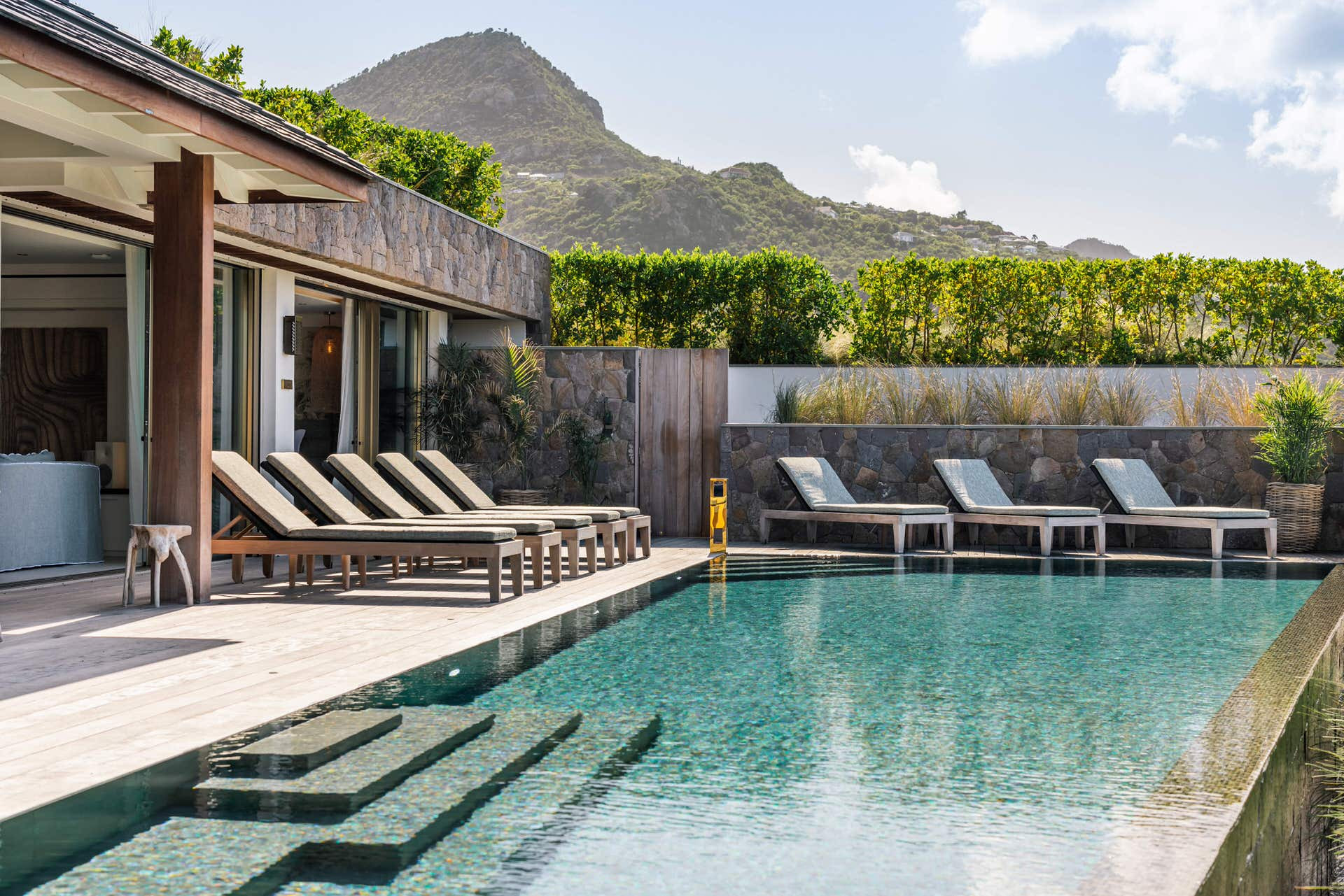 Villa Lazuli is one of those places where the holiday feeling hits instantly. Overlooking the turquoise lagoon of Grand Cul-de-Sac, it blends contemporary design, warm natural materials, and a soothing connection to nature. The main living spaces open widely onto the terrace, inviting you to enjoy sunshine, sea breeze, and total relaxation. The large air-conditioned great room flows seamlessly toward the outdoor lounge, creating an effortless indoor-outdoor lifestyle.