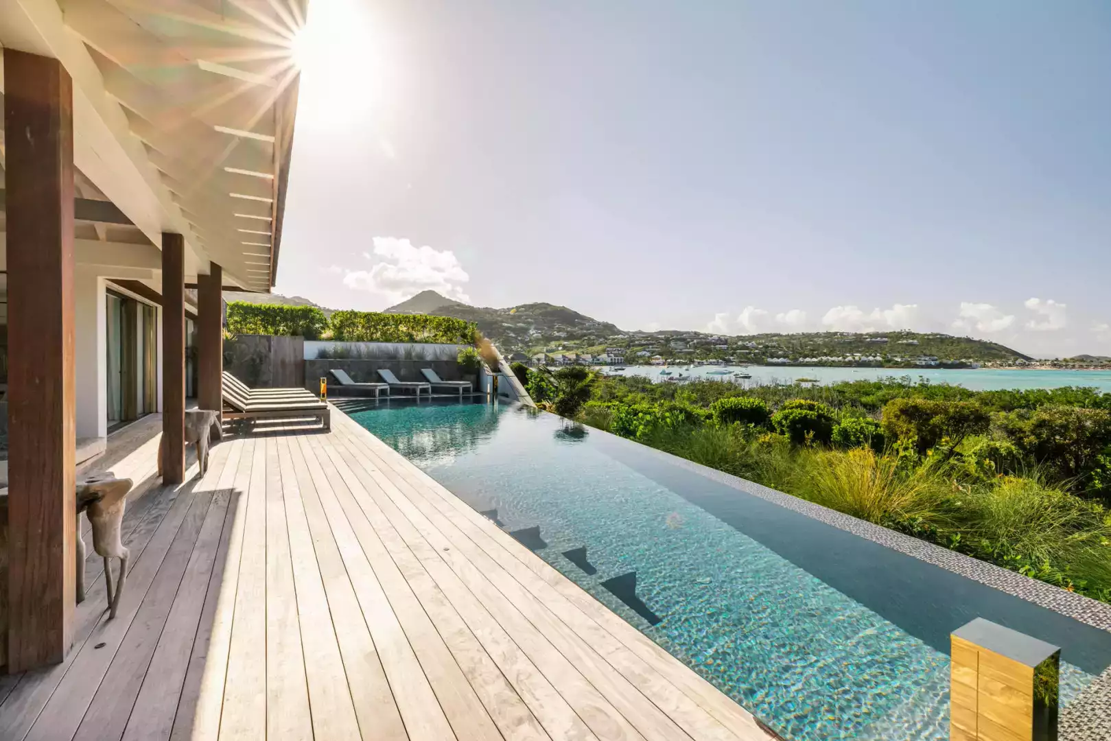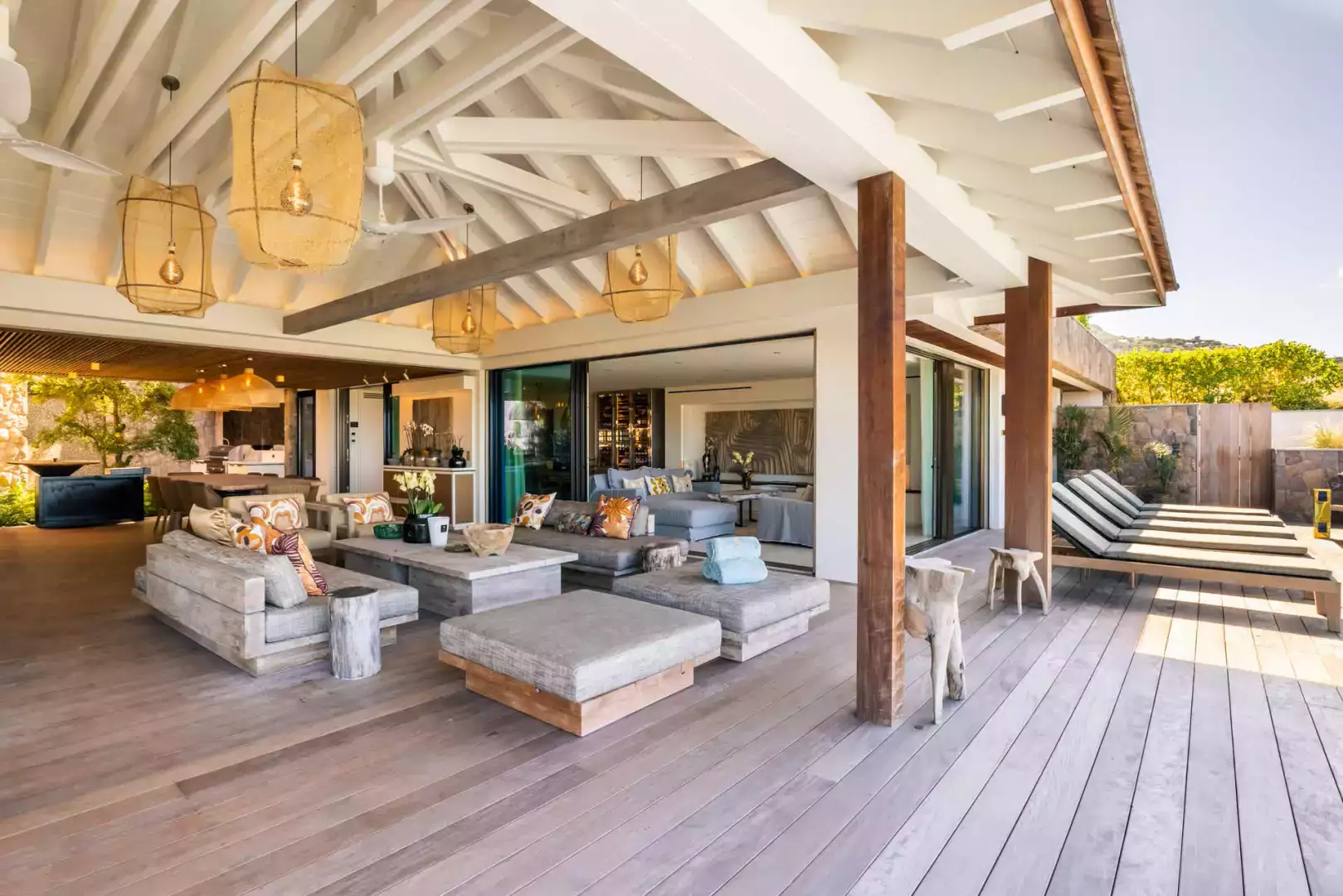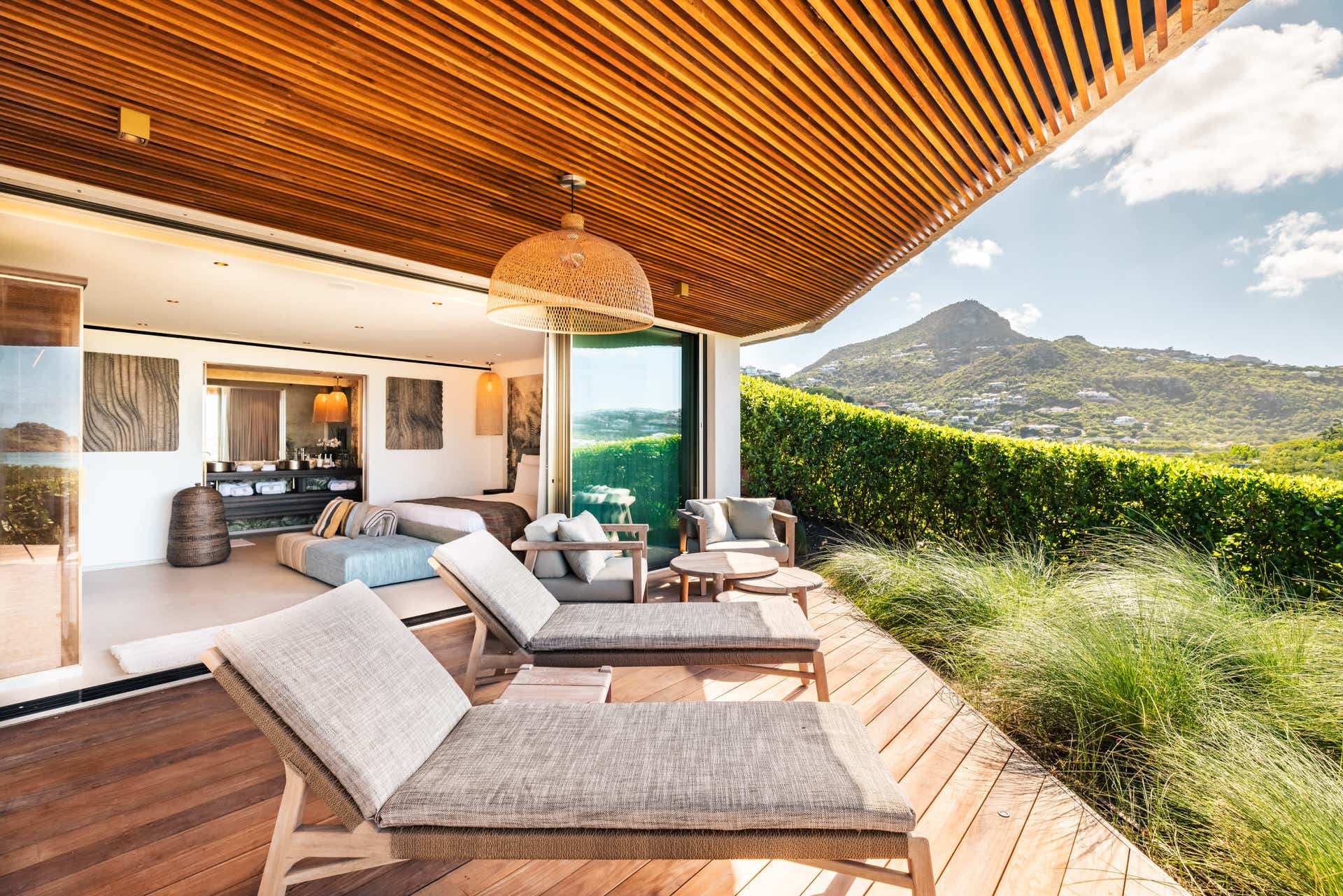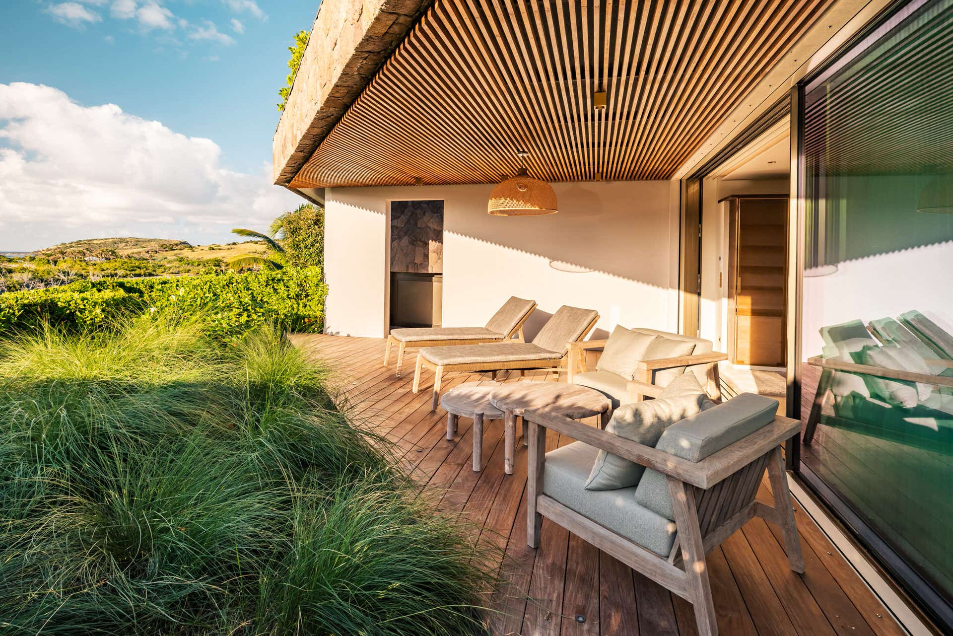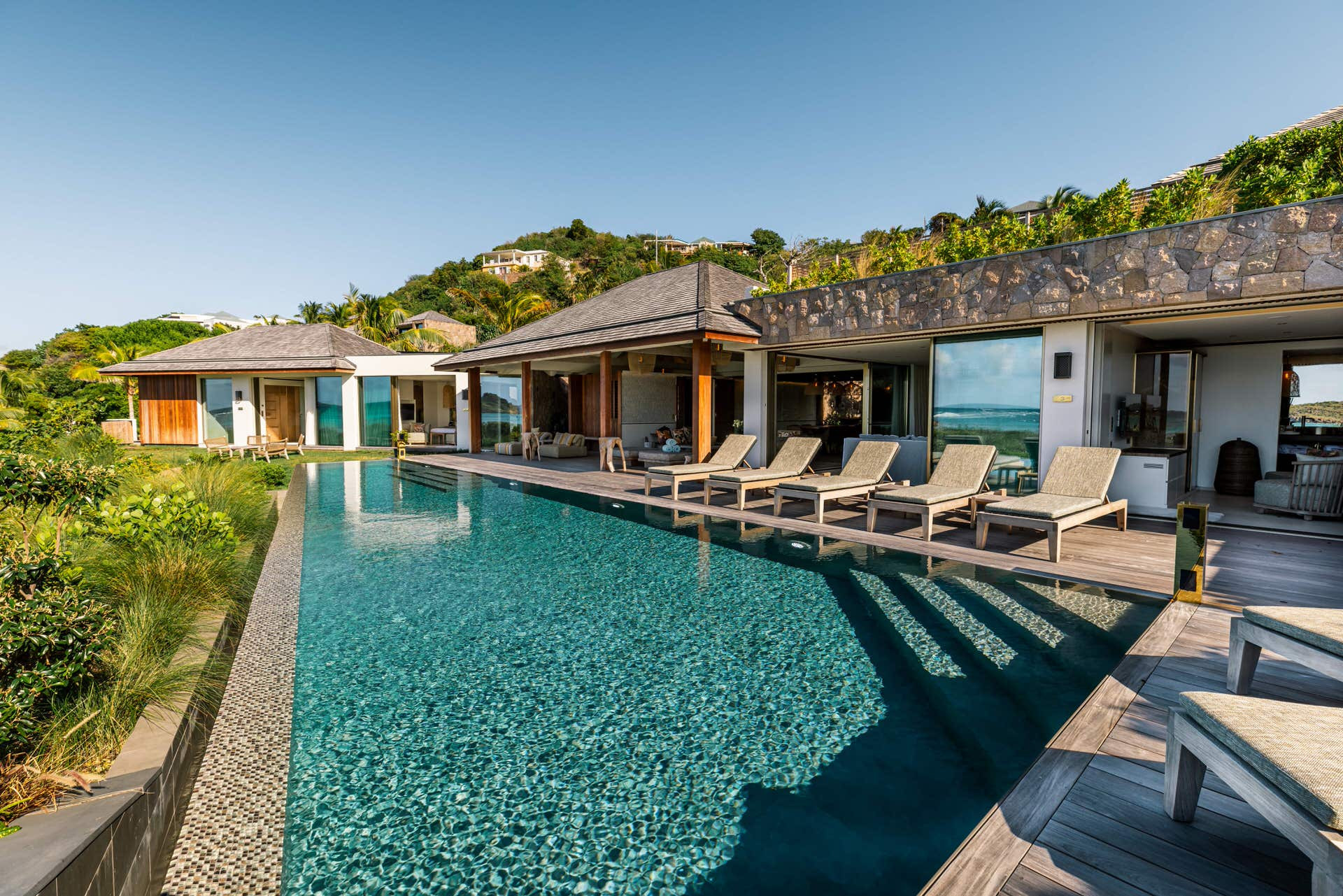Villa Lazuli is one of those places where the holiday feeling hits instantly. Overlooking the turquoise lagoon of Grand Cul-de-Sac, it blends contemporary design, warm natural materials, and a soothing connection to nature. The main living spaces open widely onto the terrace, inviting you to enjoy sunshine, sea breeze, and total relaxation. The large air-conditioned great room flows seamlessly toward the outdoor lounge, creating an effortless indoor-outdoor lifestyle.