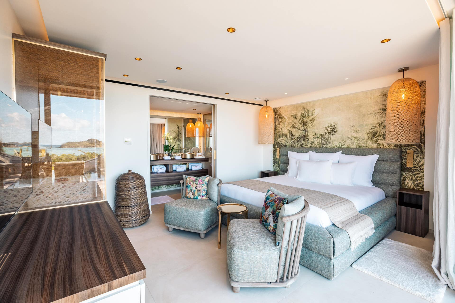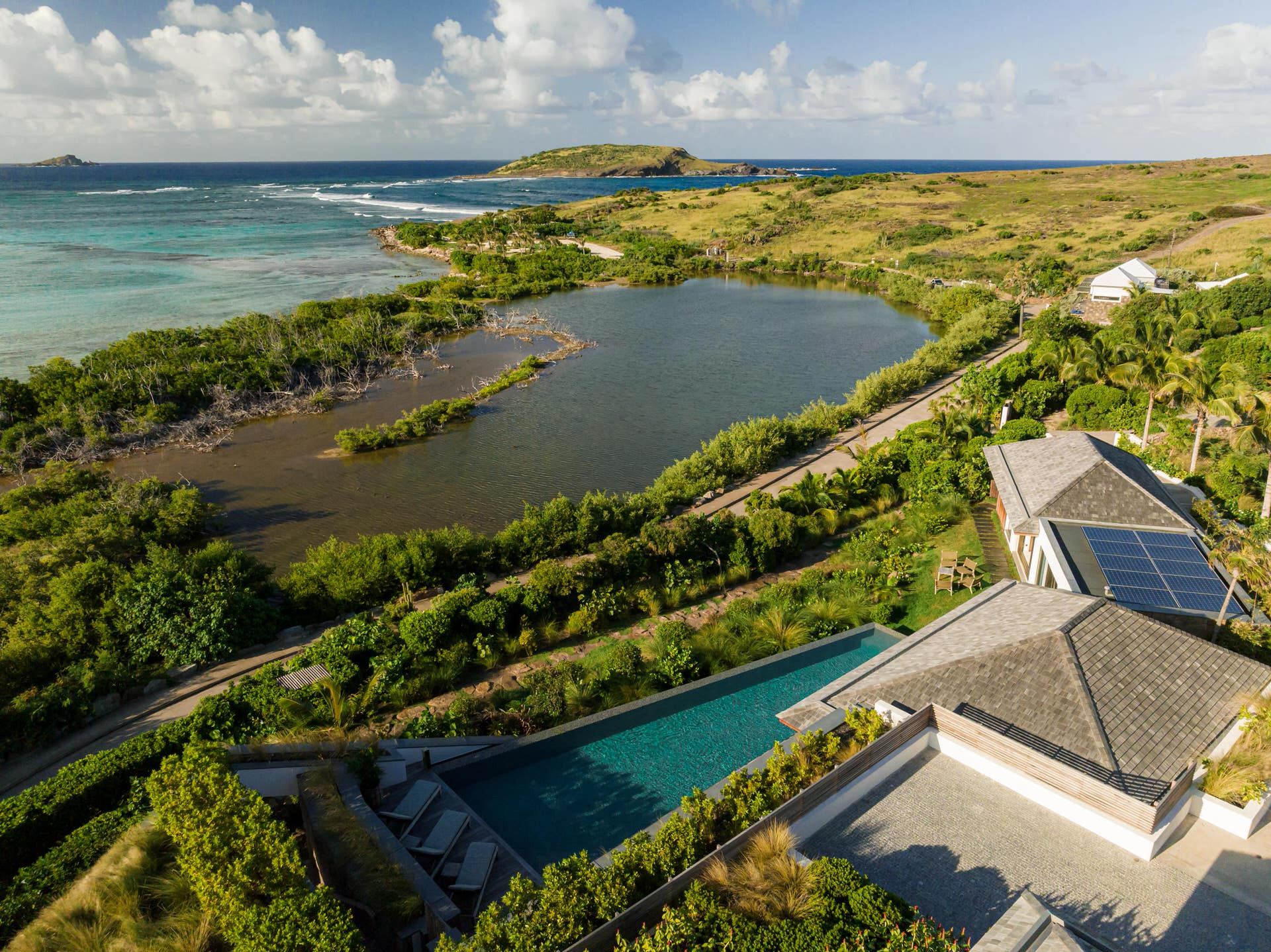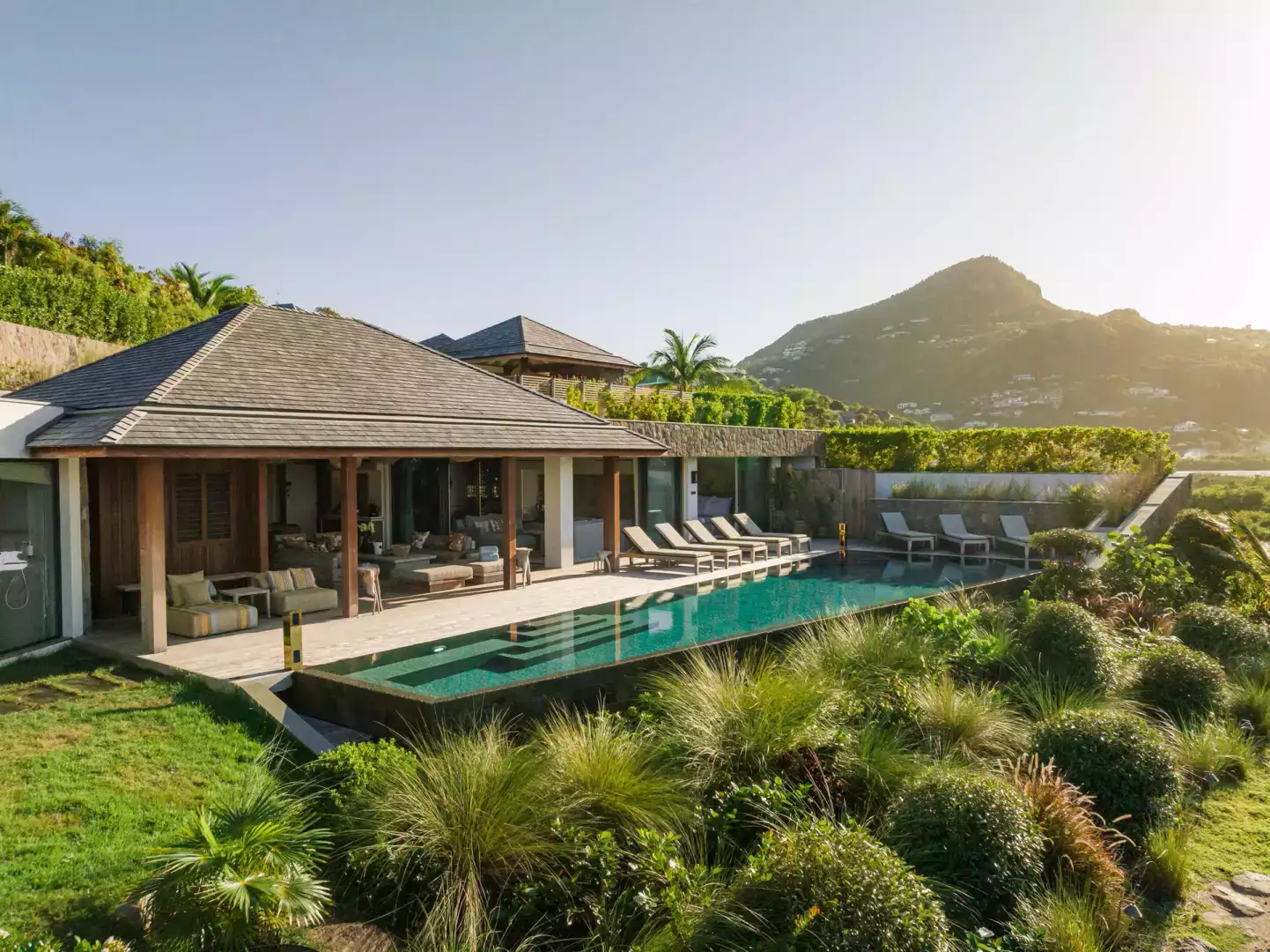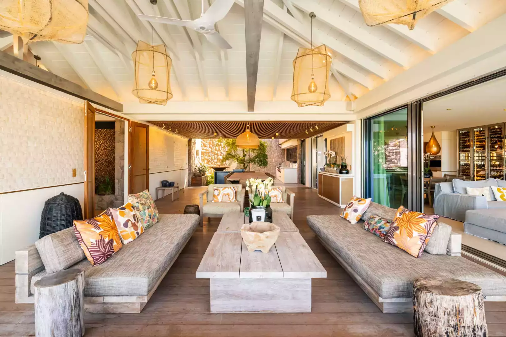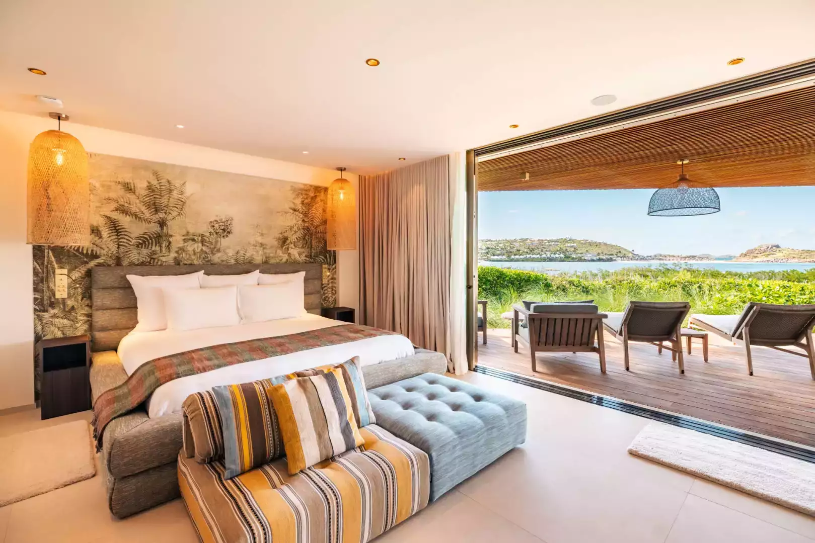 Villa Lazuli is one of those places where the holiday feeling hits instantly. Overlooking the turquoise lagoon of Grand Cul-de-Sac, it blends contemporary design, warm natural materials, and a soothing connection to nature. The main living spaces open widely onto the terrace, inviting you to enjoy sunshine, sea breeze, and total relaxation. The large air-conditioned great room flows seamlessly toward the outdoor lounge, creating an effortless indoor-outdoor lifestyle.