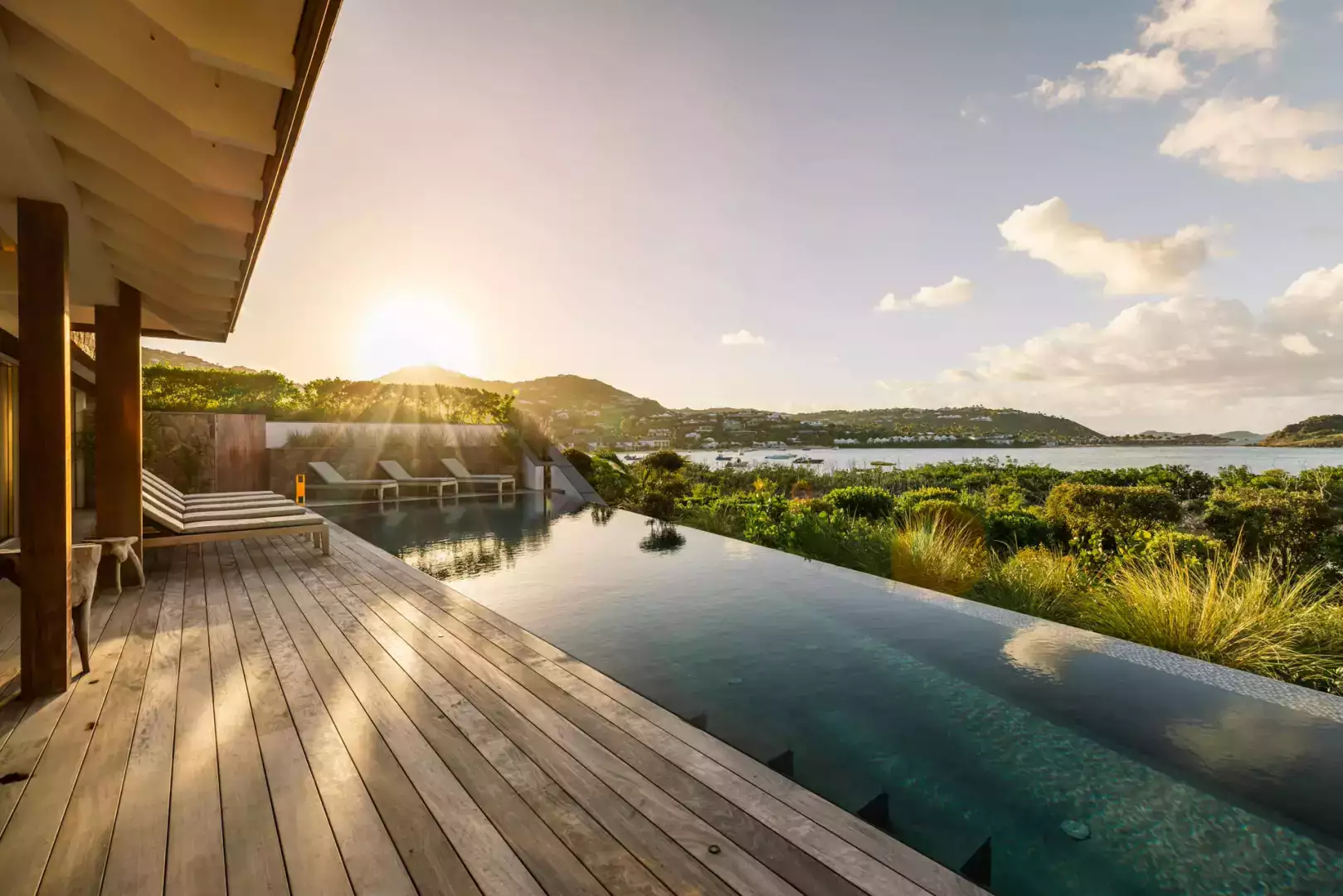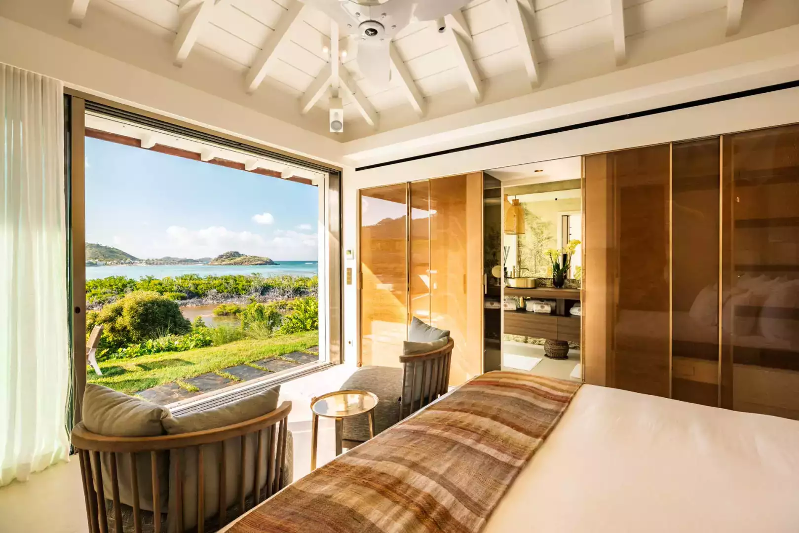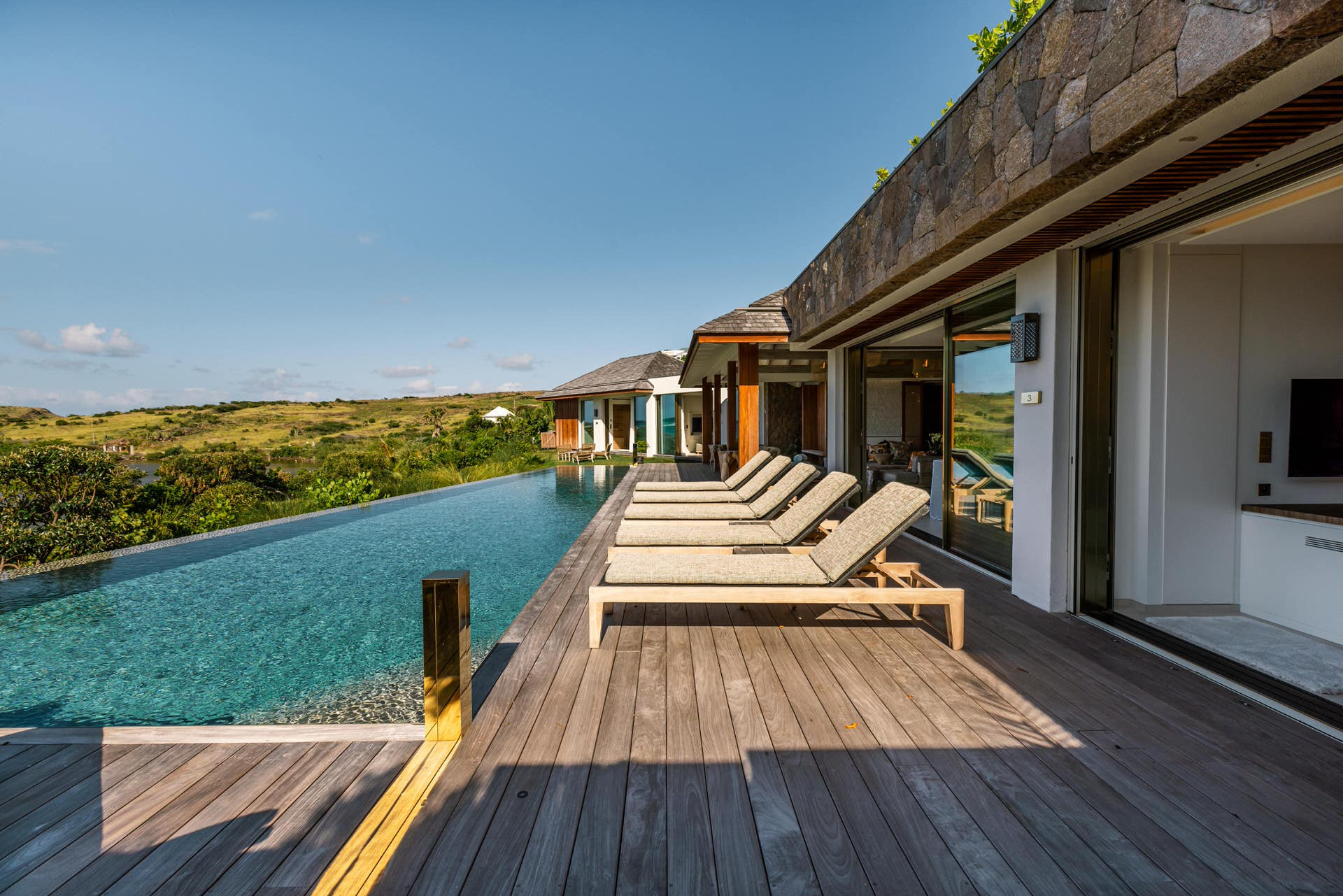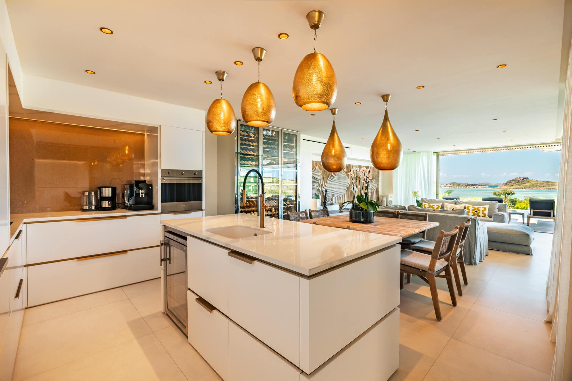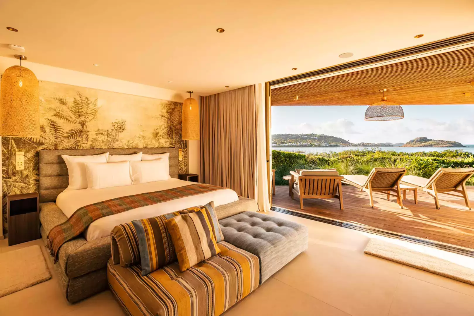 Villa Lazuli is one of those places where the holiday feeling hits instantly. Overlooking the turquoise lagoon of Grand Cul-de-Sac, it blends contemporary design, warm natural materials, and a soothing connection to nature. The main living spaces open widely onto the terrace, inviting you to enjoy sunshine, sea breeze, and total relaxation. The large air-conditioned great room flows seamlessly toward the outdoor lounge, creating an effortless indoor-outdoor lifestyle.