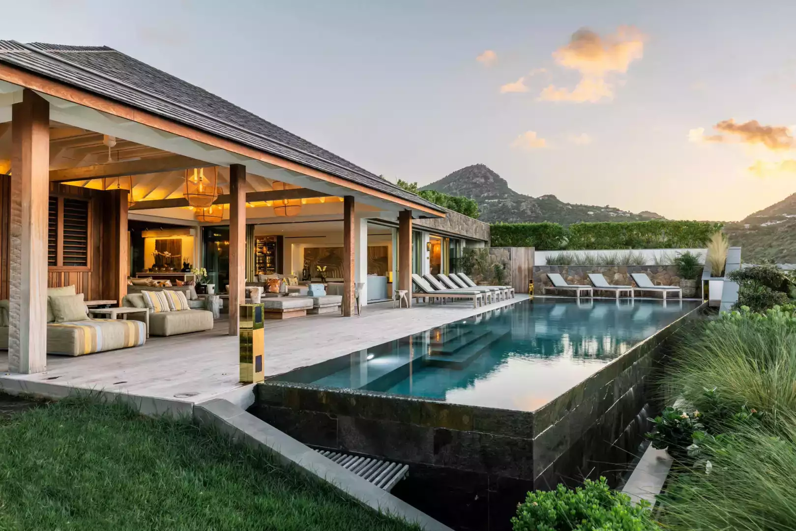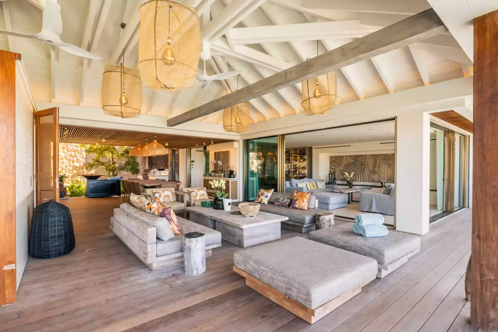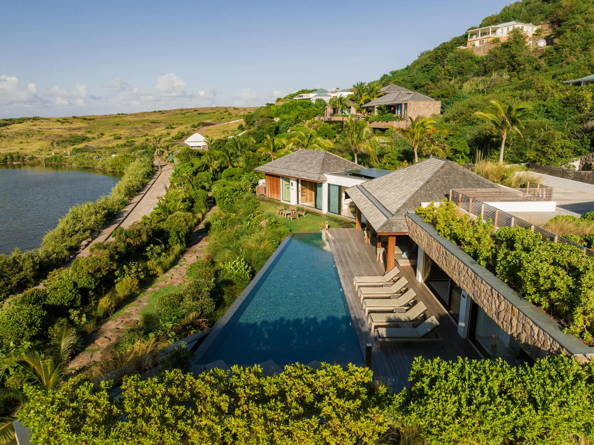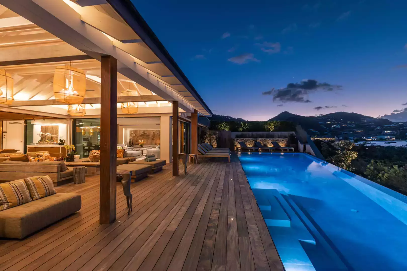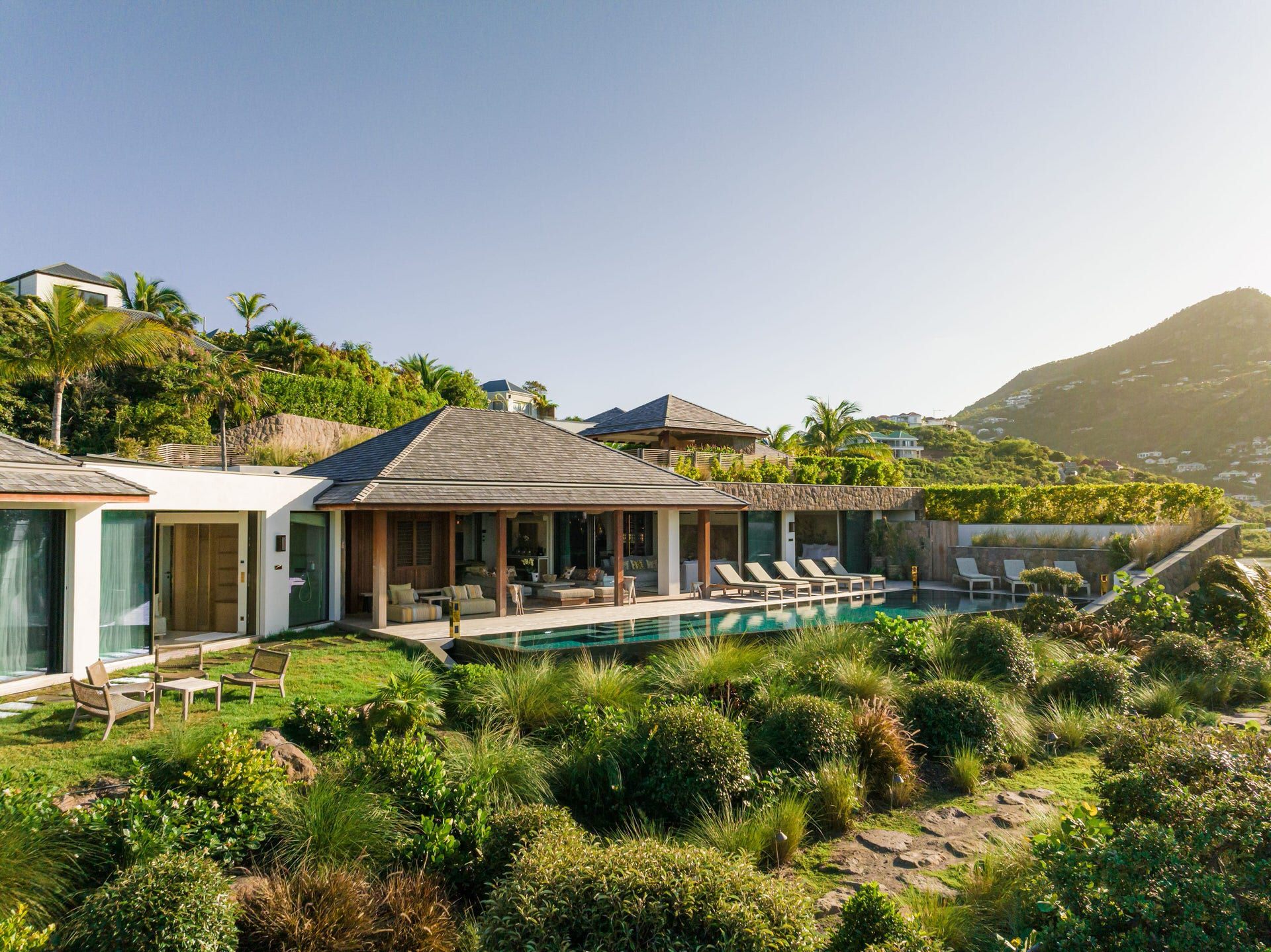 Villa Lazuli is one of those places where the holiday feeling hits instantly. Overlooking the turquoise lagoon of Grand Cul-de-Sac, it blends contemporary design, warm natural materials, and a soothing connection to nature. The main living spaces open widely onto the terrace, inviting you to enjoy sunshine, sea breeze, and total relaxation. The large air-conditioned great room flows seamlessly toward the outdoor lounge, creating an effortless indoor-outdoor lifestyle.