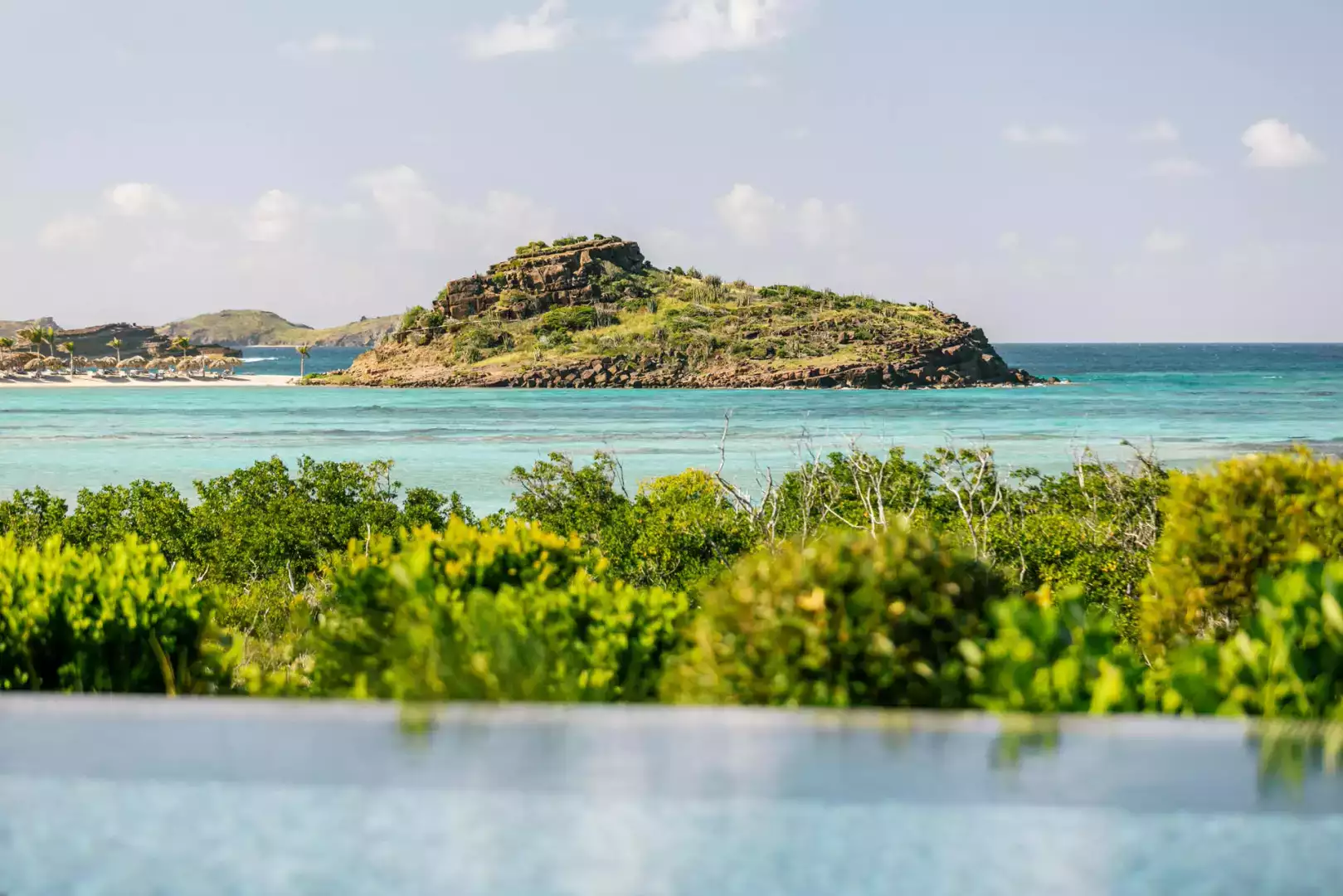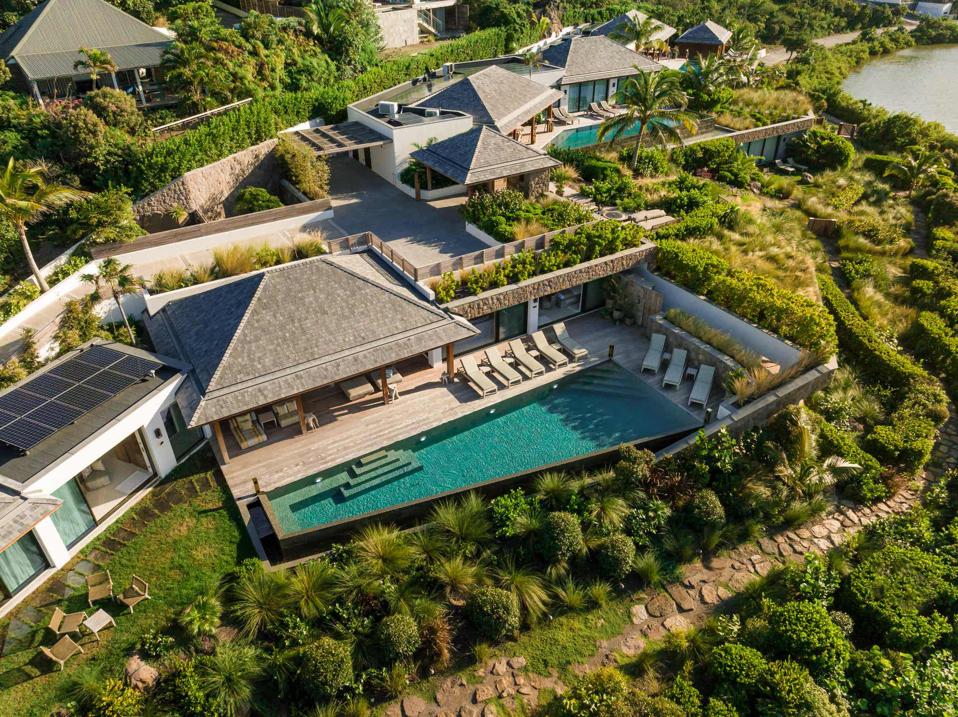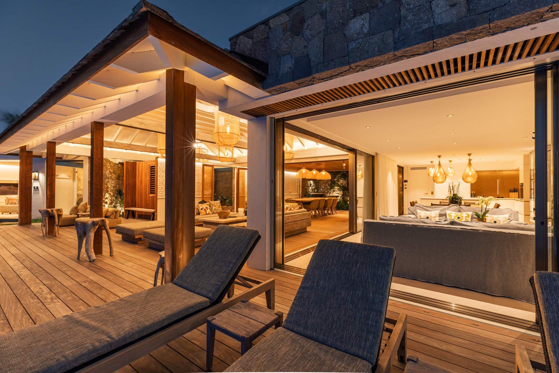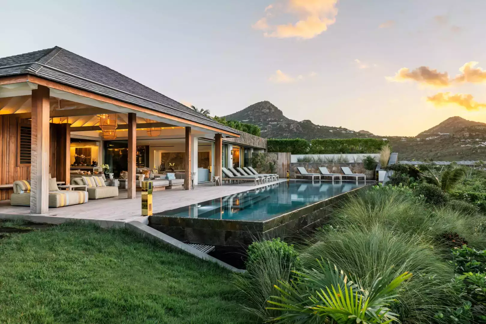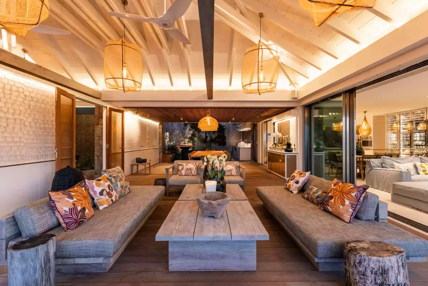 Villa Lazuli is one of those places where the holiday feeling hits instantly. Overlooking the turquoise lagoon of Grand Cul-de-Sac, it blends contemporary design, warm natural materials, and a soothing connection to nature. The main living spaces open widely onto the terrace, inviting you to enjoy sunshine, sea breeze, and total relaxation. The large air-conditioned great room flows seamlessly toward the outdoor lounge, creating an effortless indoor-outdoor lifestyle.