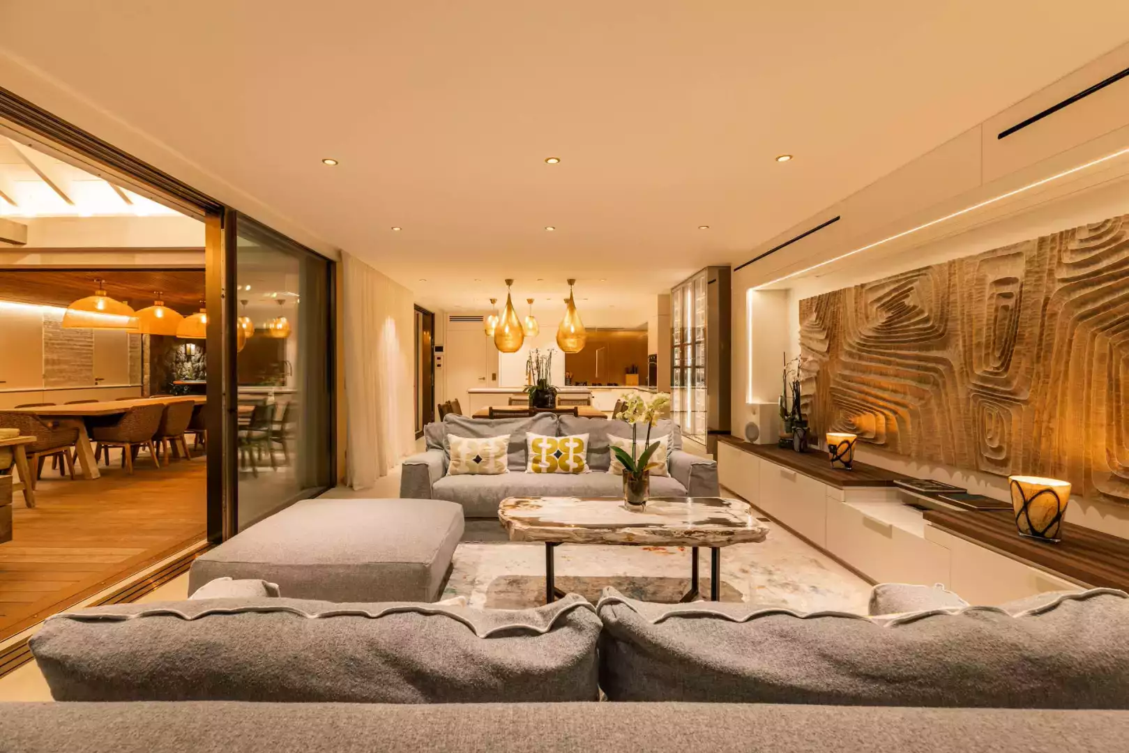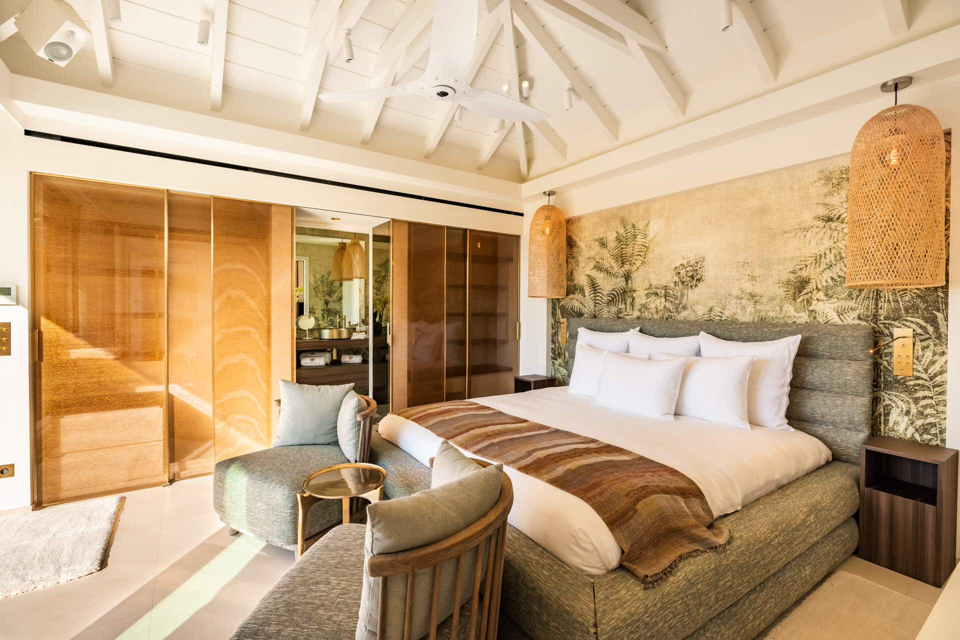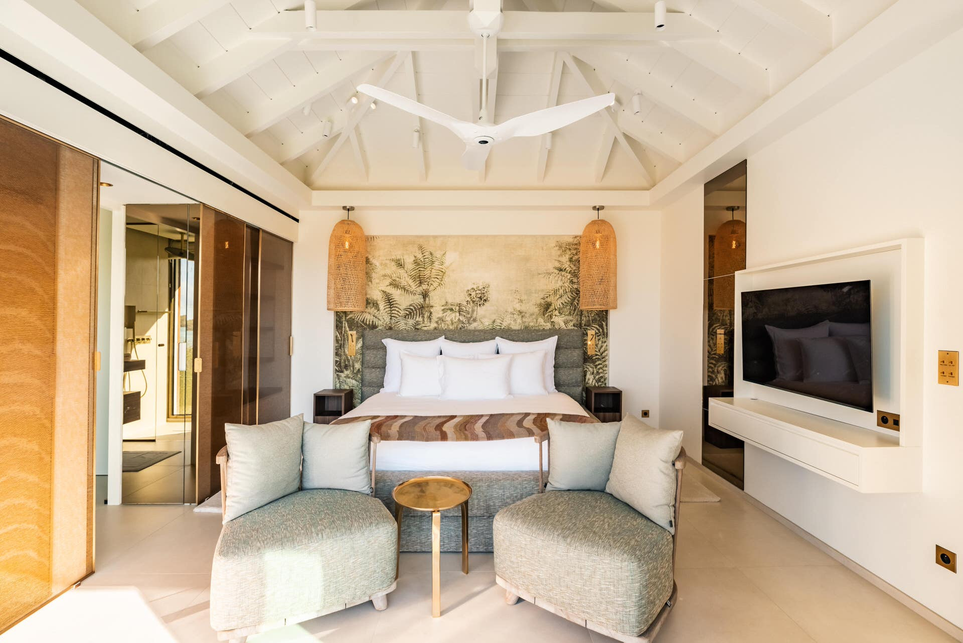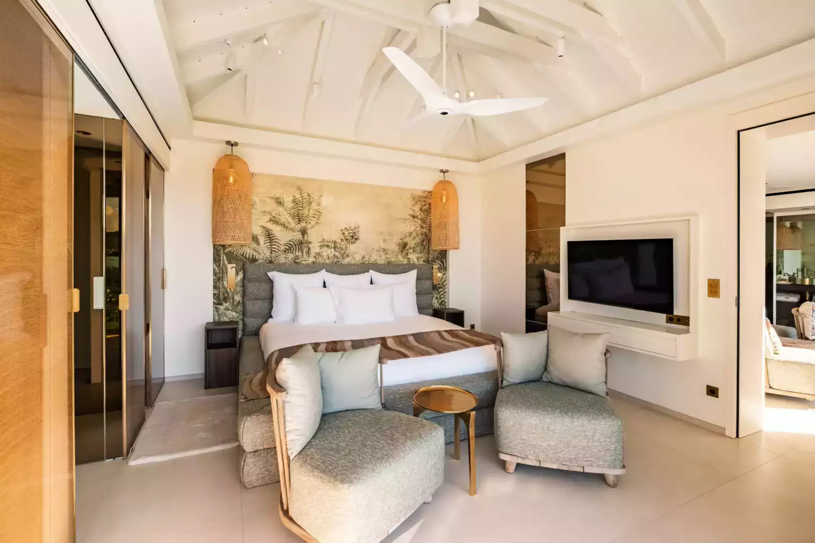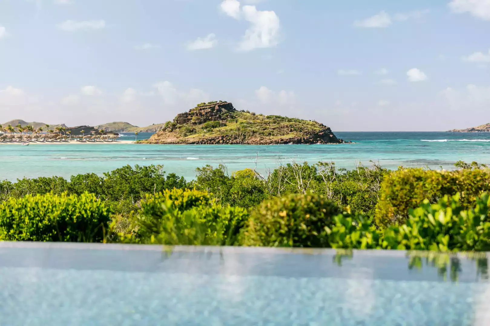 Villa Lazuli is one of those places where the holiday feeling hits instantly. Overlooking the turquoise lagoon of Grand Cul-de-Sac, it blends contemporary design, warm natural materials, and a soothing connection to nature. The main living spaces open widely onto the terrace, inviting you to enjoy sunshine, sea breeze, and total relaxation. The large air-conditioned great room flows seamlessly toward the outdoor lounge, creating an effortless indoor-outdoor lifestyle.