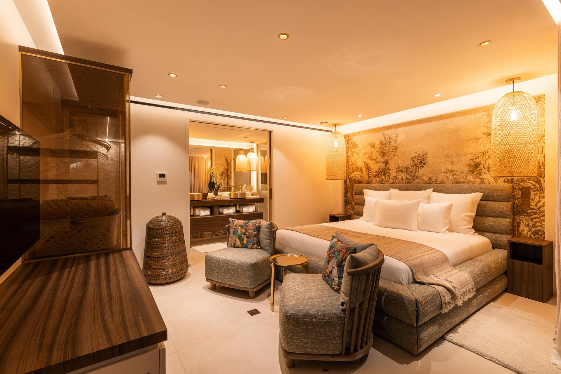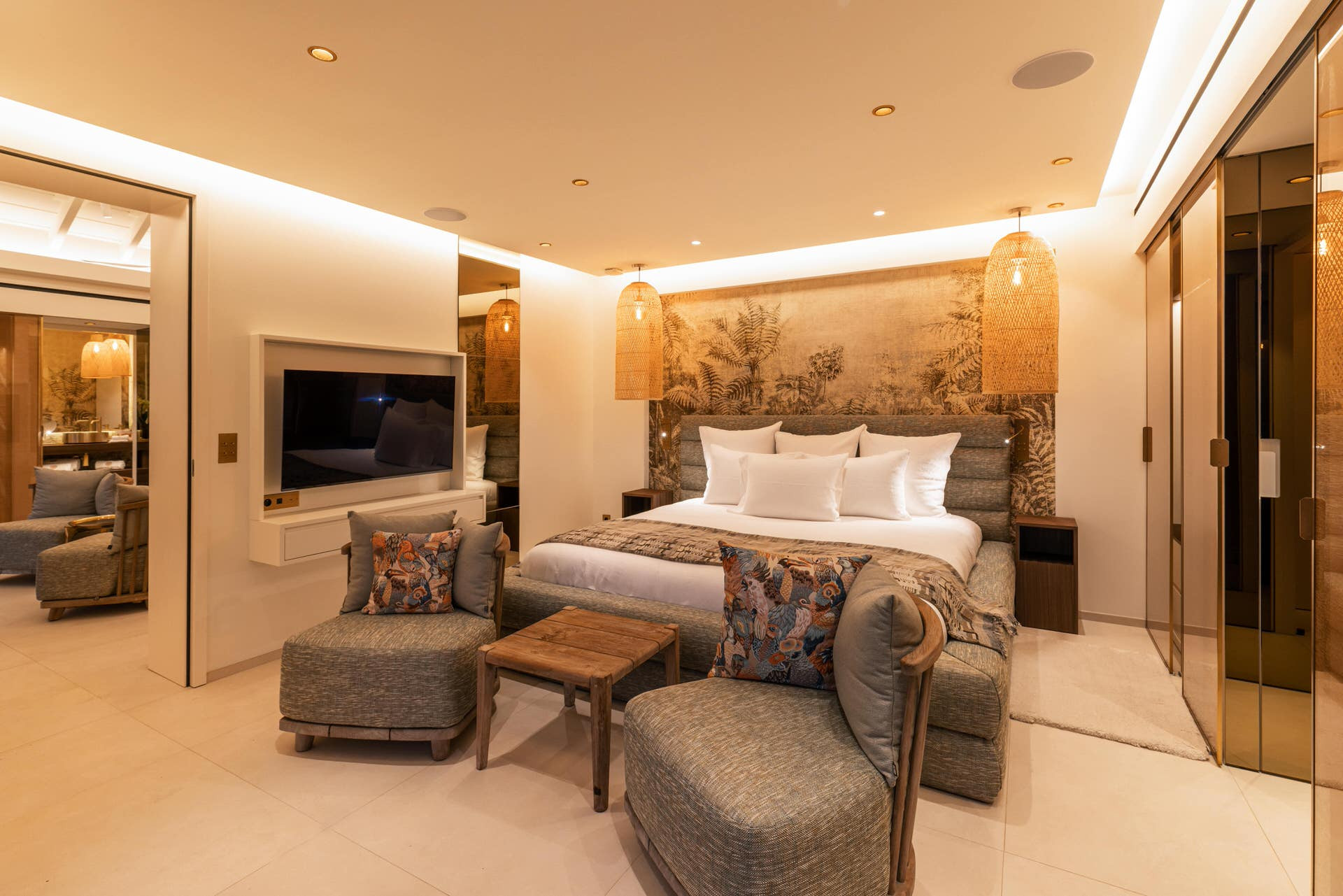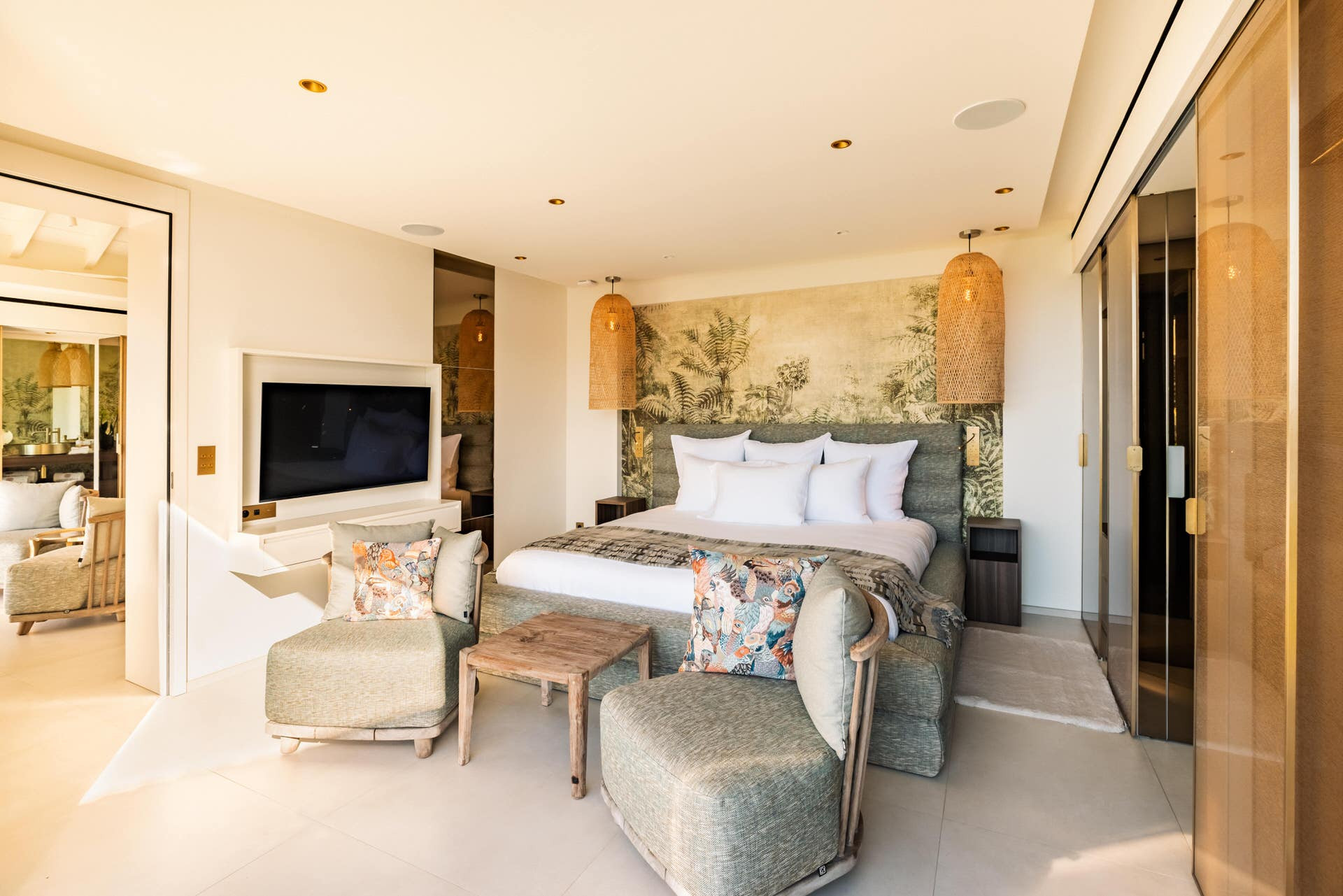 Located on the lower level. King size bed (180 cm), A/C, HD-TV (French & US satellite, Apple TV), Sonos sound system, iPad control, dressing, safe. Ensuite bathroom with indoor shower, double sink, hairdryer, bathrobes. Opens to garden and sea view.