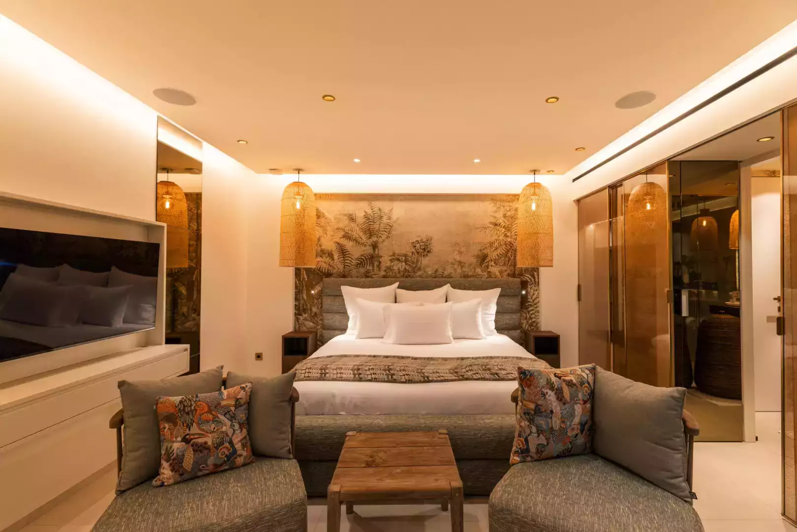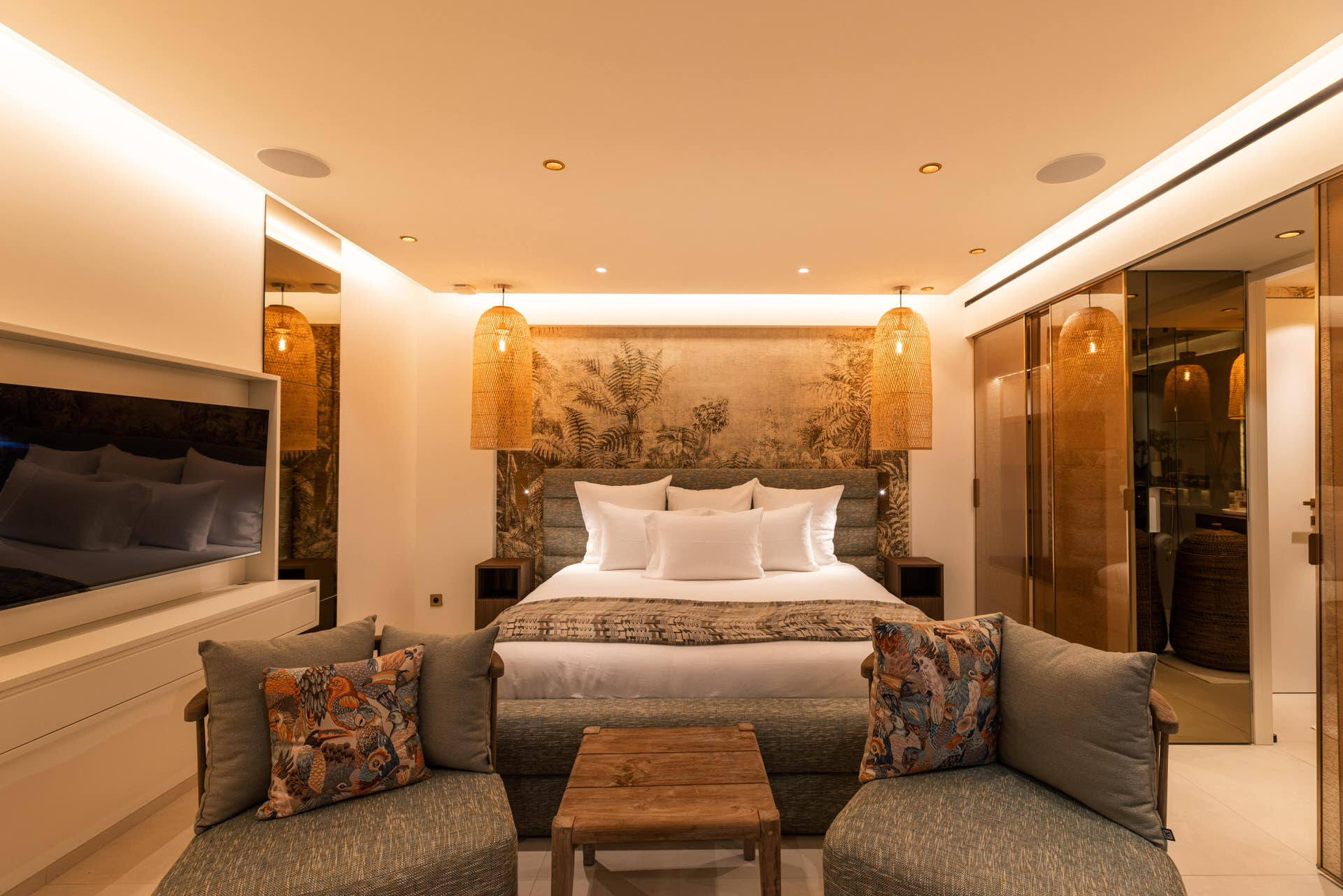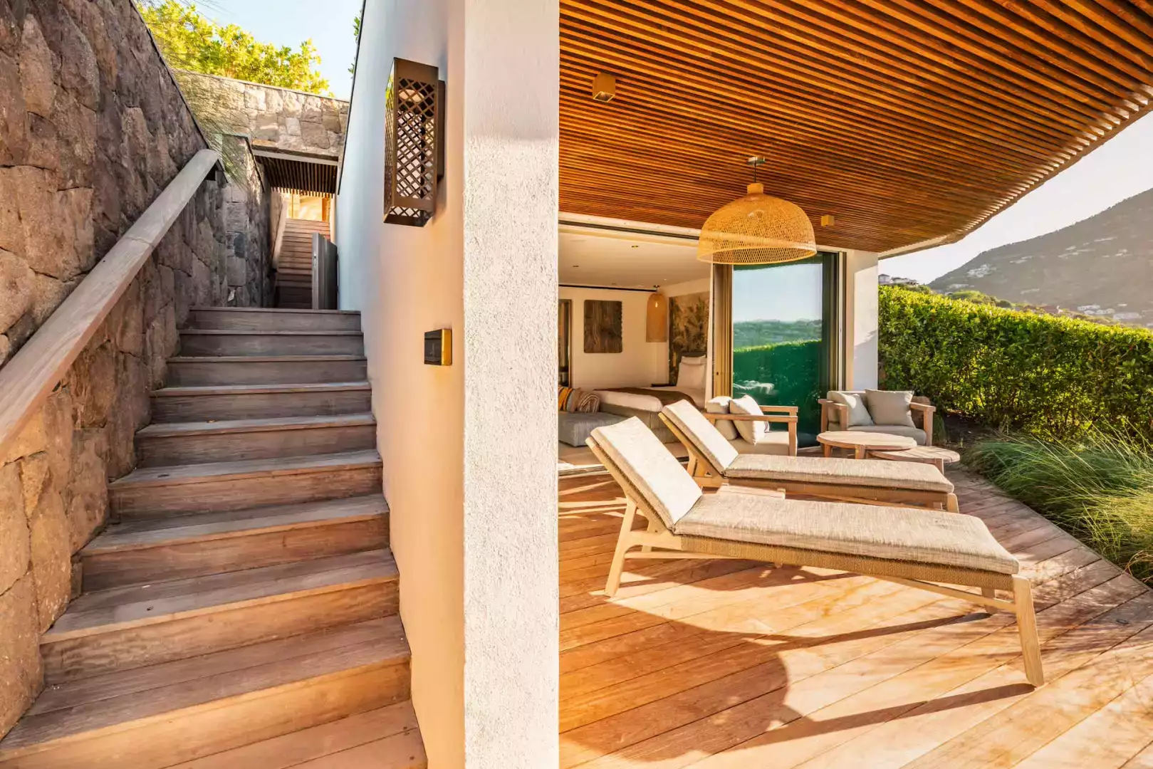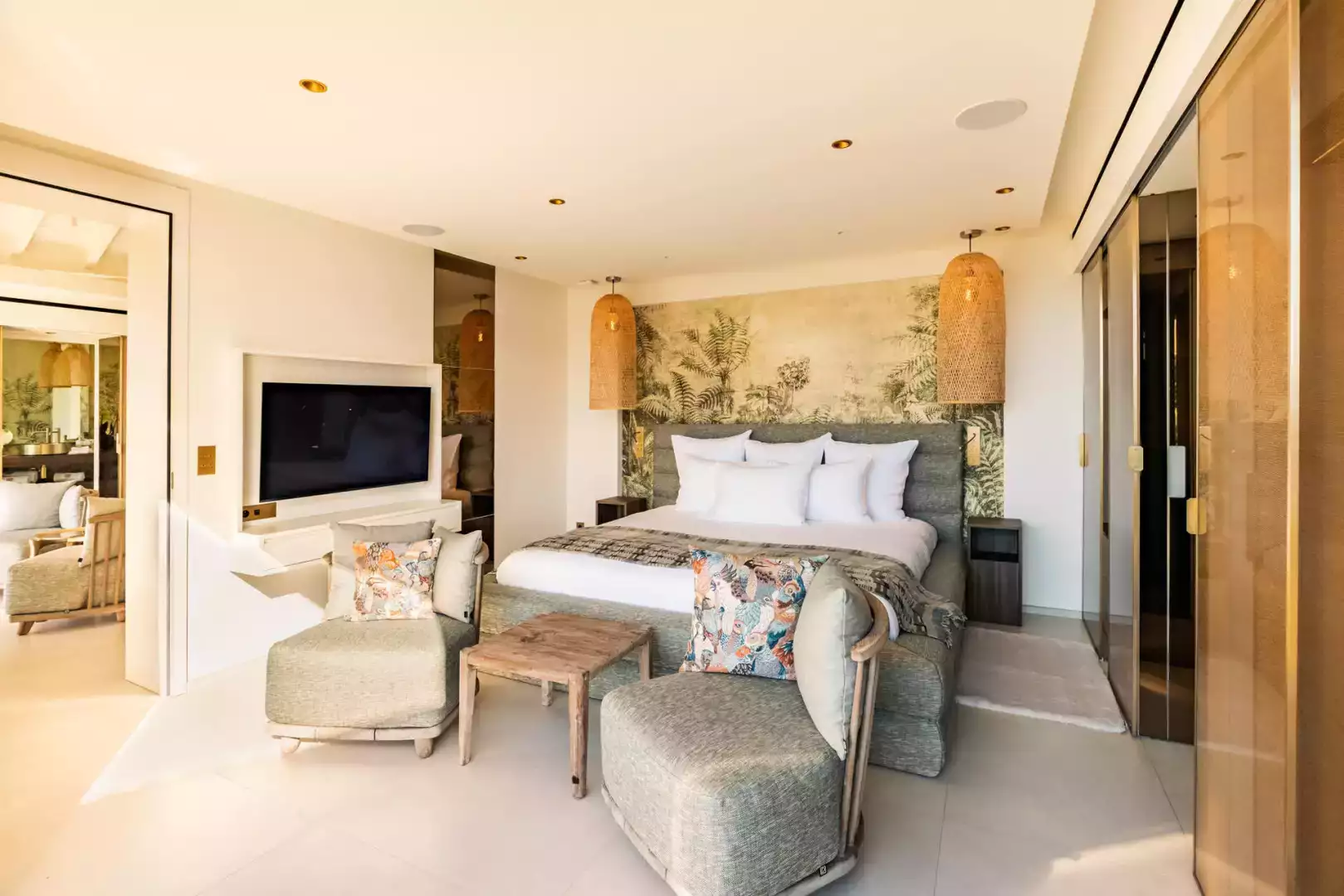Located on the lower level. King size bed (180 cm), A/C, HD-TV (French & US satellite, Apple TV), Sonos sound system, iPad control, dressing, safe. Ensuite bathroom with indoor shower, double sink, hairdryer, bathrobes. Opens to garden and sea view.