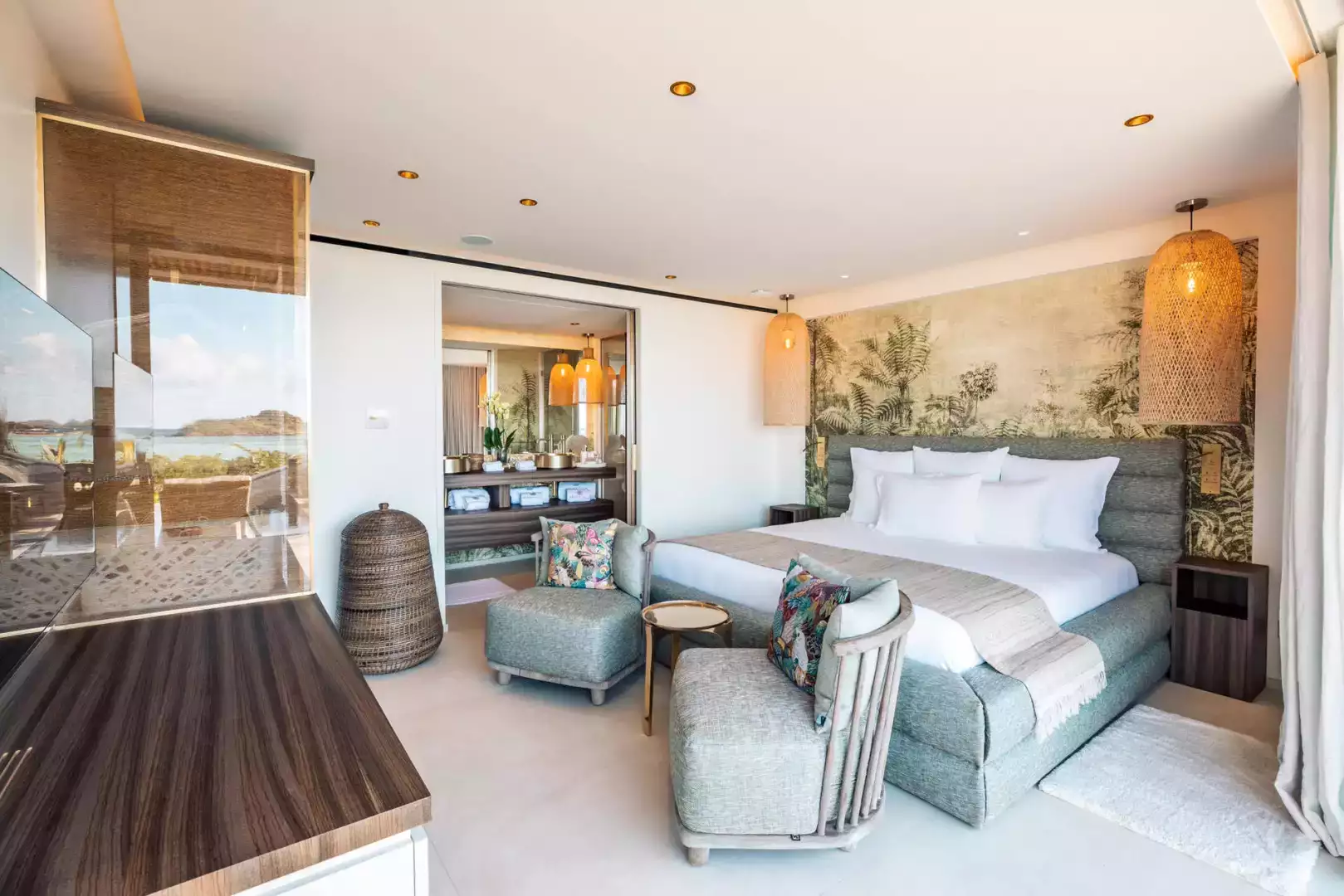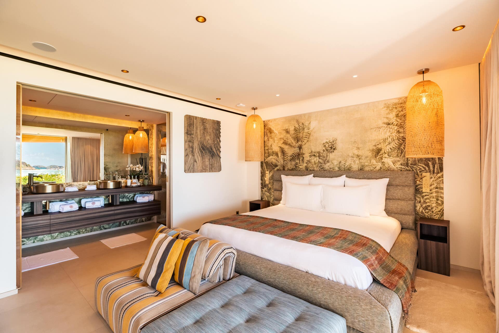 Located on the main level. King size bed (180 cm), A/C, HD-TV (French & US satellite, Apple TV), Sonos sound system, iPad control, dressing, safe. Ensuite bathroom with indoor shower, double sink, hairdryer, bathrobes. Opens to sea view. Connects to bedroom 2.