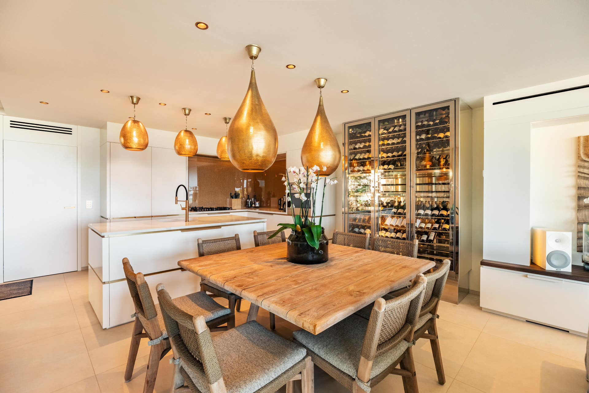 The elegant, fully equipped kitchen is perfect for casual breakfasts or dinners overlooking the water. Each of the four bedrooms offers a king-size bed, a private ensuite bathroom, and the comfort of a boutique hotel. Two bedrooms connect—ideal for families—while the lower-level suite enjoys extra privacy with its own garden and sea view.