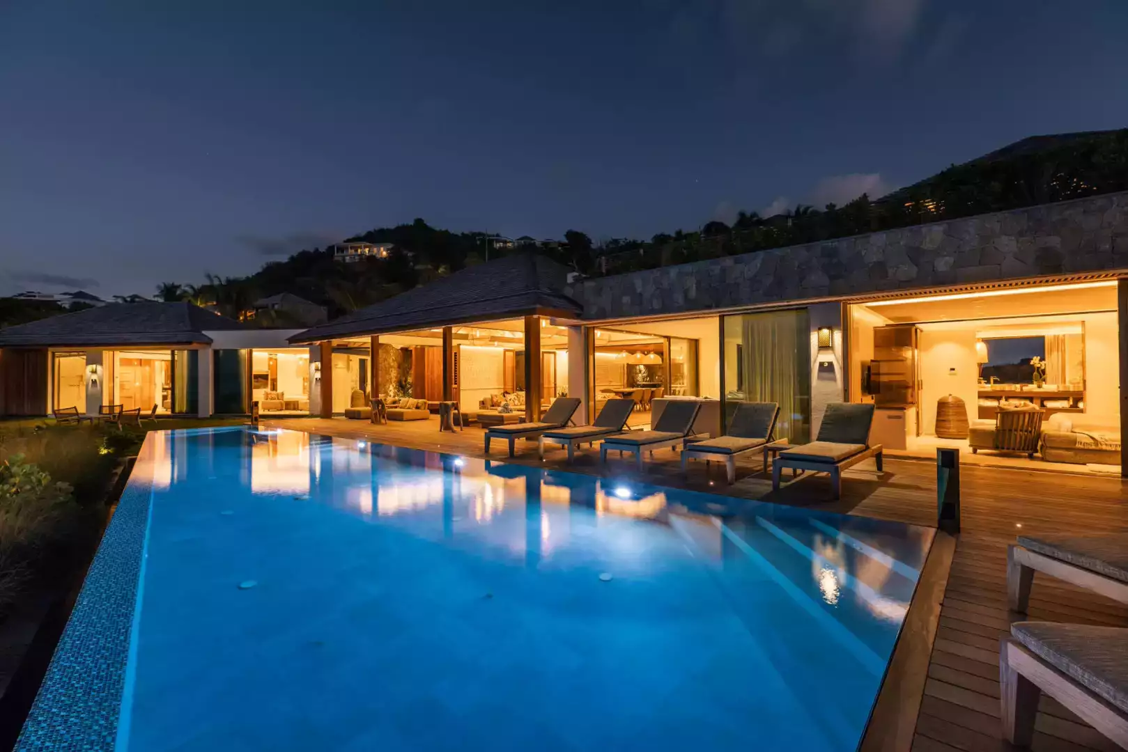Large heated infinity pool, terrace with multiple lounge chairs, gas BBQ.