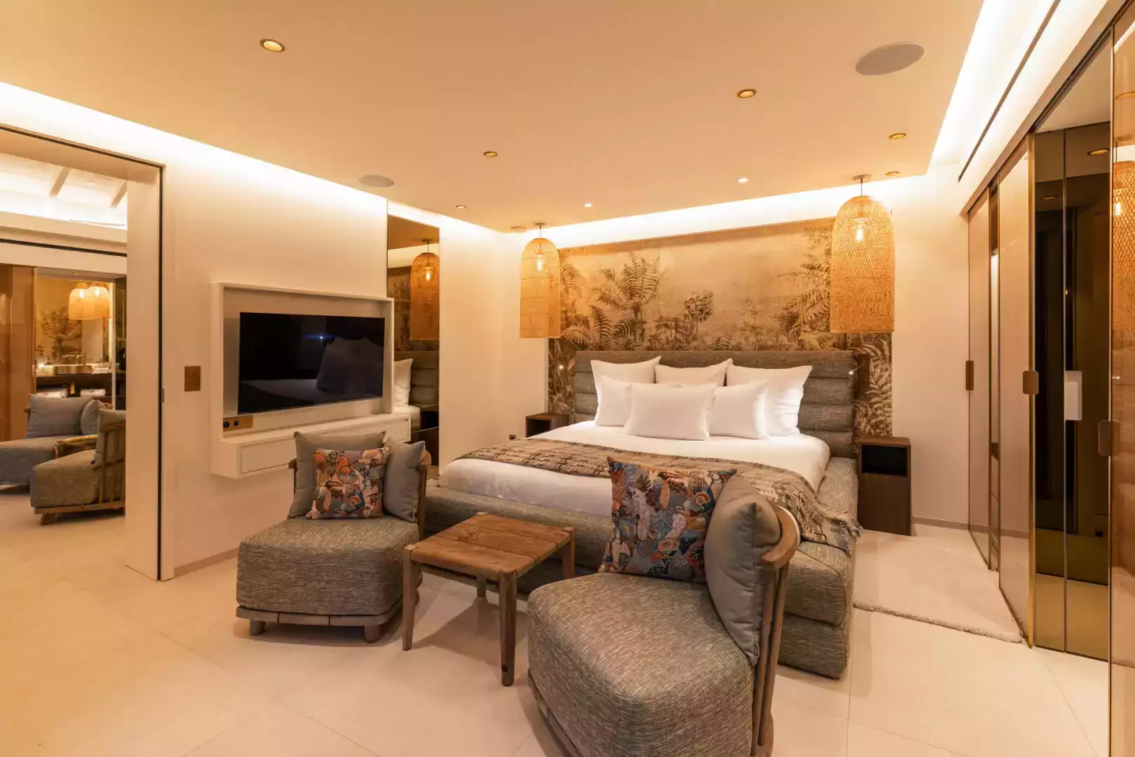 Located on the main level. King size bed (180 cm), A/C, HD-TV (French & US satellite, Apple TV), Sonos sound system, iPad control, dressing, safe. Ensuite bathroom with indoor shower, double sink, hairdryer, bathrobes. Opens onto the terrace with sea view.