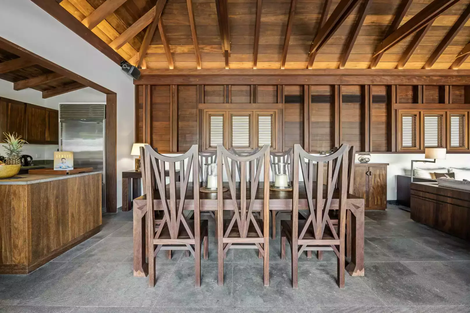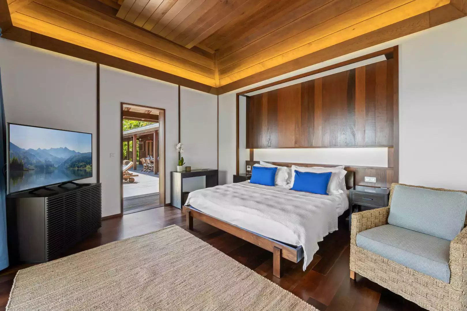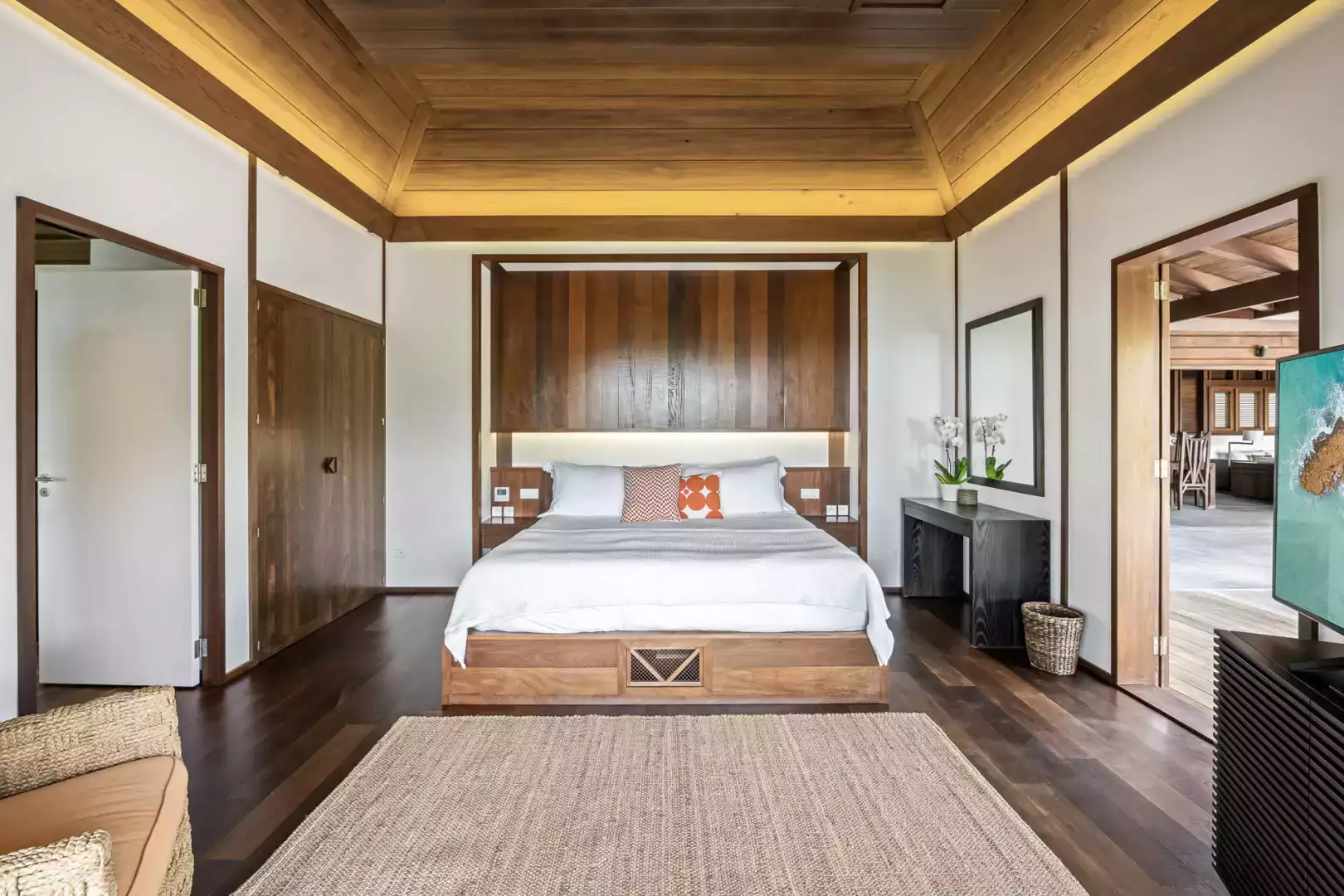 The three bedrooms are situated in separate bungalows, each with its own ensuite bathroom and a beautiful view of the lagoon. The largest bedroom boasts a private terrace for added privacy.