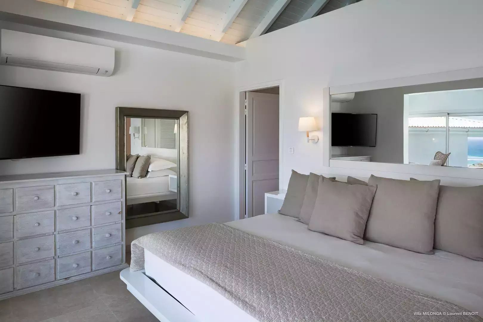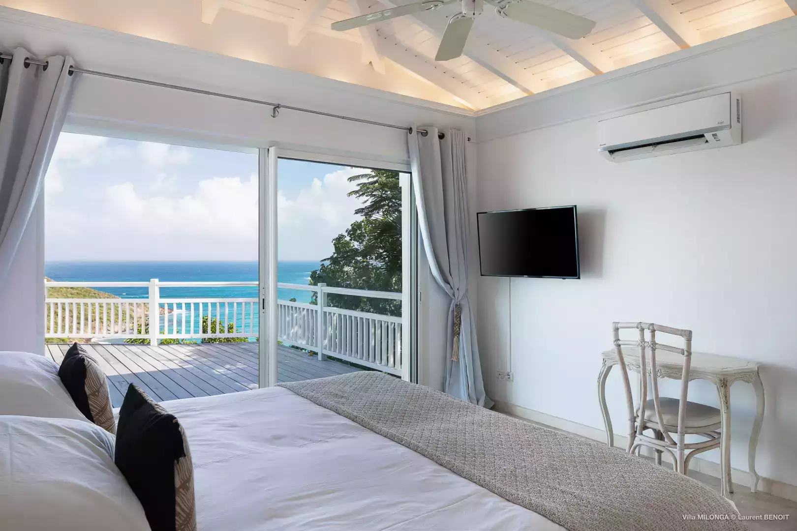 King size bed (180 cm), A/C, ceiling fan, sea view, ensuite bathroom with shower and toilet, Apple TV and Direct TV, hairdryer, safe Connects to Bedroom 3