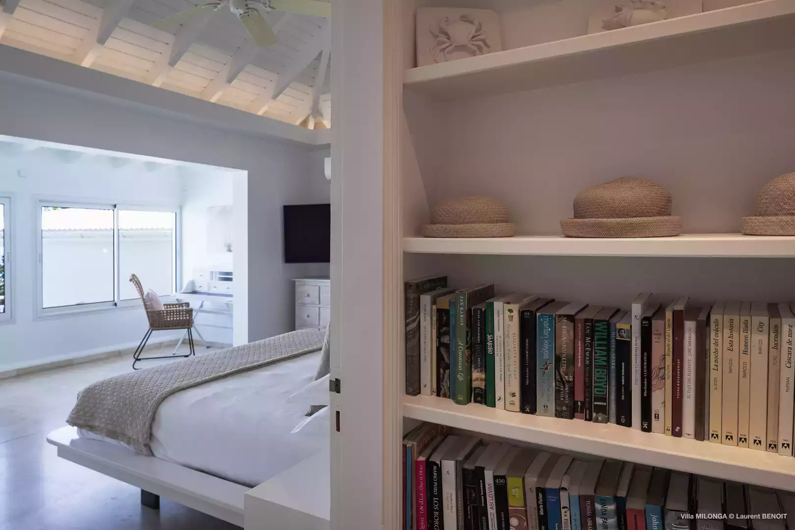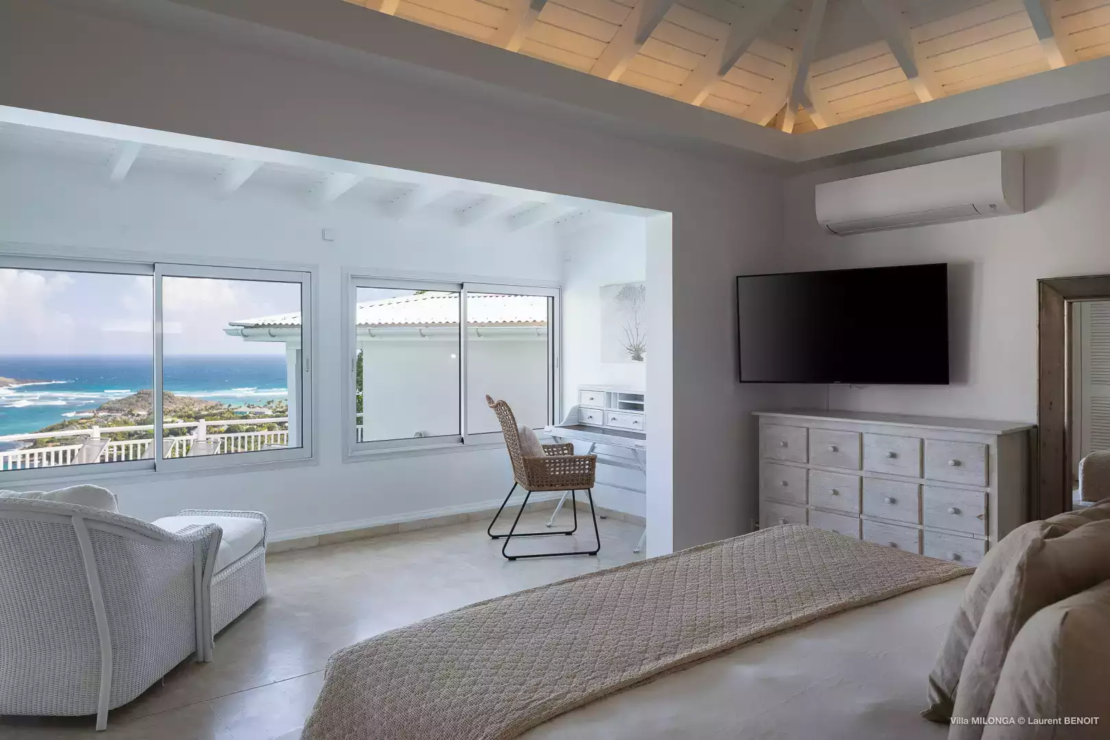 Located next to the living room, King size bed (180 cm), A/C, ceiling fan, sea view, ensuite bathroom with shower and toilet, Apple TV and Direct TV, hairdryer, safe