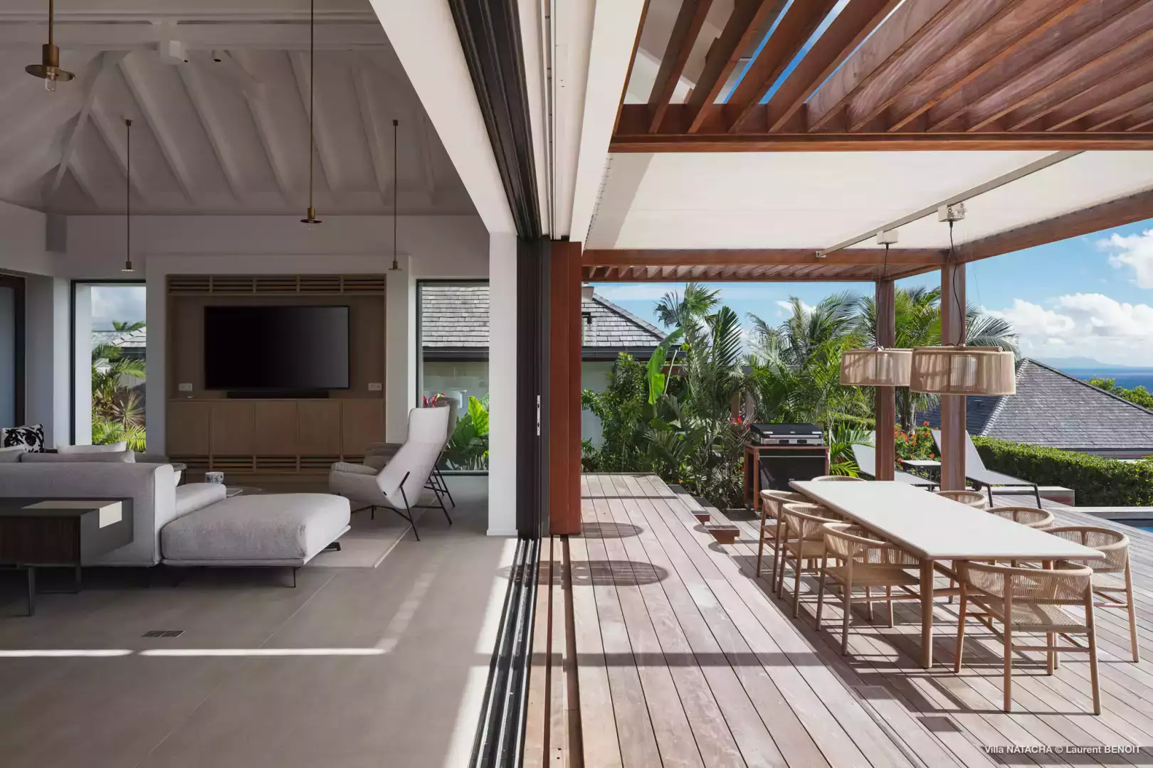 Tucked away in a private estate in Gouverneur, Villa Natacha is a contemporary jewel overlooking the turquoise waters of the Caribbean Sea. From the very first step inside, the open design and natural light create an atmosphere where architecture and nature blend seamlessly. The expansive wooden deck features a heated infinity pool, the perfect spot to soak up the sun or enjoy a magical sunset.