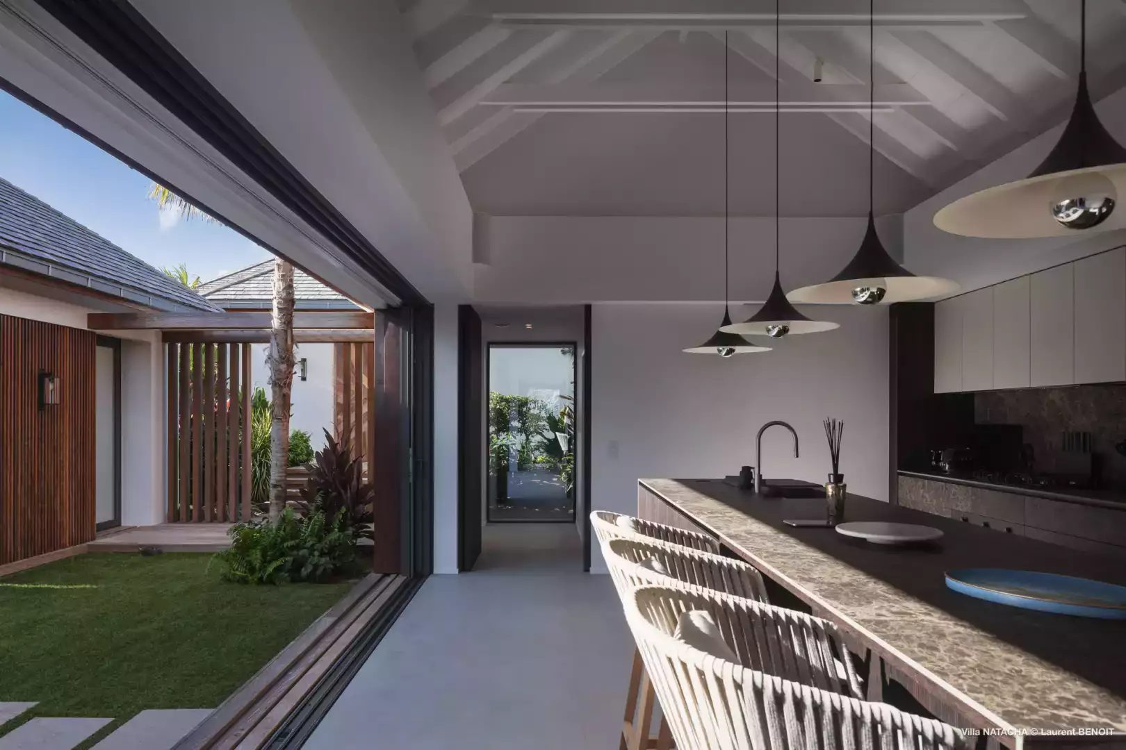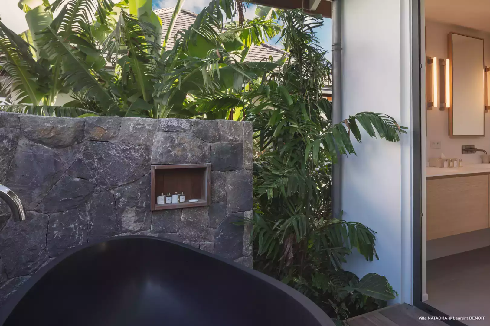 The villa offers five ocean-view bedrooms, each with king-size beds, en-suite bathrooms, and private terraces. The master suite goes even further, with a stunning outdoor bathtub that turns every evening into a unique tropical ritual.