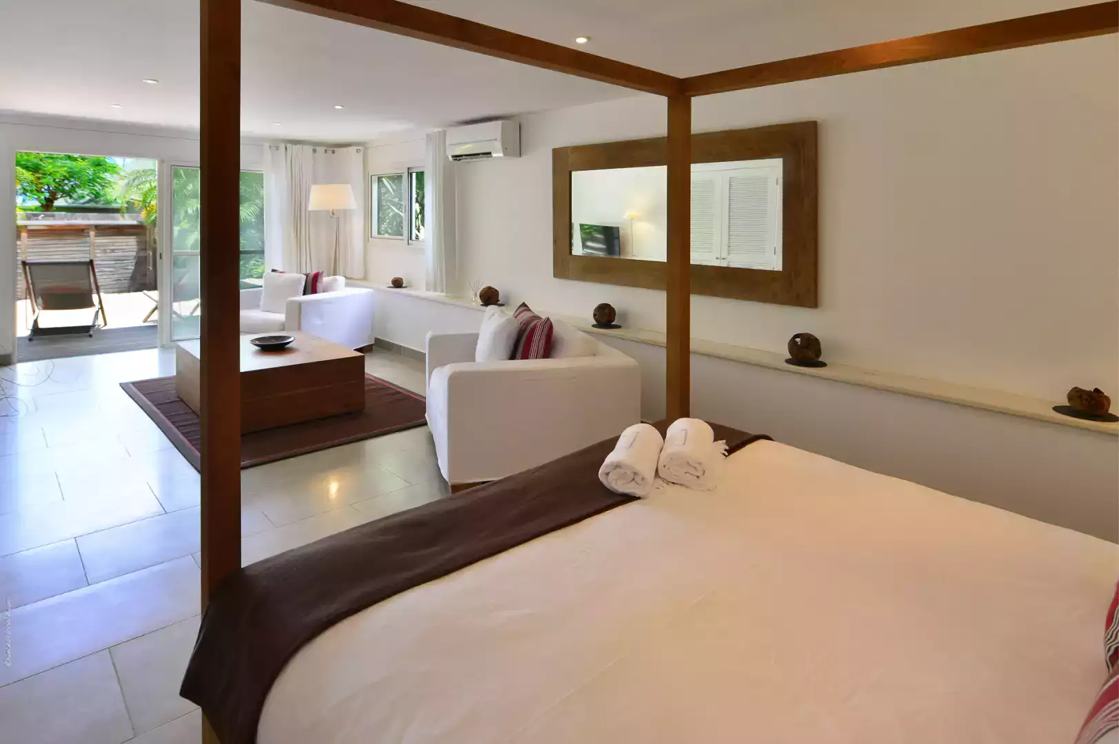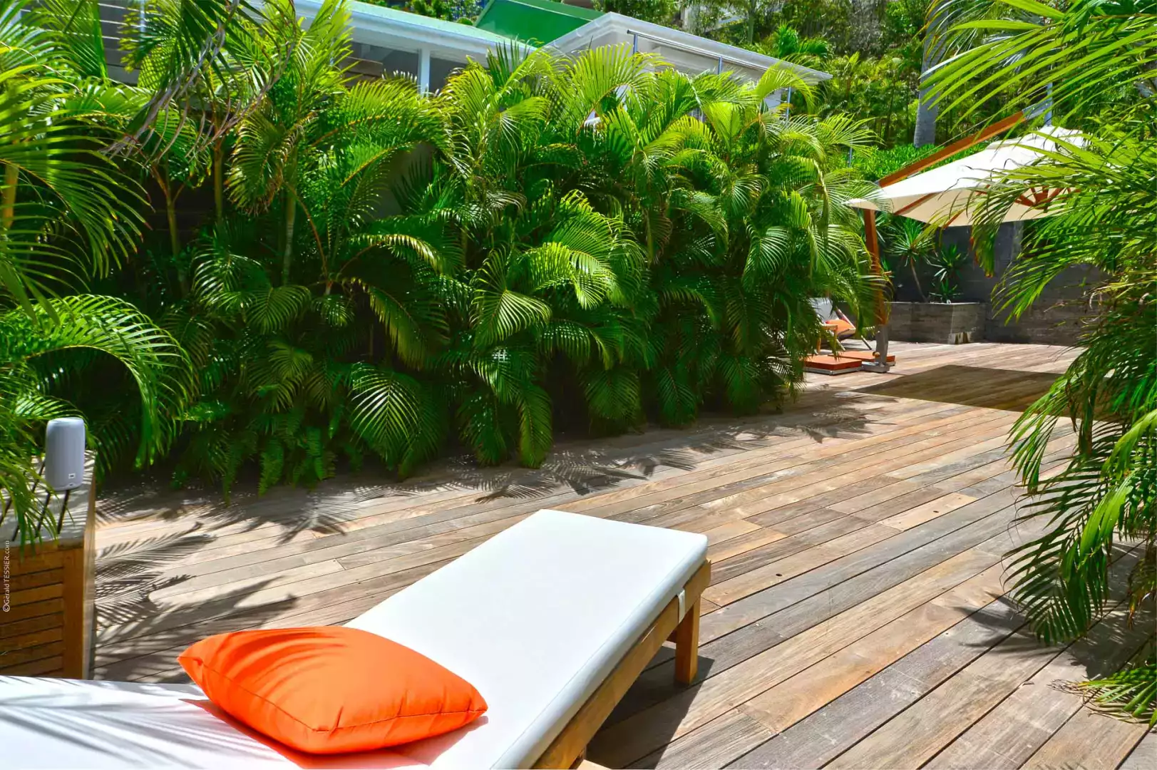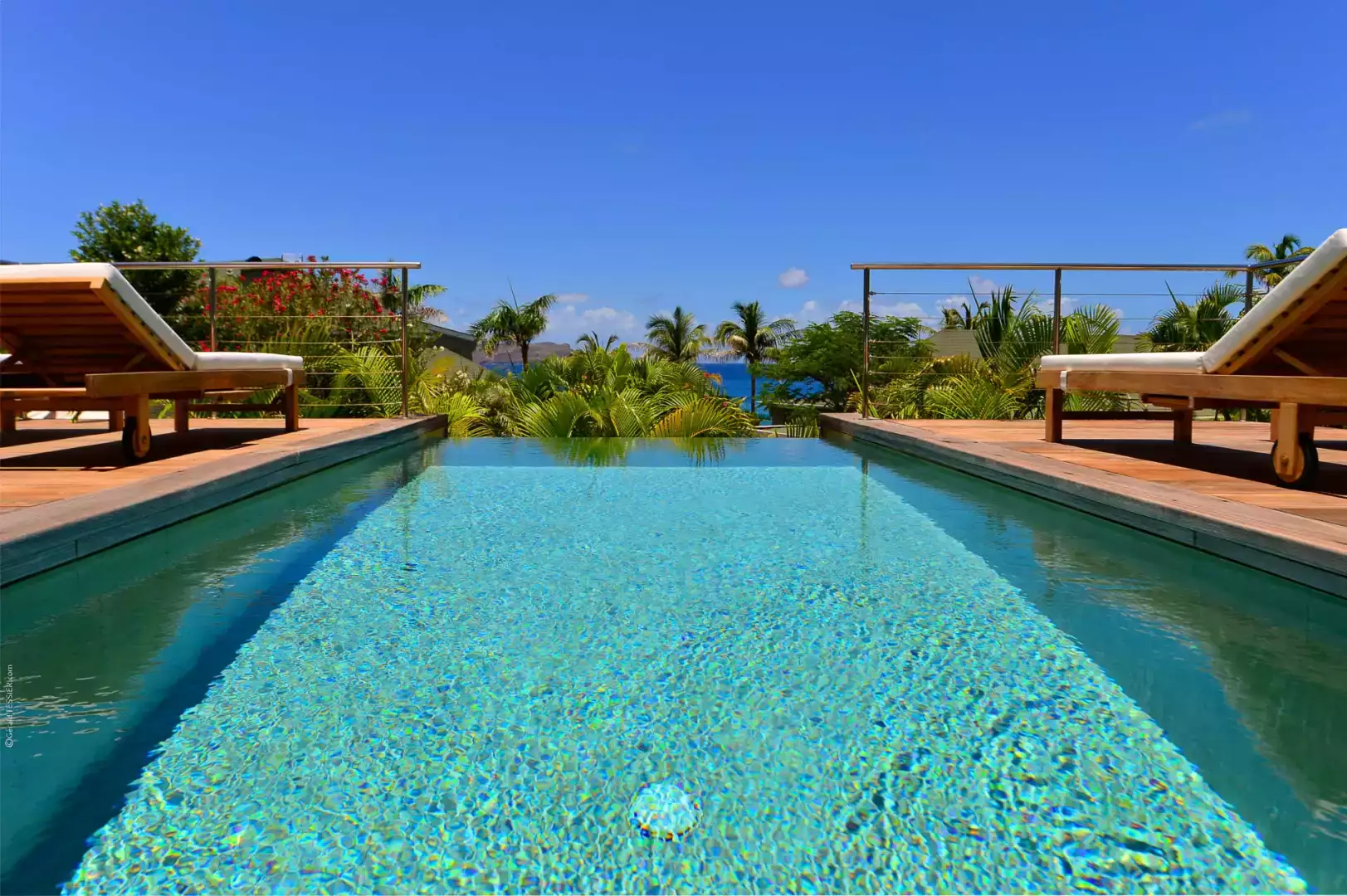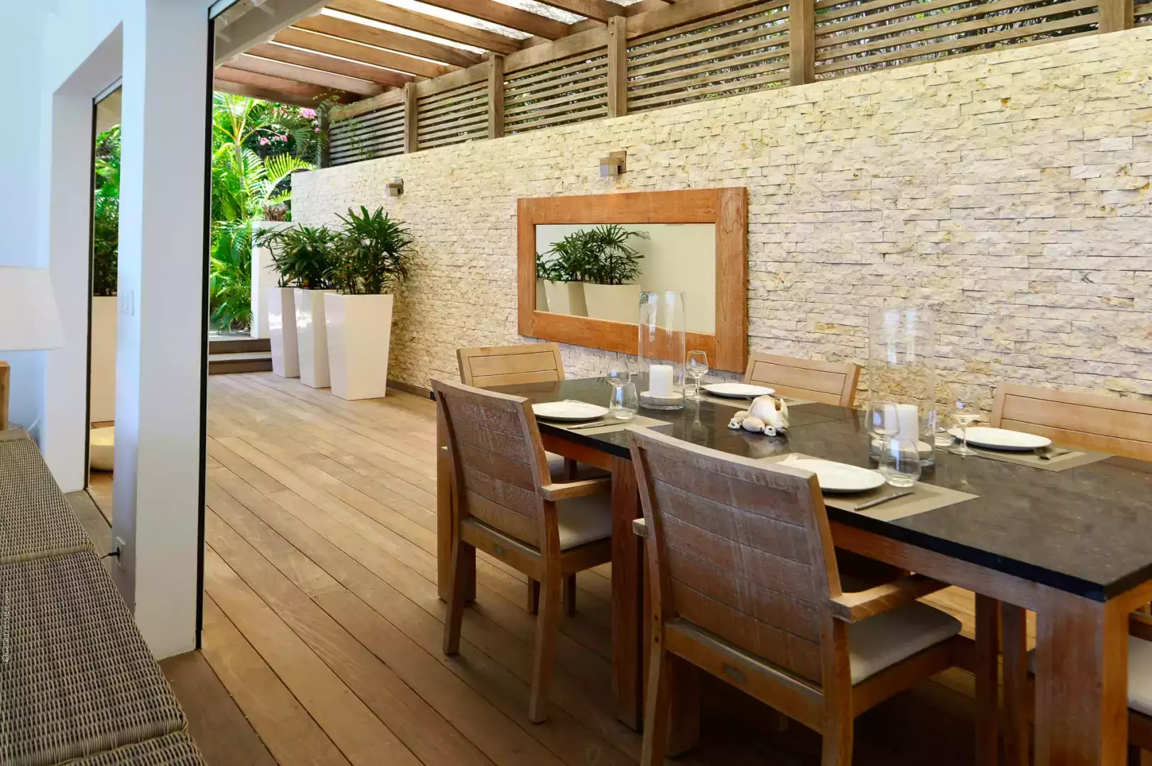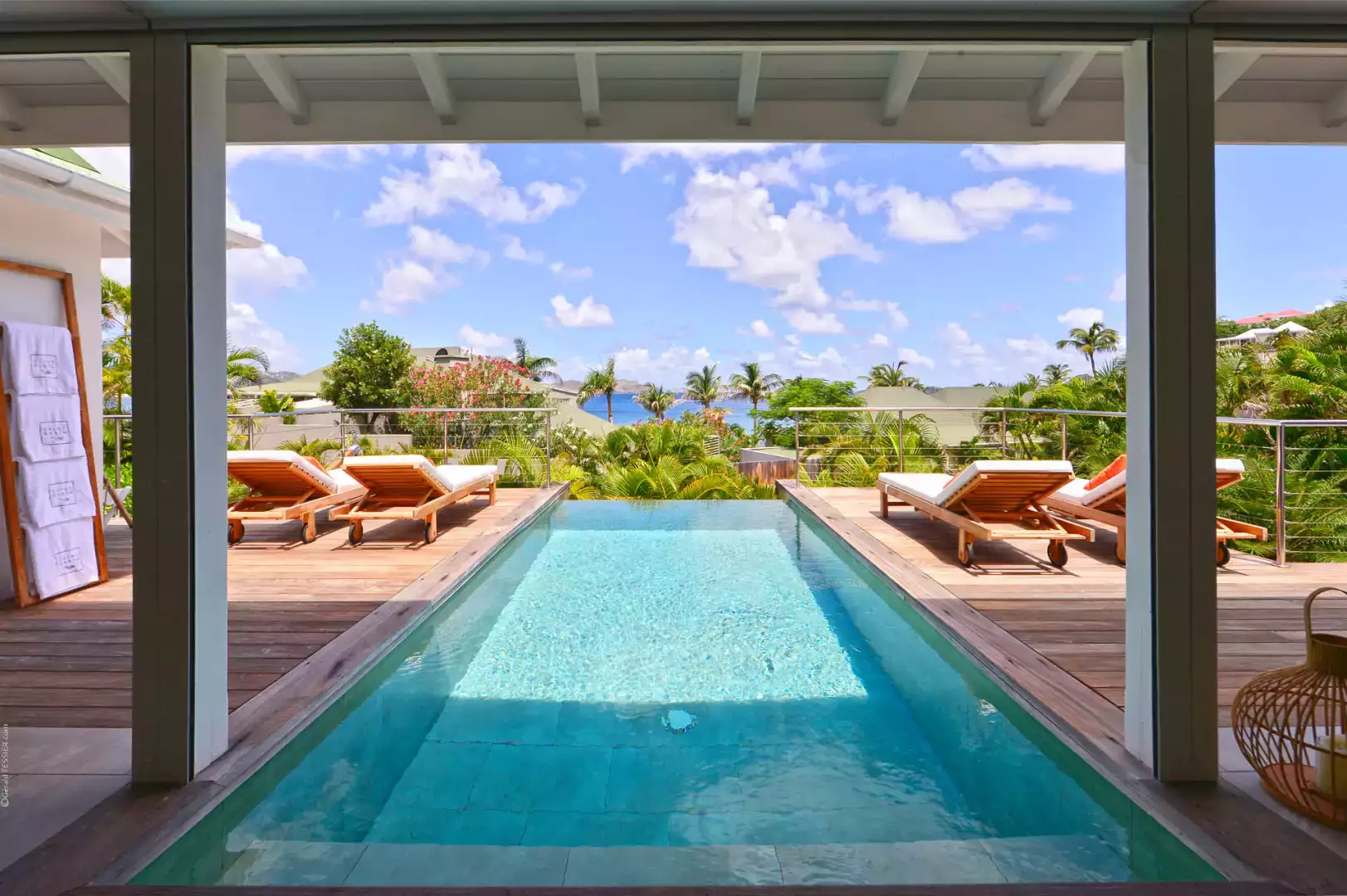 The inviting pool is partially covered to provide a respite from the sun, complemented by a generous wooden terrace complete with double sunbeds.
