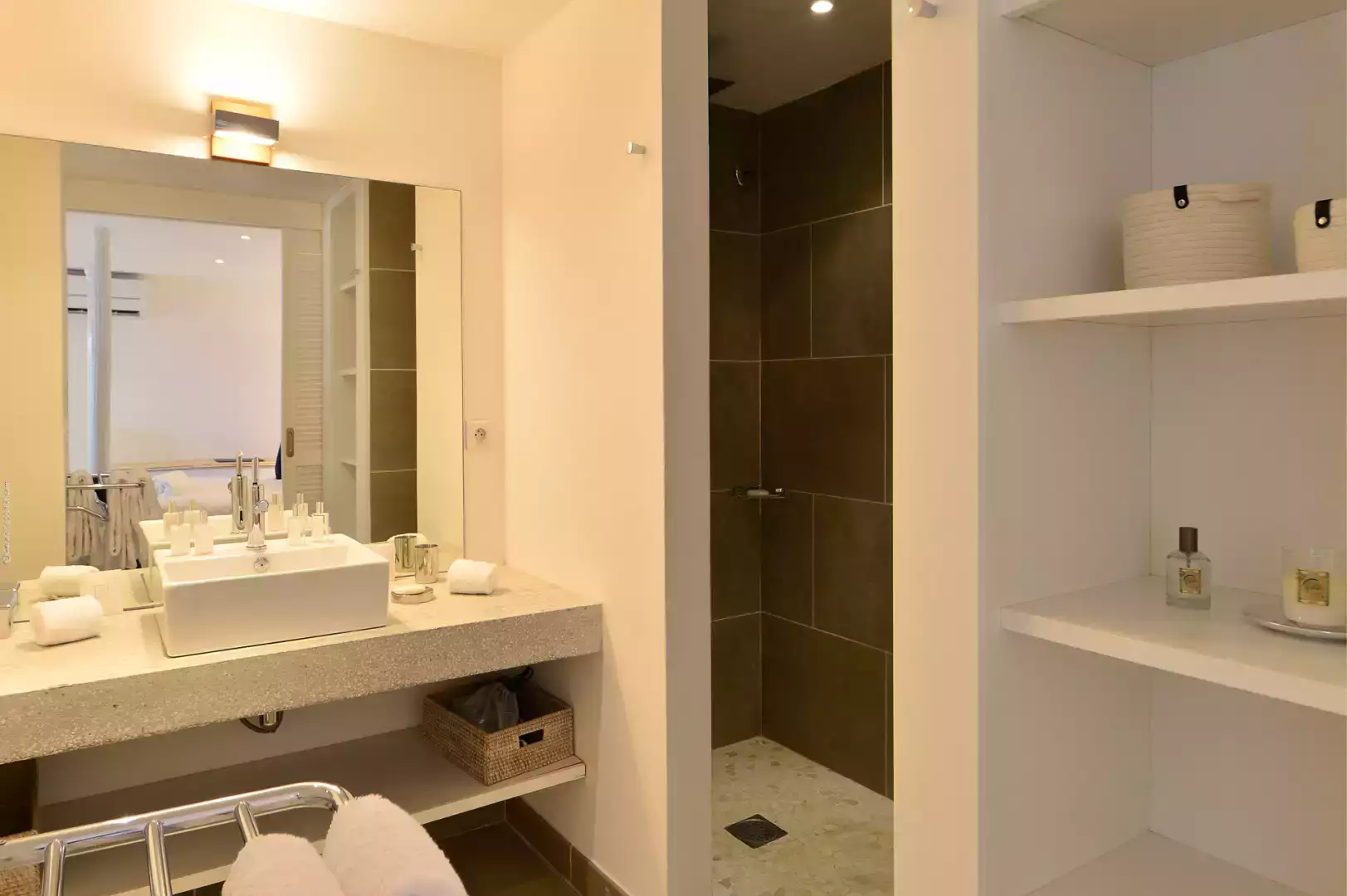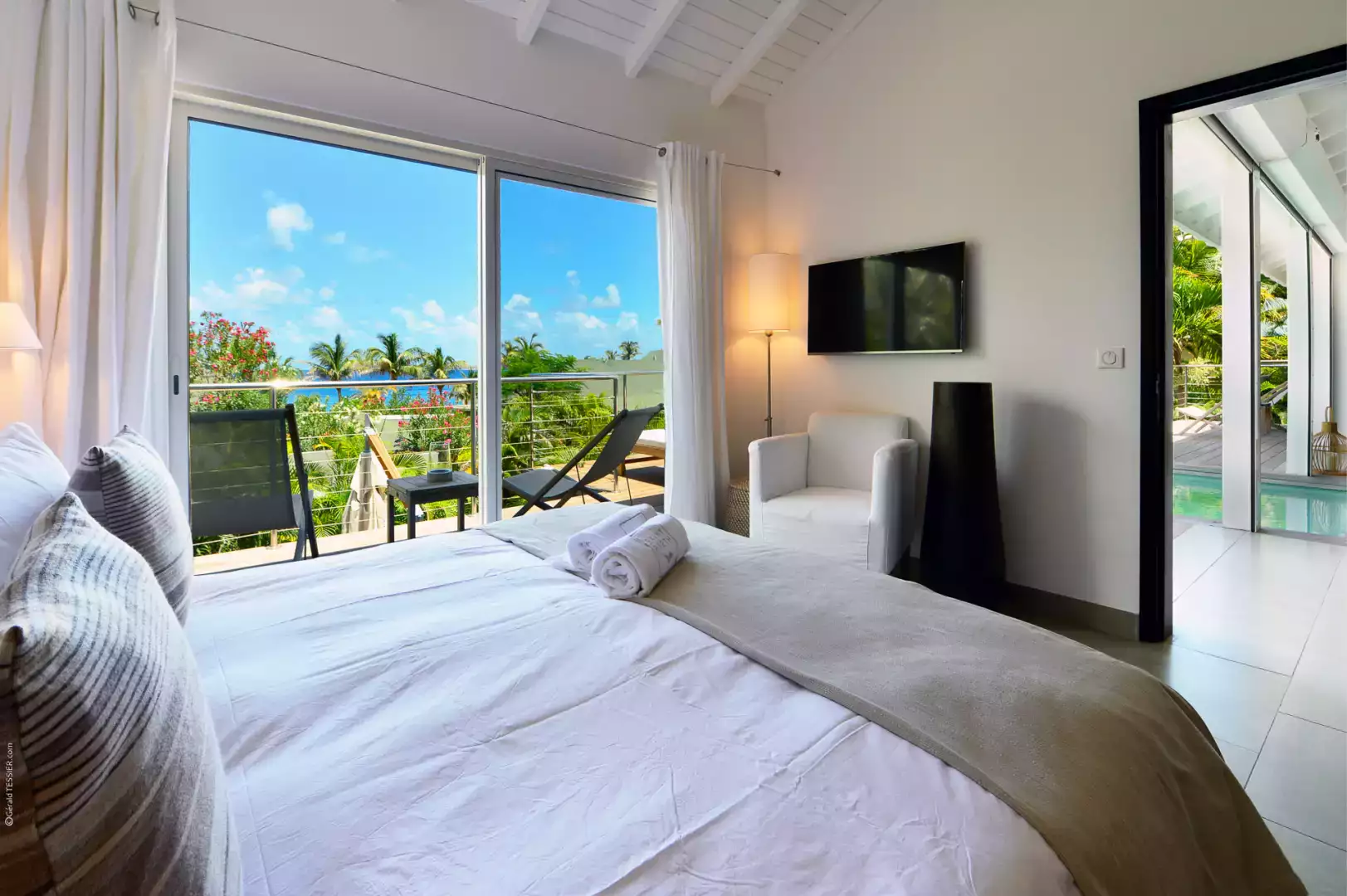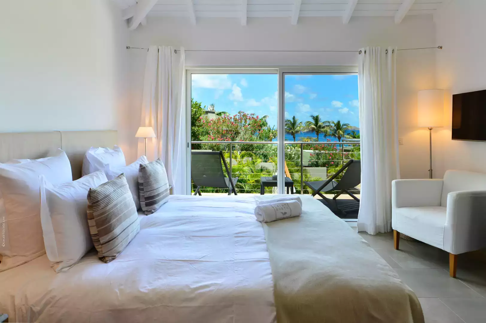 Euro king size bed (180 cm), vue mer, A/C, TV (Apple TV), adjacent bathroom with shower and toilet, hair dryer, safe.