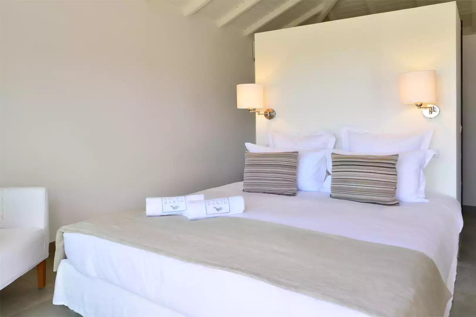 Housekeeping every day (except Sundays and public holidays), Wifi, greeting at the airport or ferry, a welcome basket including a bottle of wine or Champagne, linen, bath and beach towels