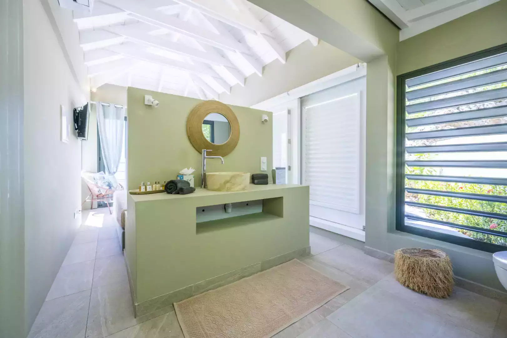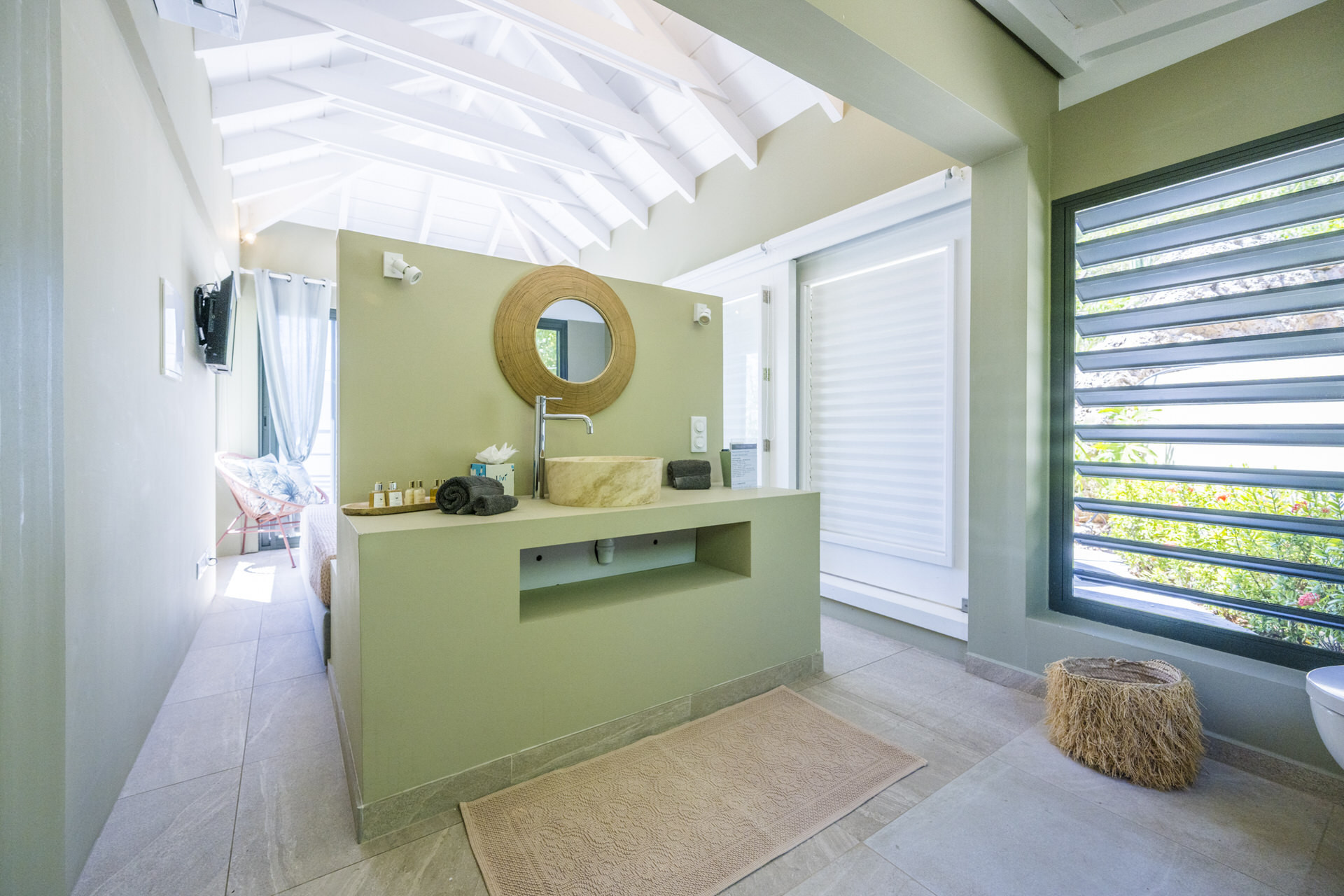 Large bedroom in a separate bungalow, queen size bed, sea view, air-conditioning, ensuite bathroom with shower and toilet, hairdryer, safe, TV (french satellite), small fridge, training bike, terrace