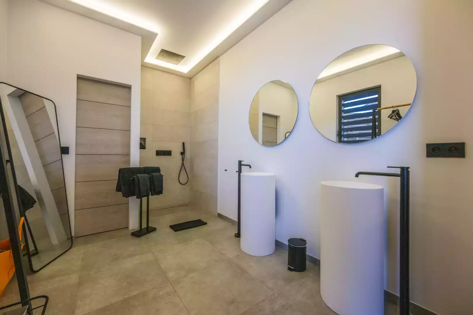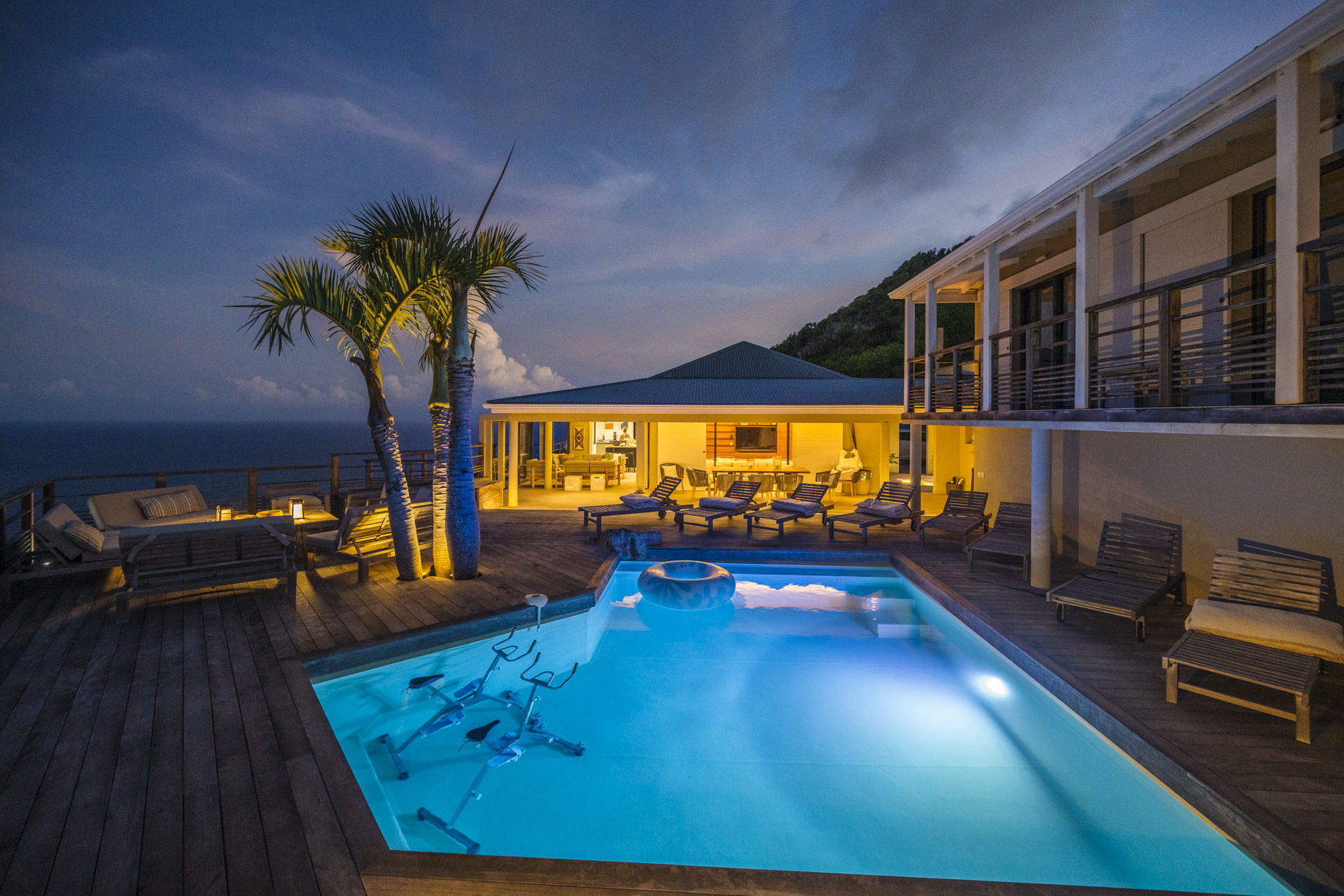 The living room, also air-conditioned, combines comfort with elegance and opens up to stunning vistas. A unique feature of the villa is its swimming pool, equipped with aquabikes, perfect for both relaxation and aquatic workouts.