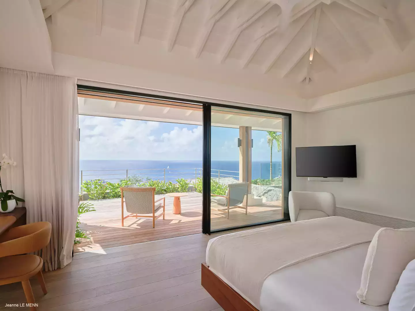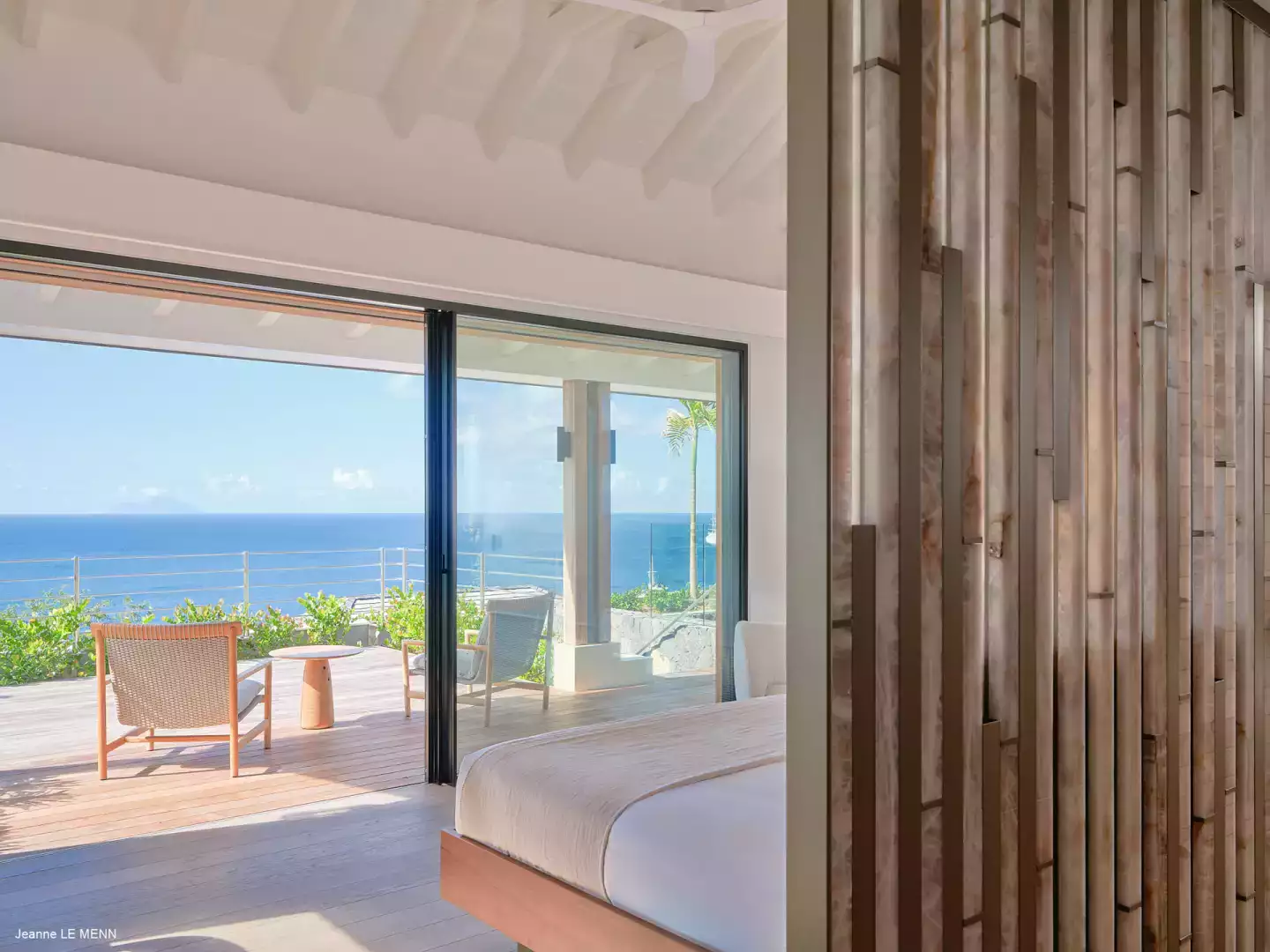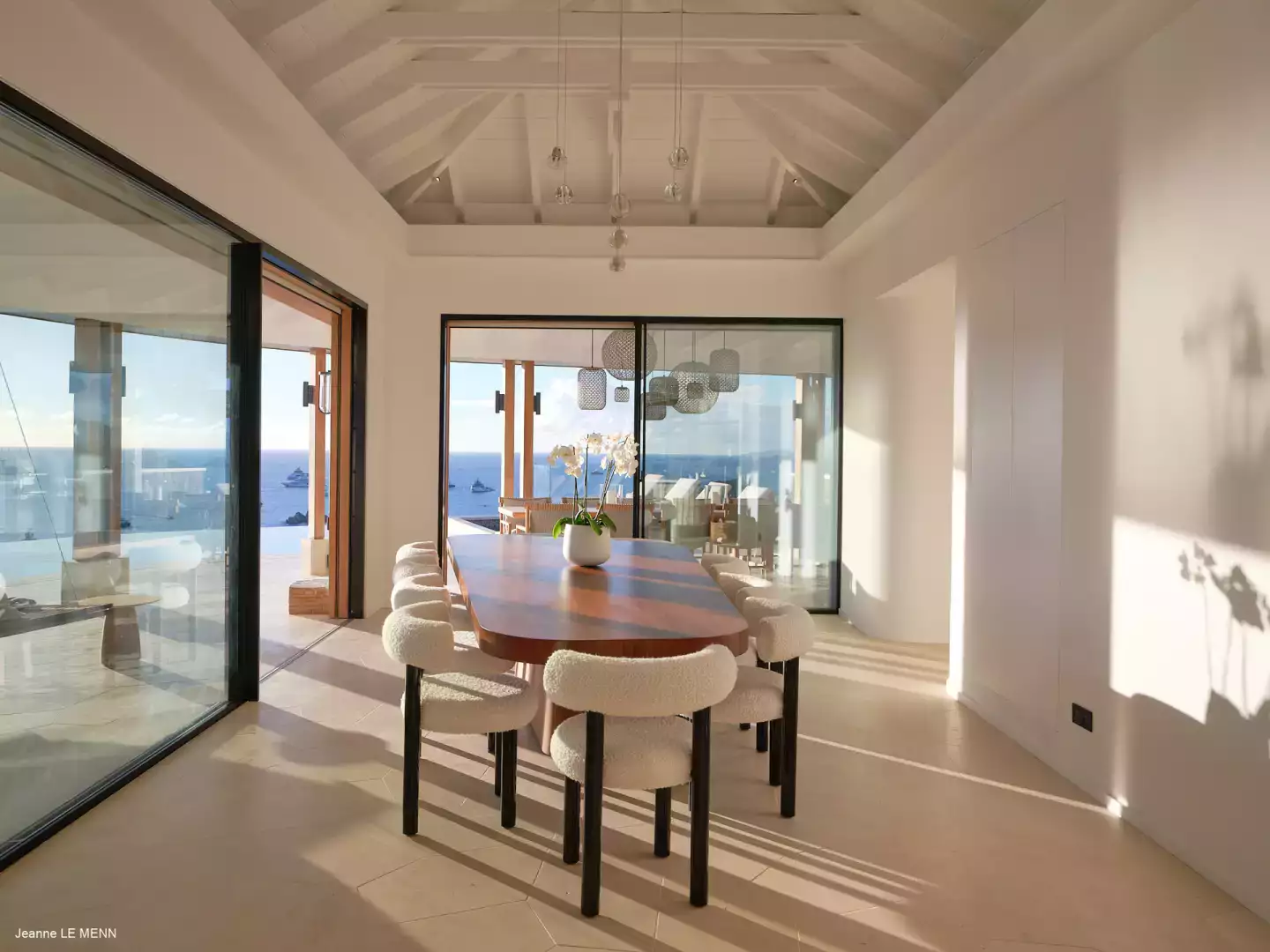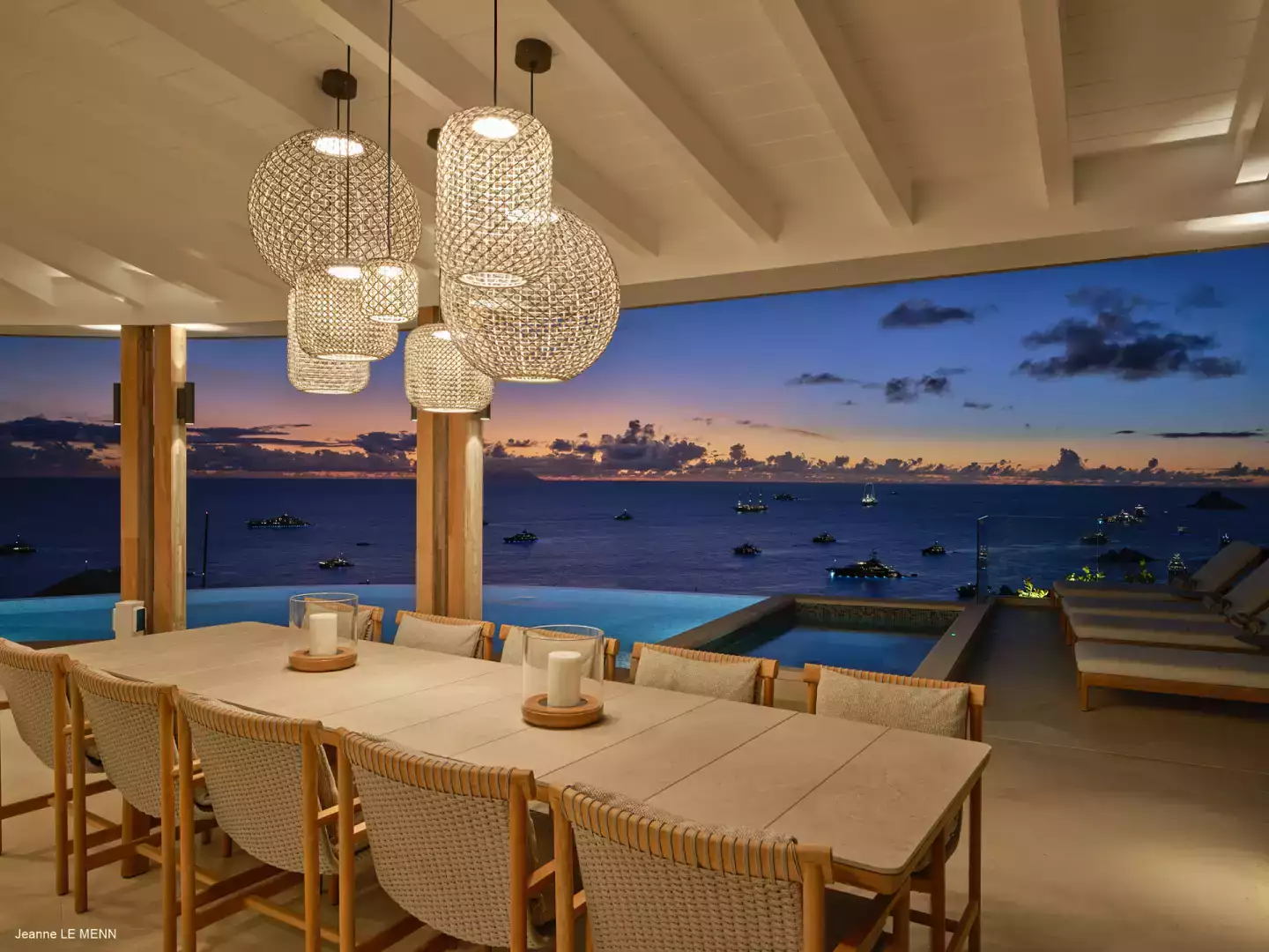 The living spaces are designed to open fully onto the outdoors, featuring an air-conditioned lounge extended by a fully equipped open kitchen, perfect for entertaining while facing the ocean. The terrace features a heated pool, a jacuzzi, and several lounge areas designed to fully enjoy the Caribbean lifestyle.