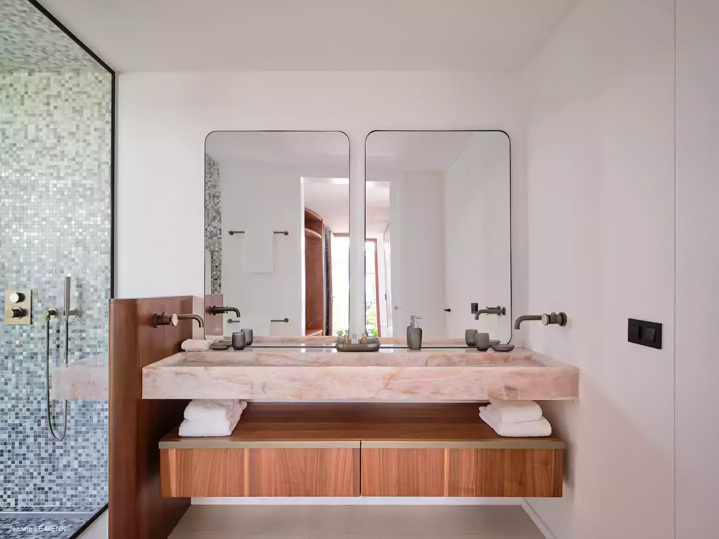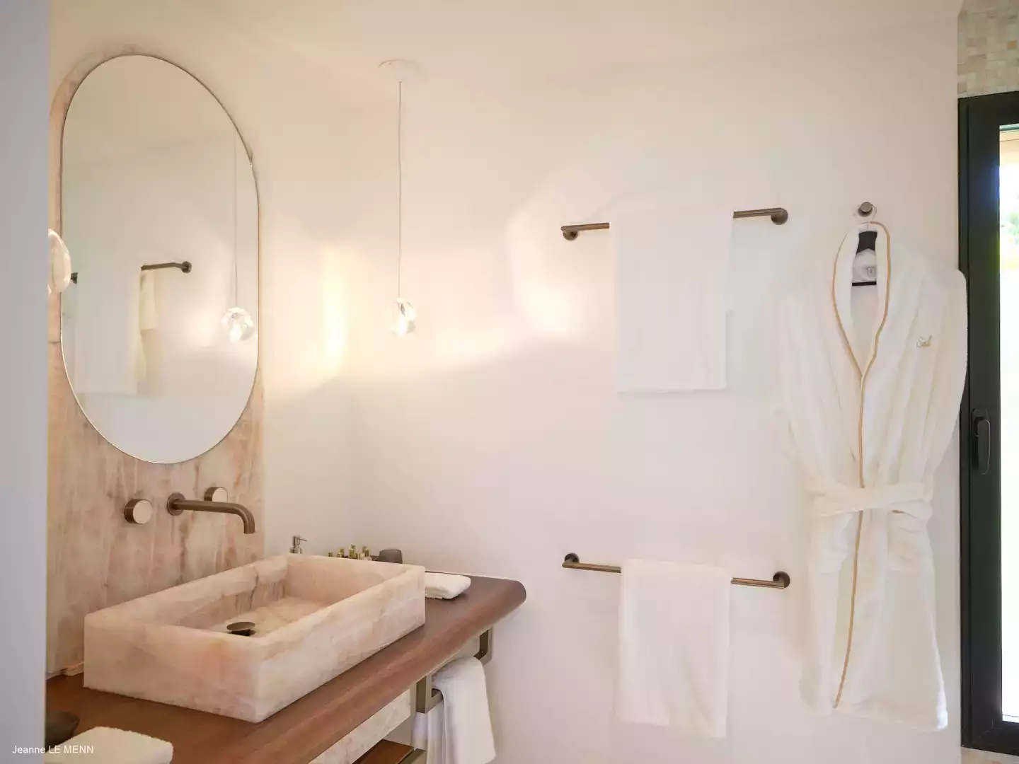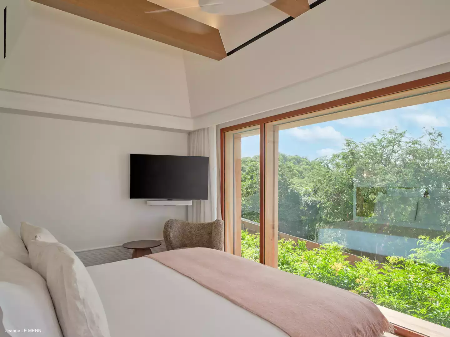 The villa offers four ocean-view bedrooms, thoughtfully spread across separate bungalows to ensure privacy and comfort. Three bedrooms are located on the lower level, each with its own en-suite bathroom, while the master suite, on the same level as the pool, offers generous volumes and high-end amenities.