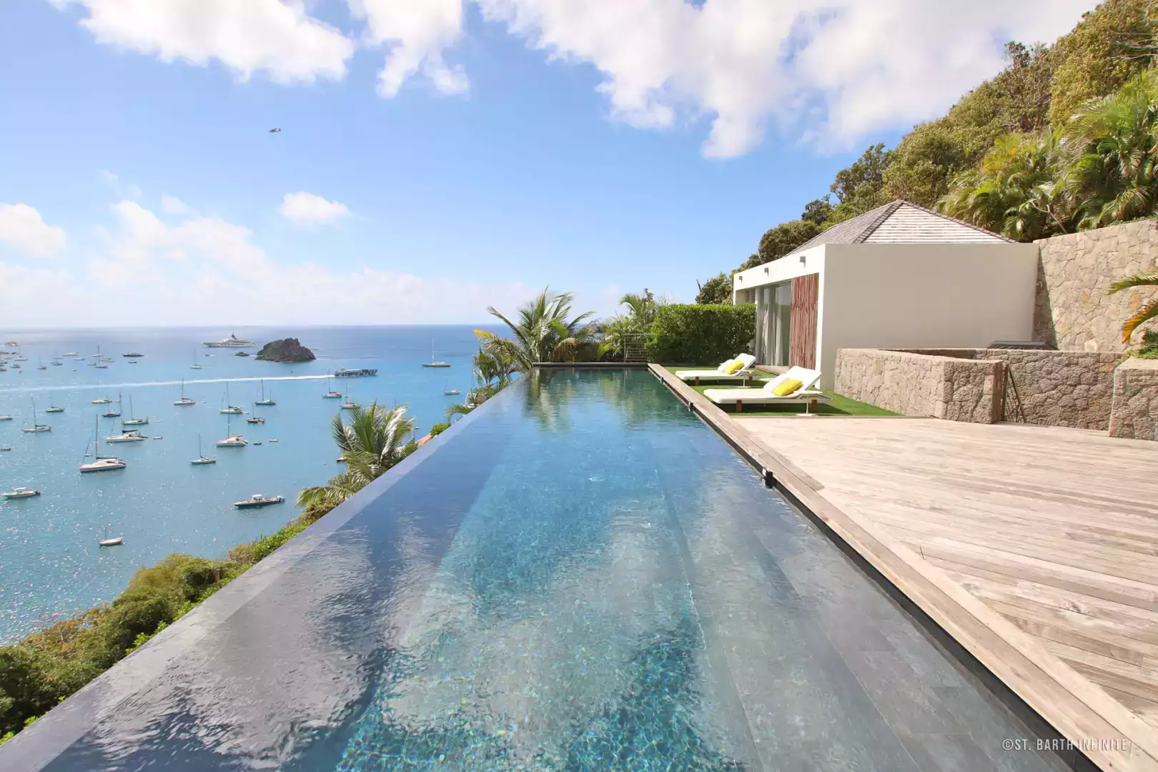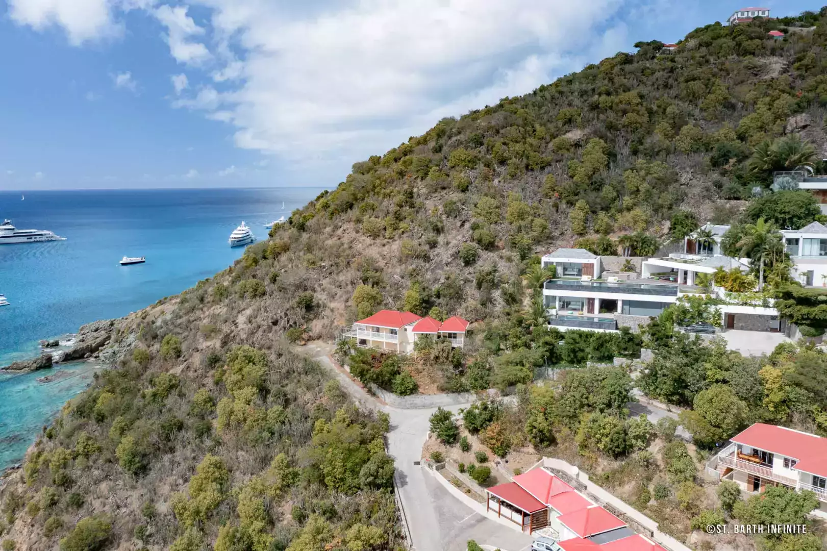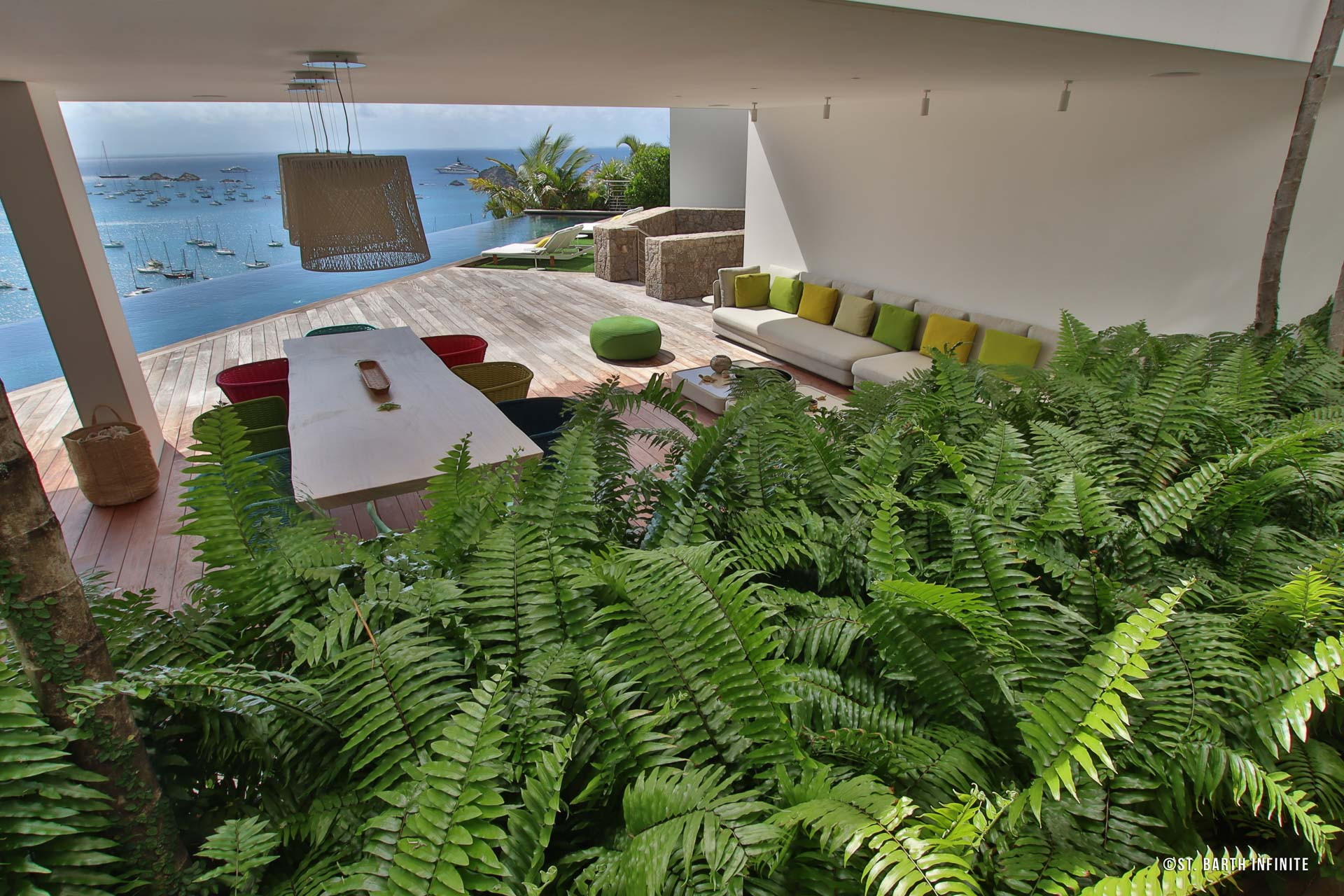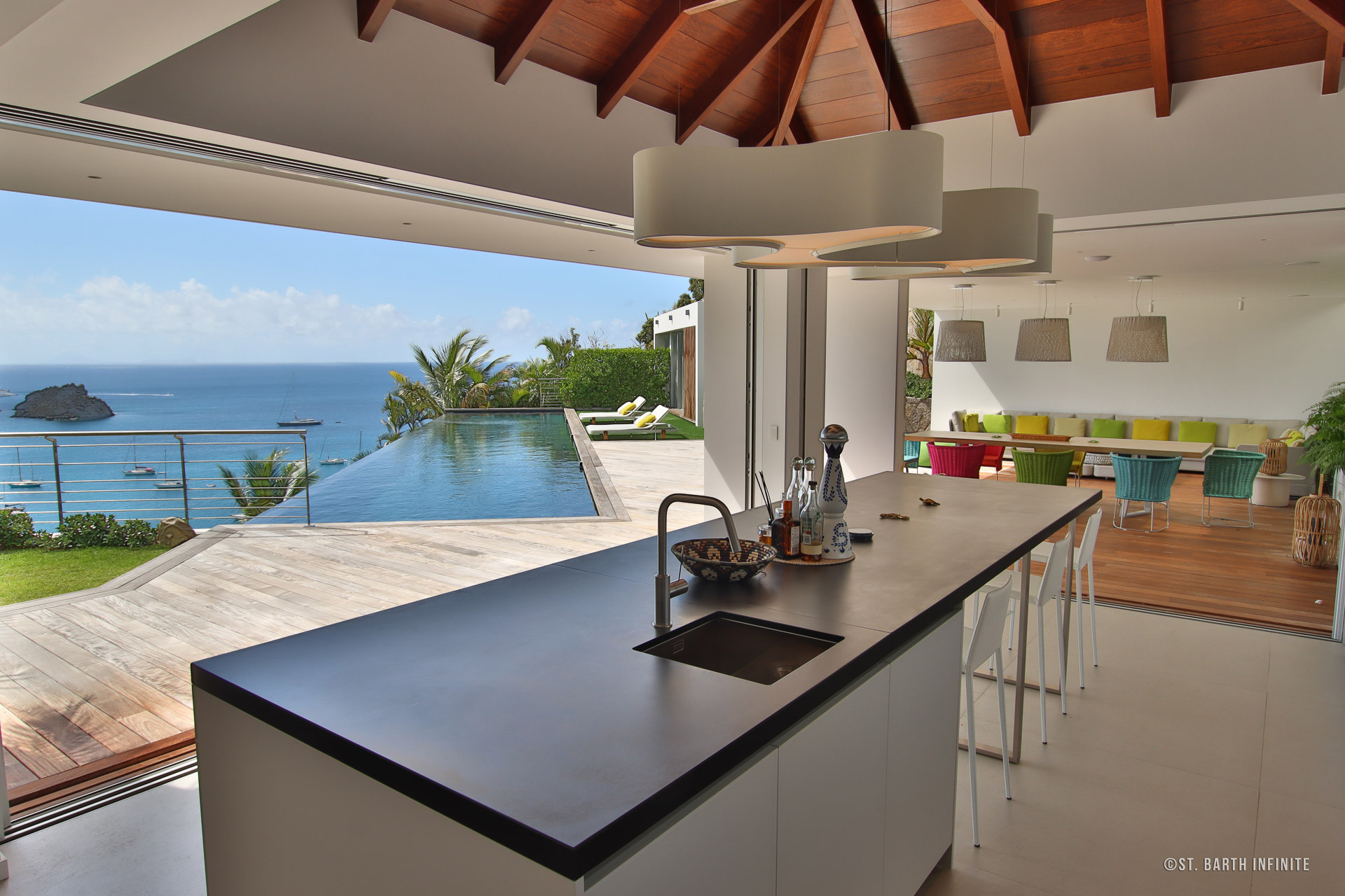 Nichée à flanc de colline à Corossol, la Villa Maison de la Luz offre une vue imprenable sur l’océan et les bateaux au mouillage. Cette propriété contemporaine séduit par son architecture en paliers, ses lignes épurées et son intégration parfaite dans la végétation luxuriante. Elle dispose de deux piscines chauffées à débordement, entourées de terrasses en bois et de coins lounge confortables, parfaits pour se détendre face au coucher de soleil.