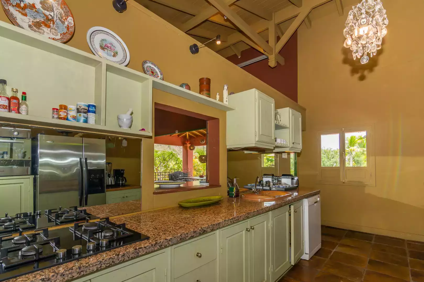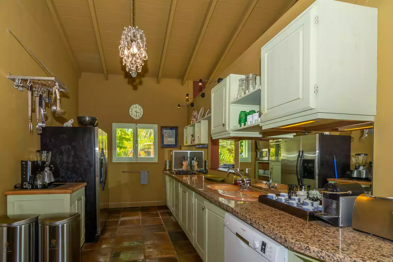 Ouverte sur le salon, réfrigérateur, congélateur, lave-vaisselle, four, four micro-ondes, cafetière, grille pain, bouilloire, presse agrumes, mixeur