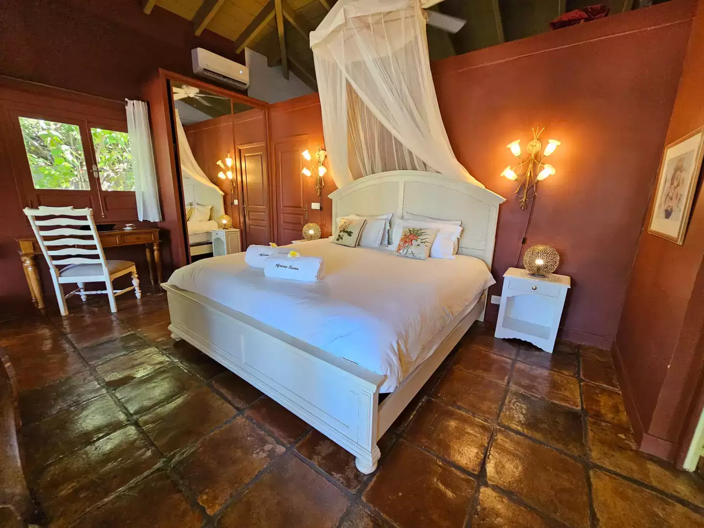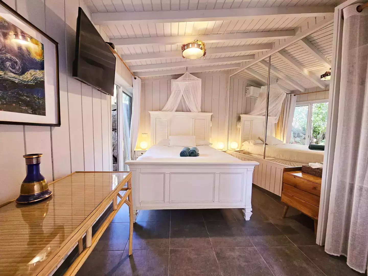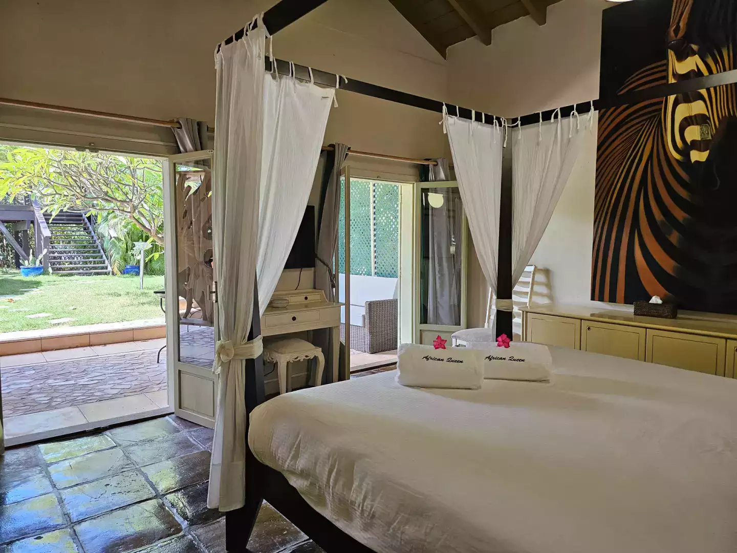 Lit Queen Size, climatisation (A/C), brasseur d'air, TV (satellite français), moustiquaires aux baies, salle de bain adjacente avec douche et toilettes, douche extérieur, sèche-cheveux, coffre fort. La chambre a une terrasse privative et une kitchenette extérieur