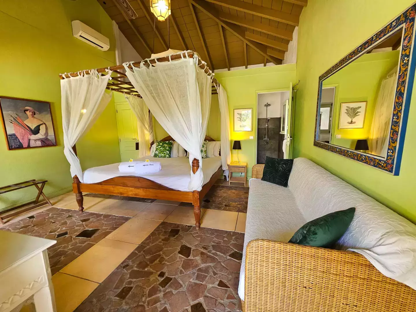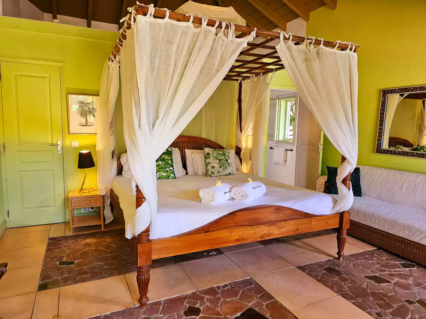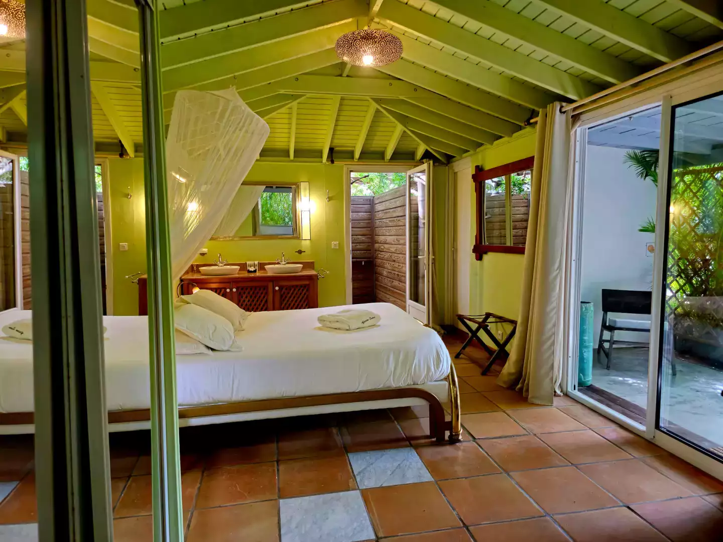 Lit Queen Size, climatisation (A/C), brasseur d'air, TV (satellite français), moustiquaires aux baies, salle de bain adjacente avec douche et toilettes, douche extérieur, sèche-cheveux, coffre fort. La chambre a une terrasse privative et une kitchenette extérieur