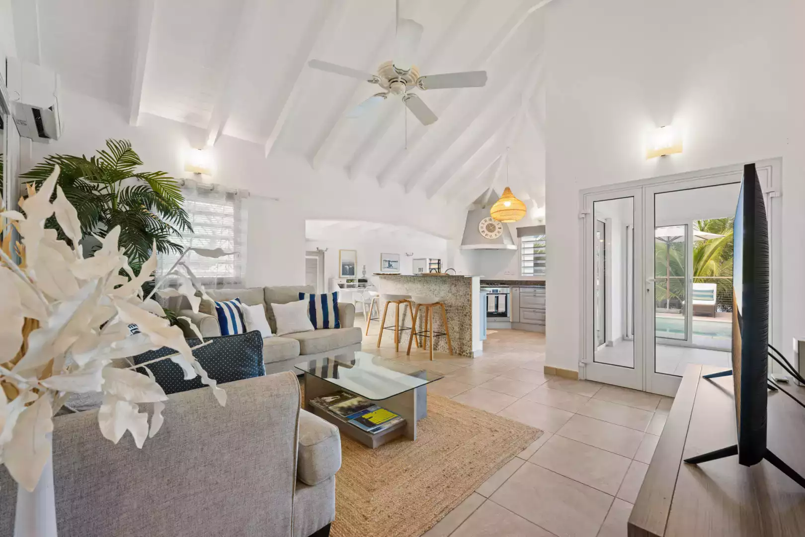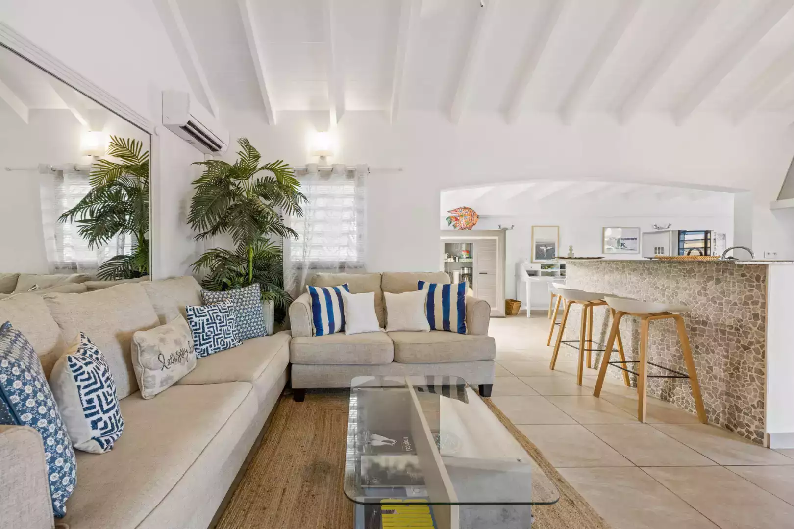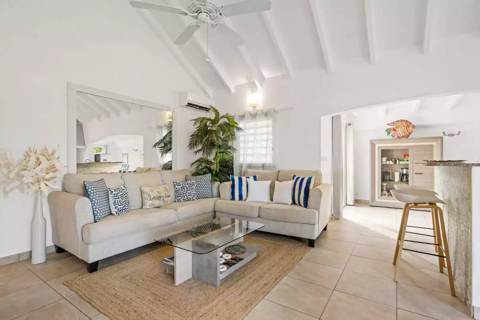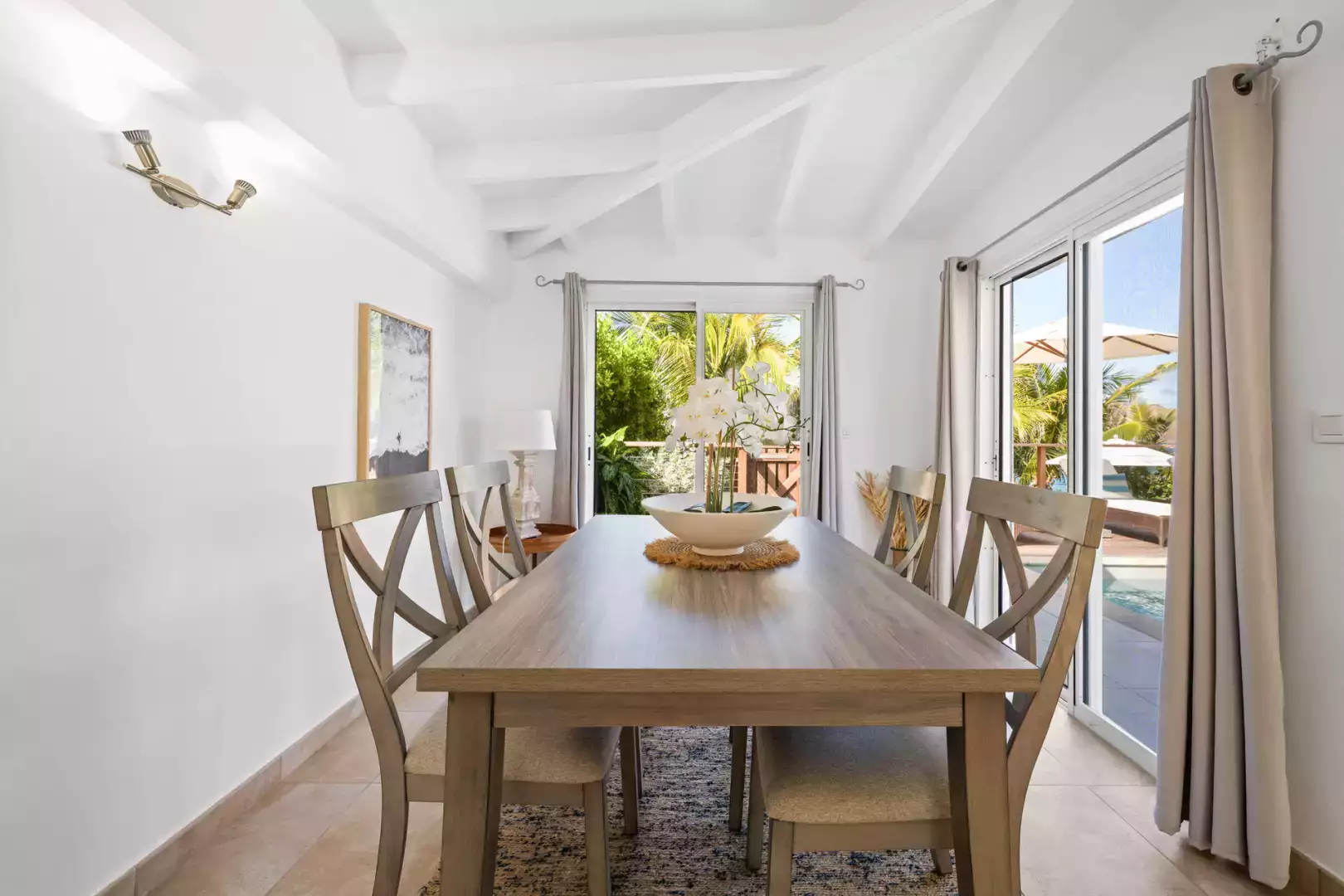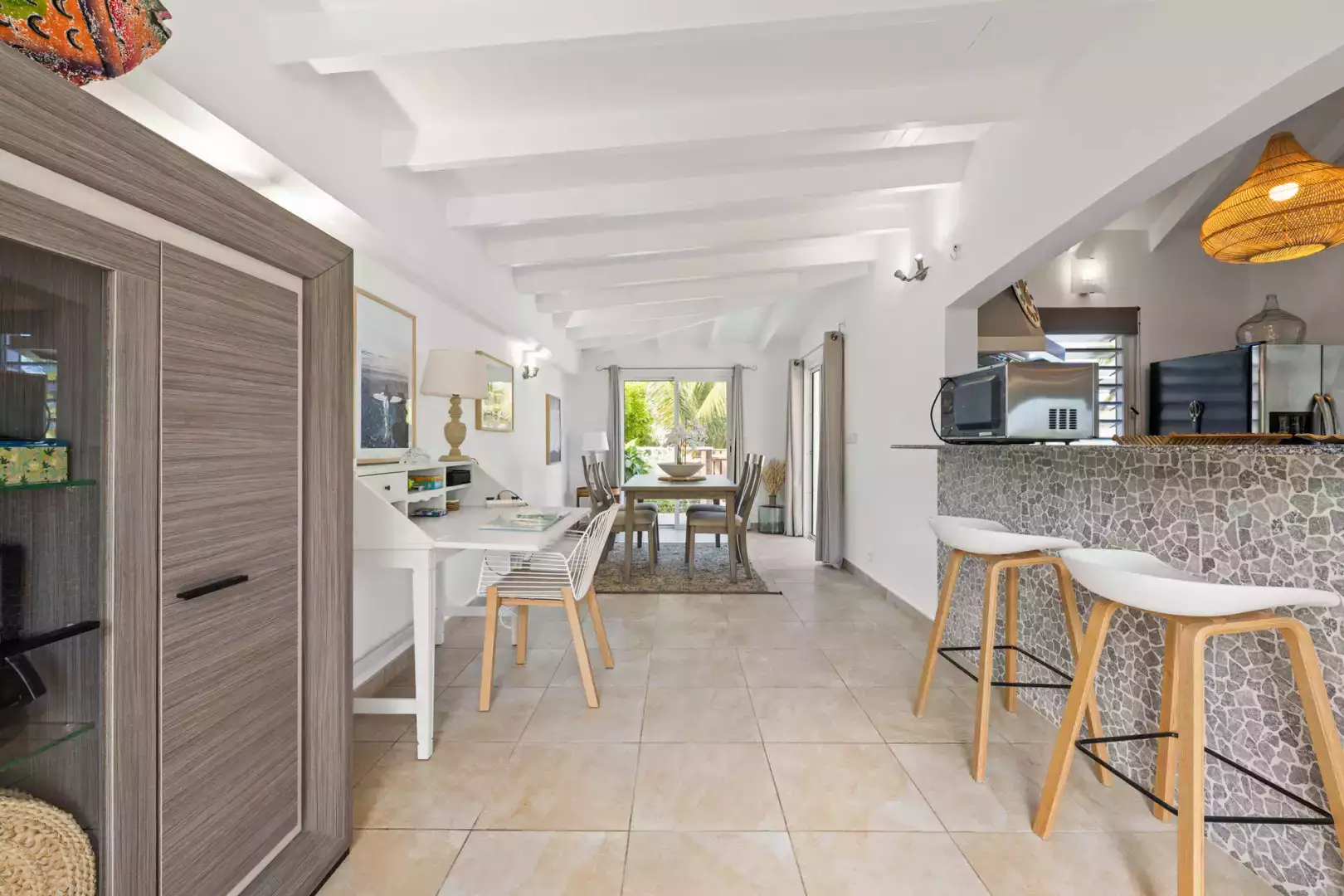 La villa comprend deux chambres climatisées, chacune avec ventilateur au plafond et lit king size (dont une transformable en lits jumeaux), partageant une salle de bain pratique. Le salon, lumineux et confortable, est équipé de la télévision satellite française et américaine. La salle à manger attenante, installée dans une pièce séparée pouvant s’ouvrir entièrement sur l’extérieur, permet de savourer les repas tout en profitant de l’air marin.