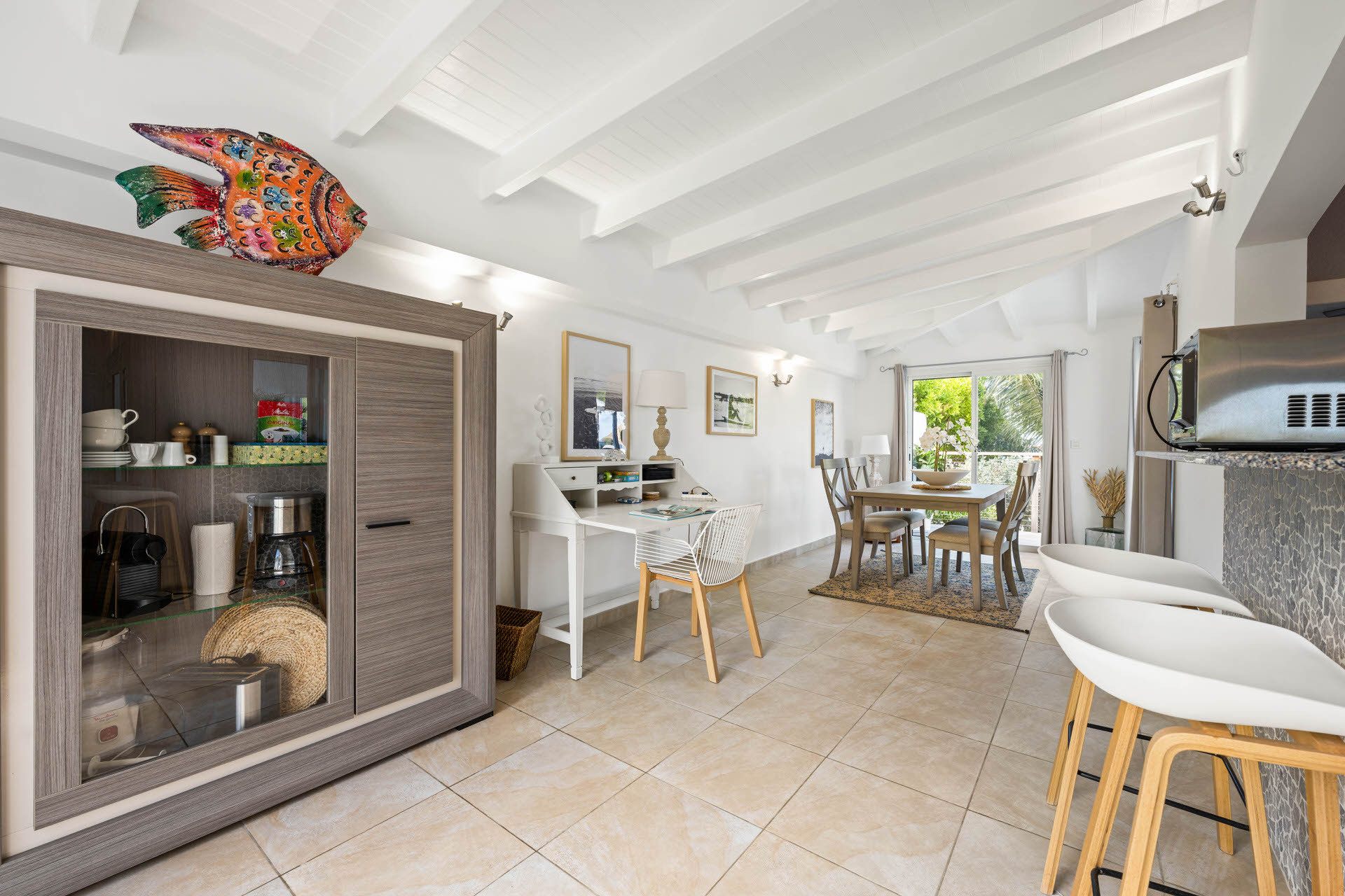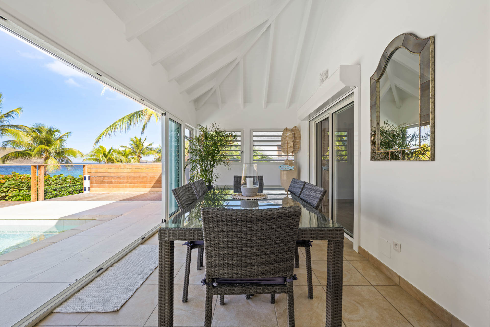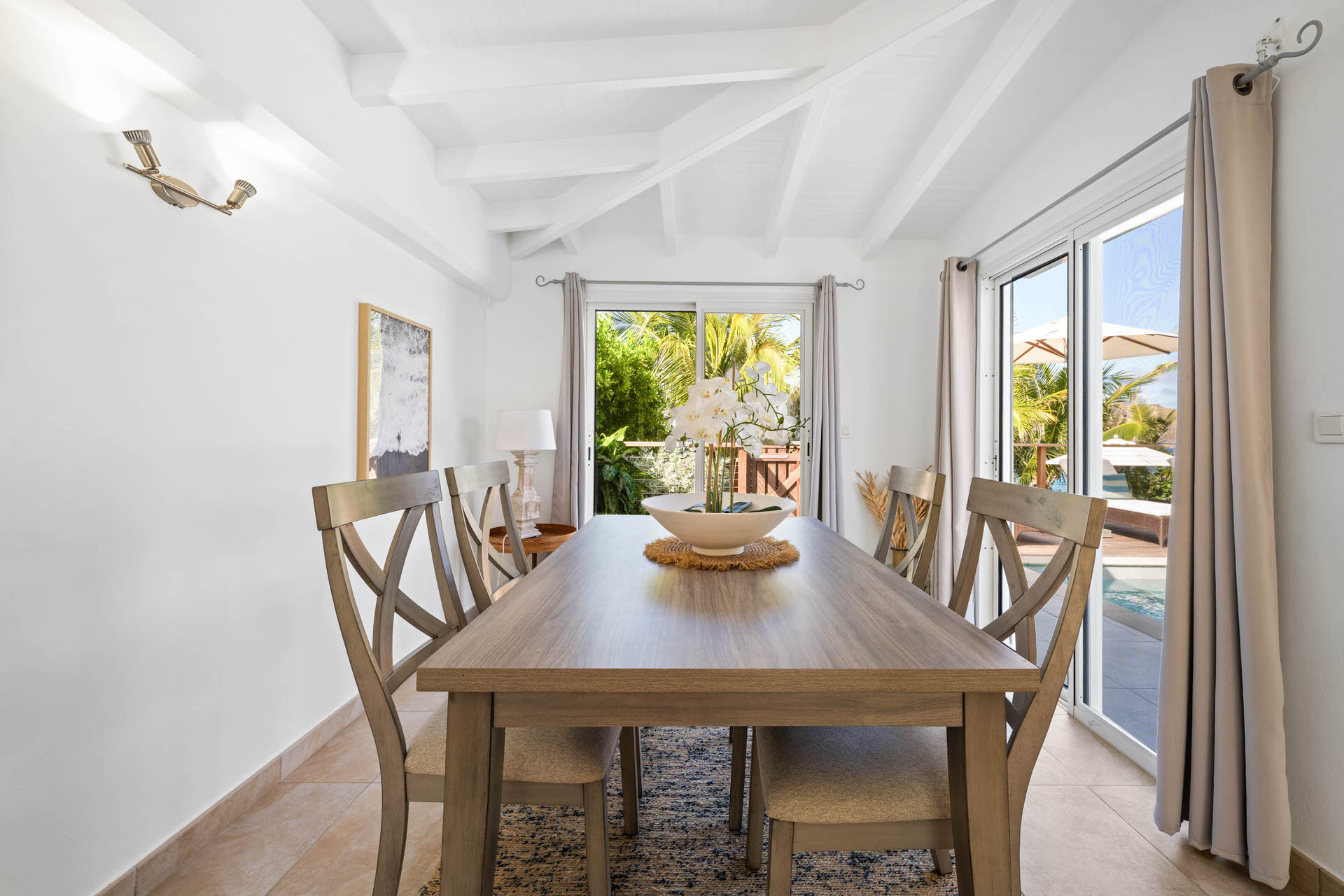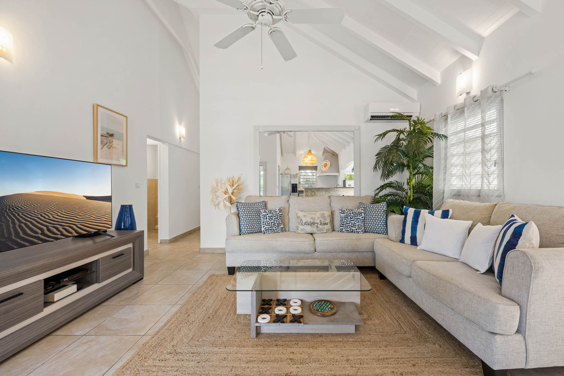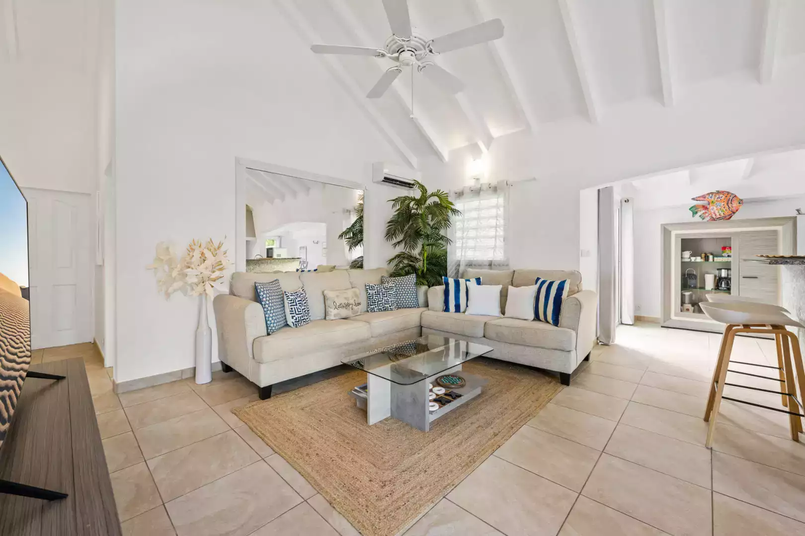 La villa comprend deux chambres climatisées, chacune avec ventilateur au plafond et lit king size (dont une transformable en lits jumeaux), partageant une salle de bain pratique. Le salon, lumineux et confortable, est équipé de la télévision satellite française et américaine. La salle à manger attenante, installée dans une pièce séparée pouvant s’ouvrir entièrement sur l’extérieur, permet de savourer les repas tout en profitant de l’air marin.